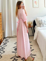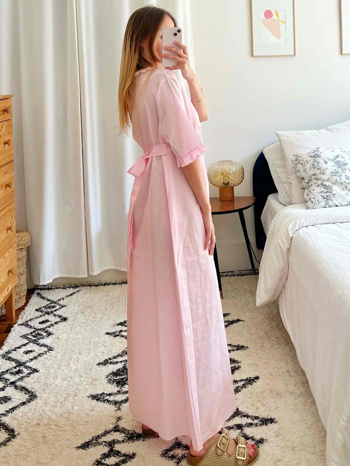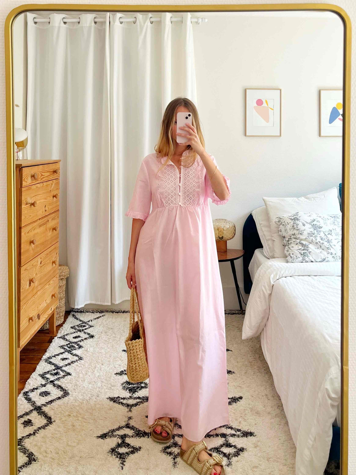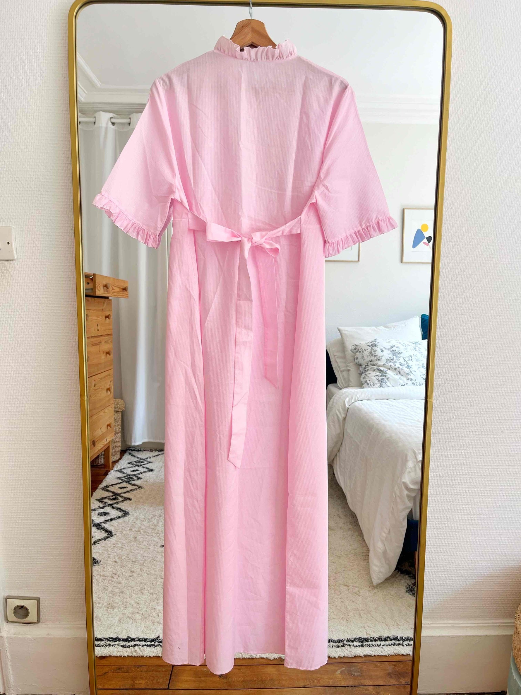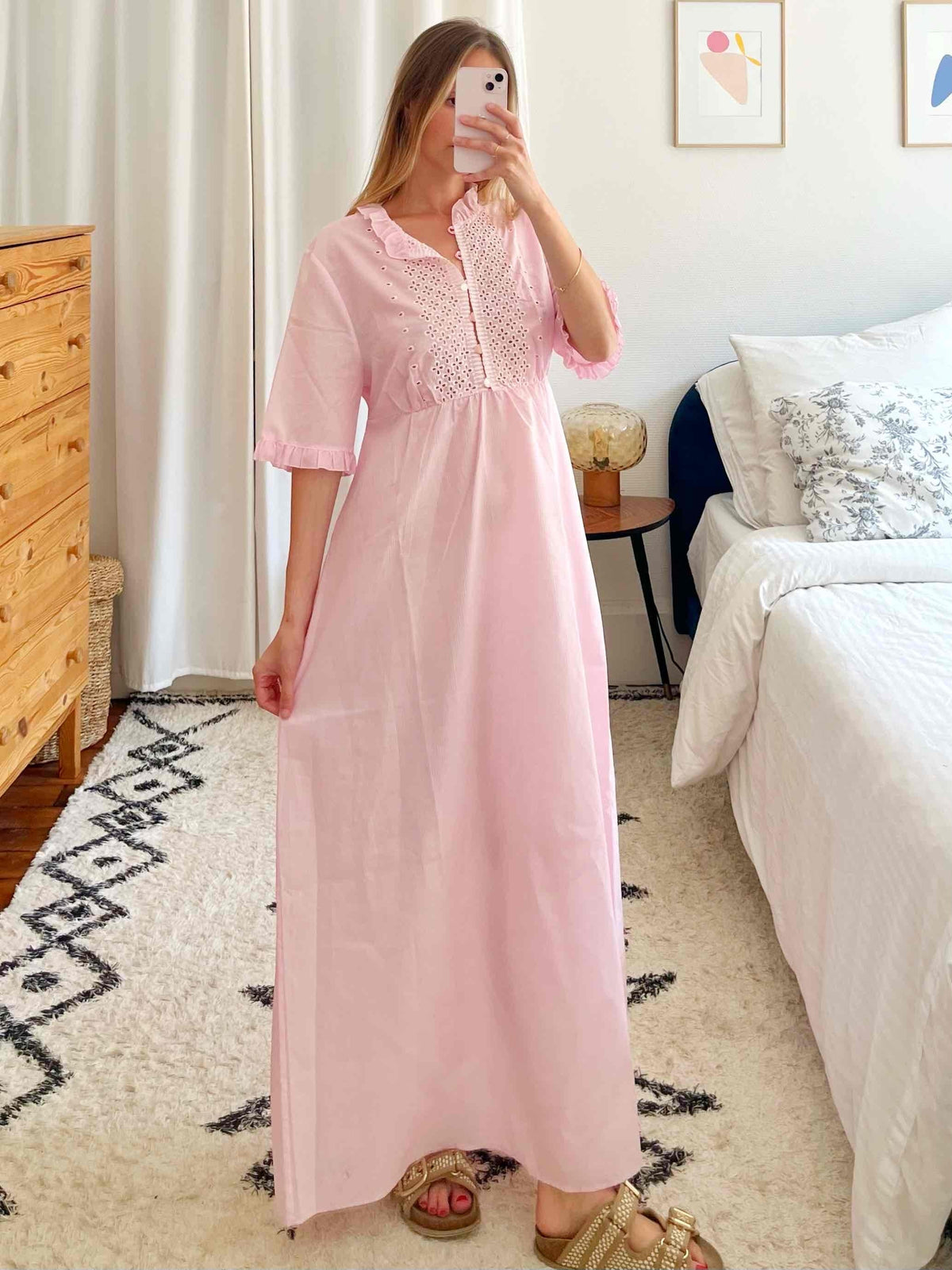 Prix unitaire parRobe longue, jolis détails en dentelle, volants et petits boutons, manches trois-quart, noeud dans le dos, tissu légèrement transparent donc à porter avec un dessous de robe ou en tant que robe de plage. Fabriquée en Italie et chinée à Rome. Portée ici sur une T36 pour 1m64.