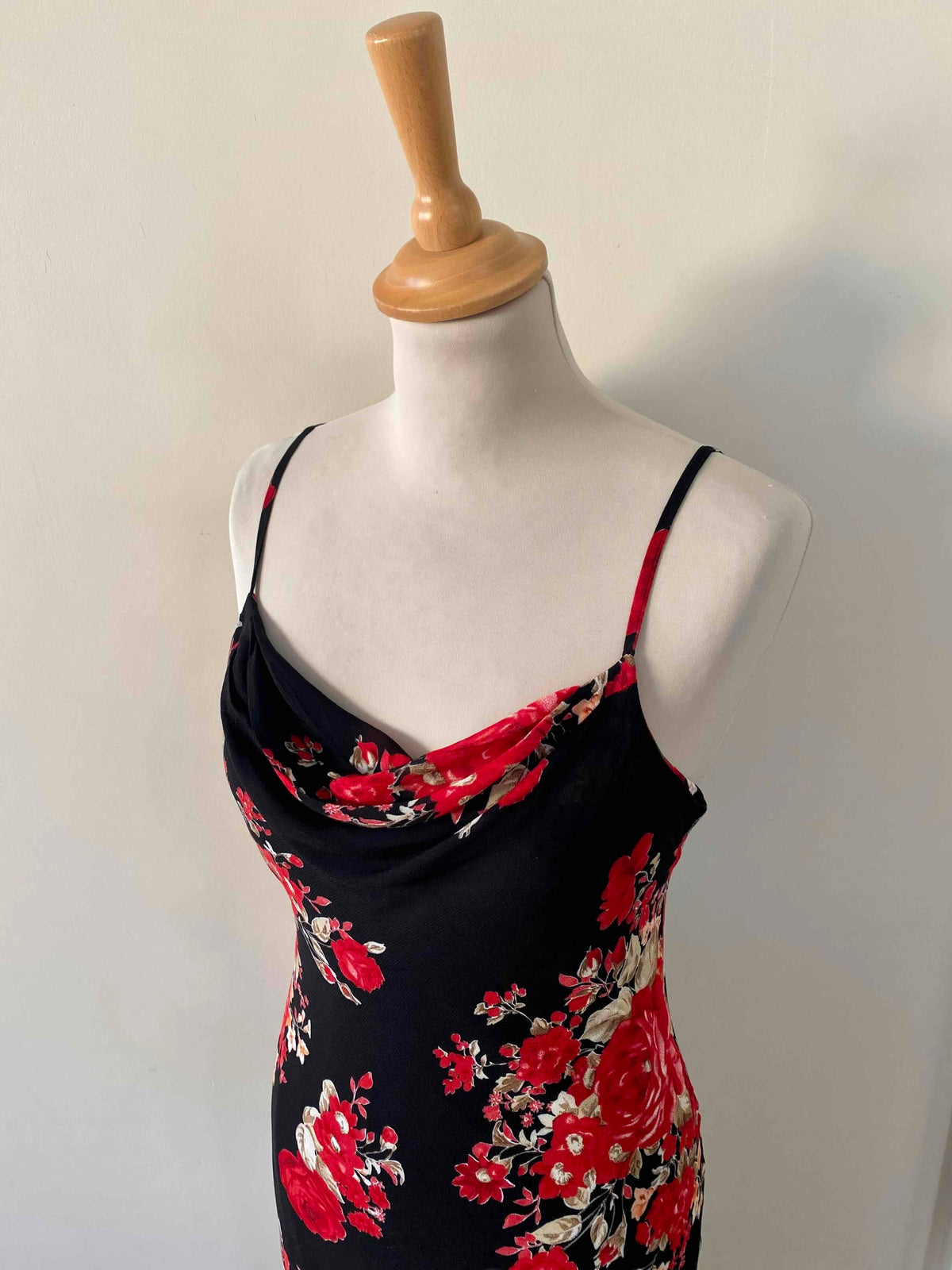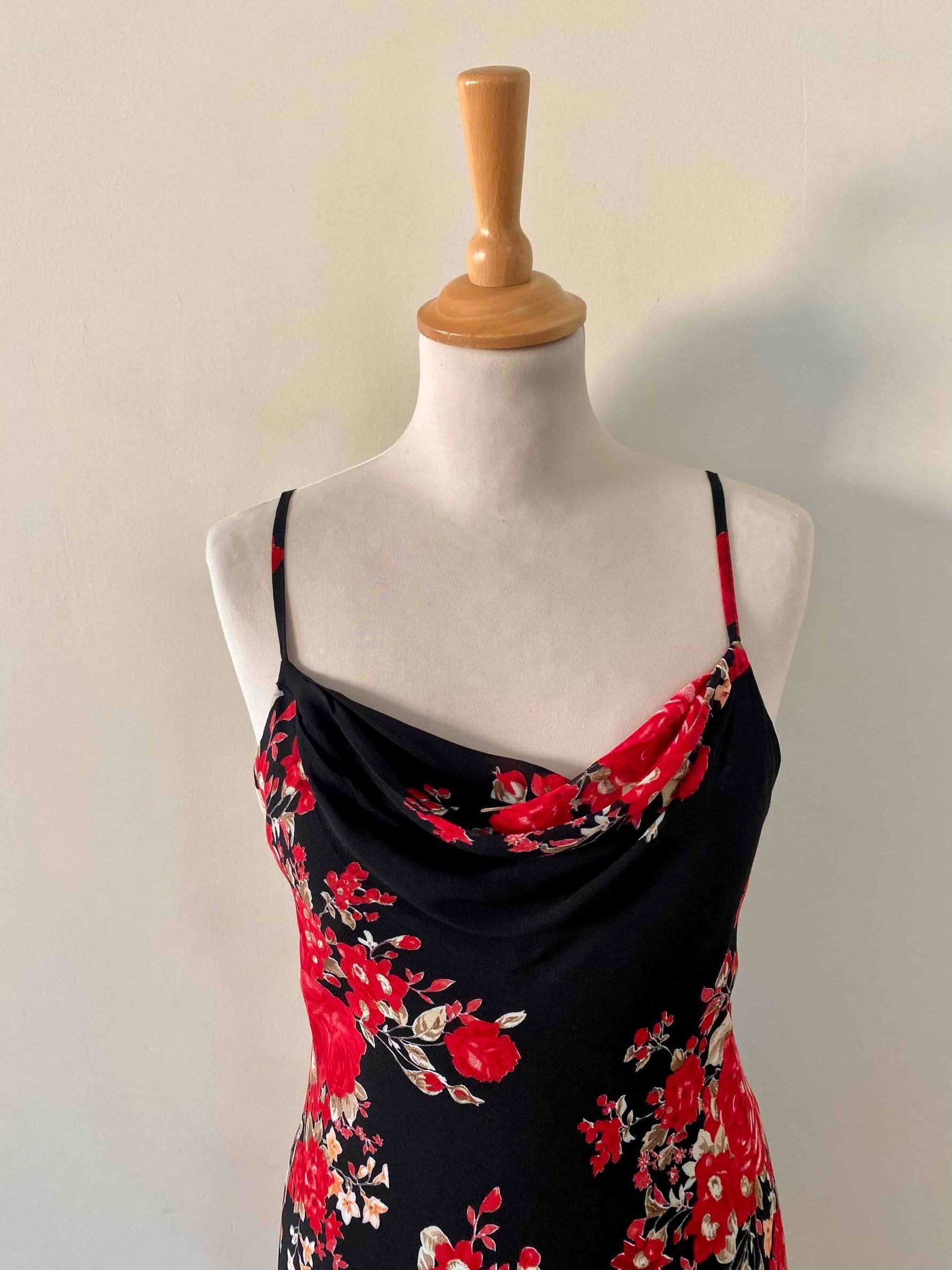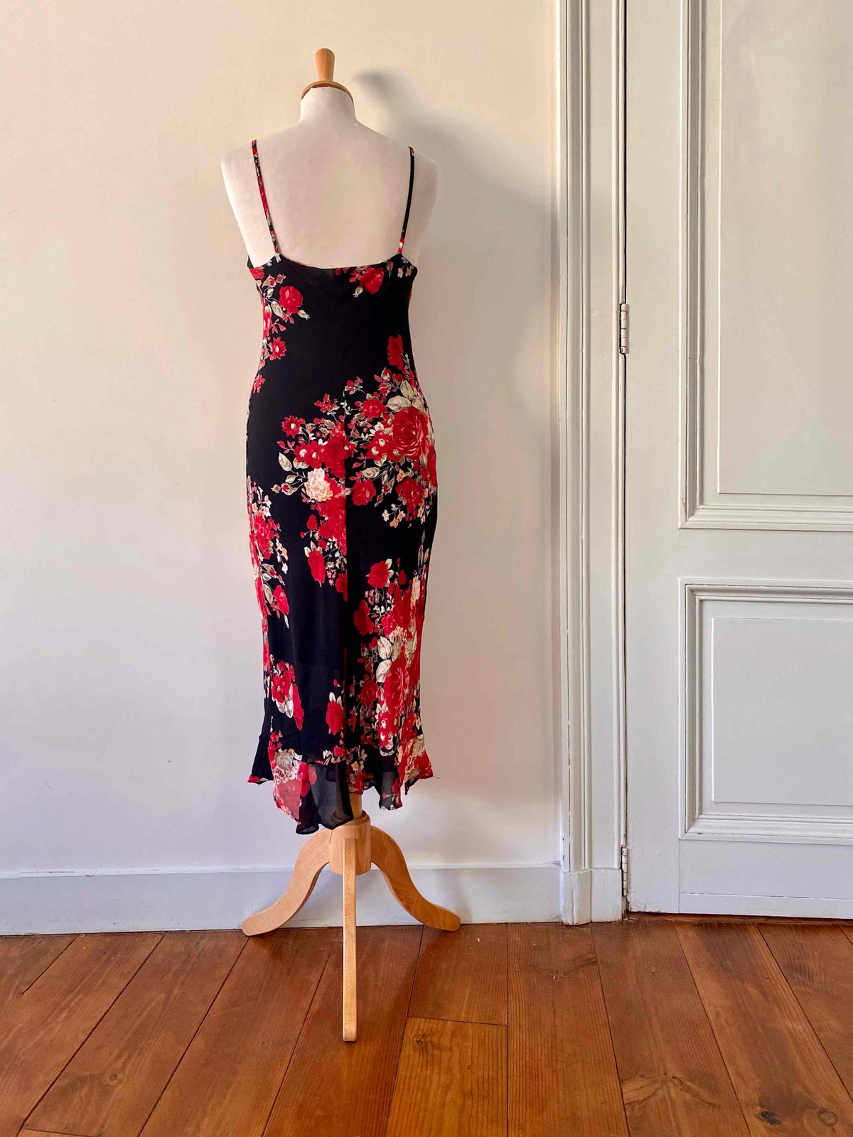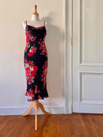 Prix unitaire parRobe midi à fleurs en voile viscose doublée noire imprimée grandes fleurs rouges, oranges et vertes, bretelles spaghettis, encolure benitier drappée, forme fit and flare en biais, fabriquée en France, taille 36 portée ici sur un mannequin T36, aisselles 43cm.