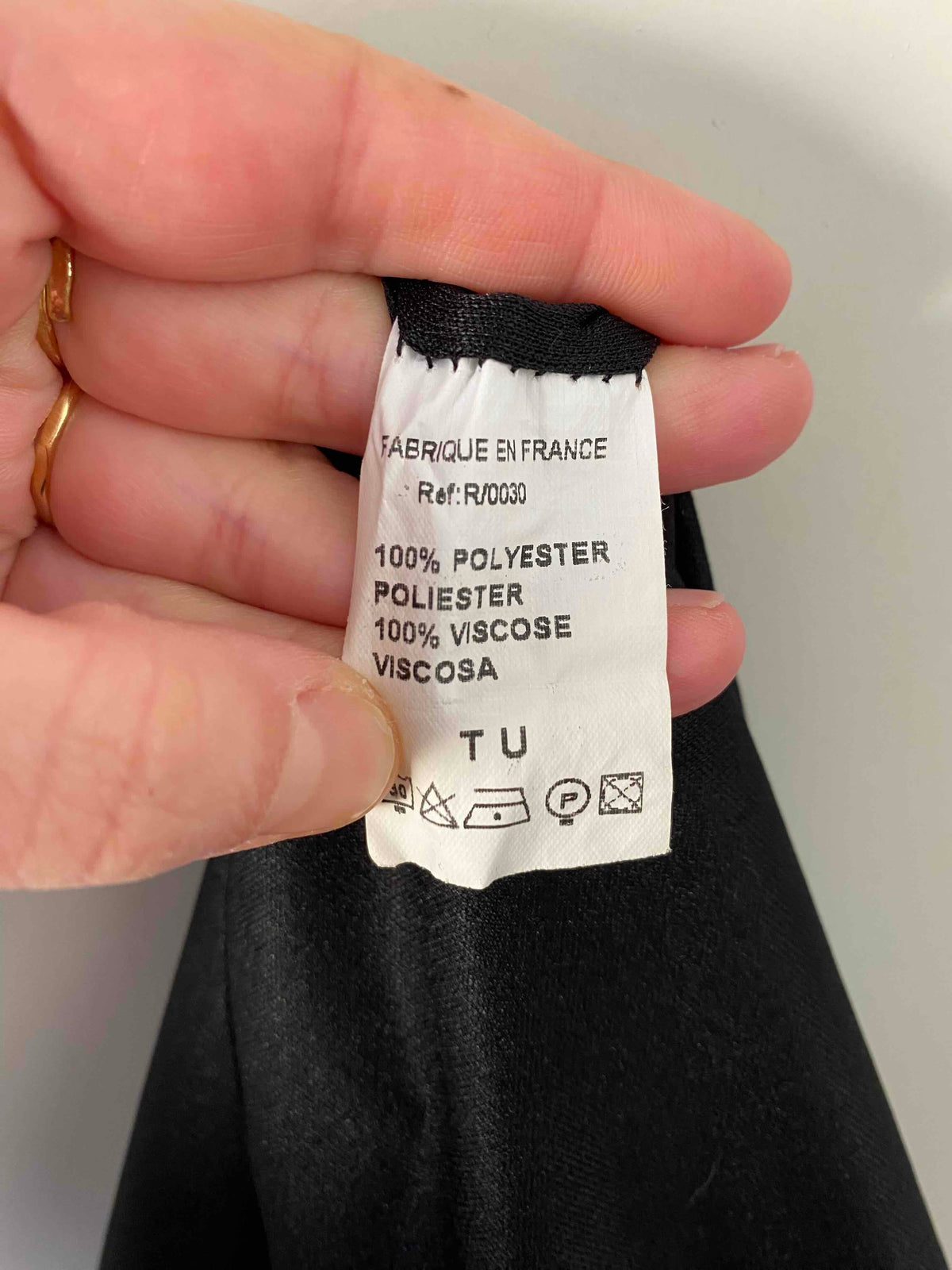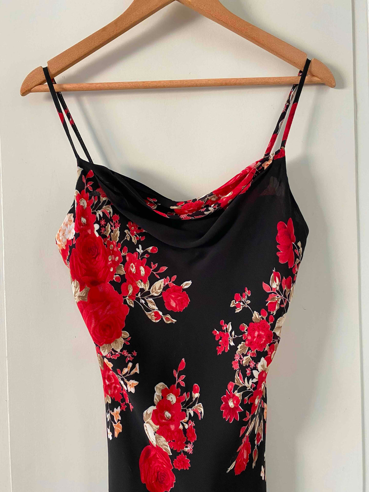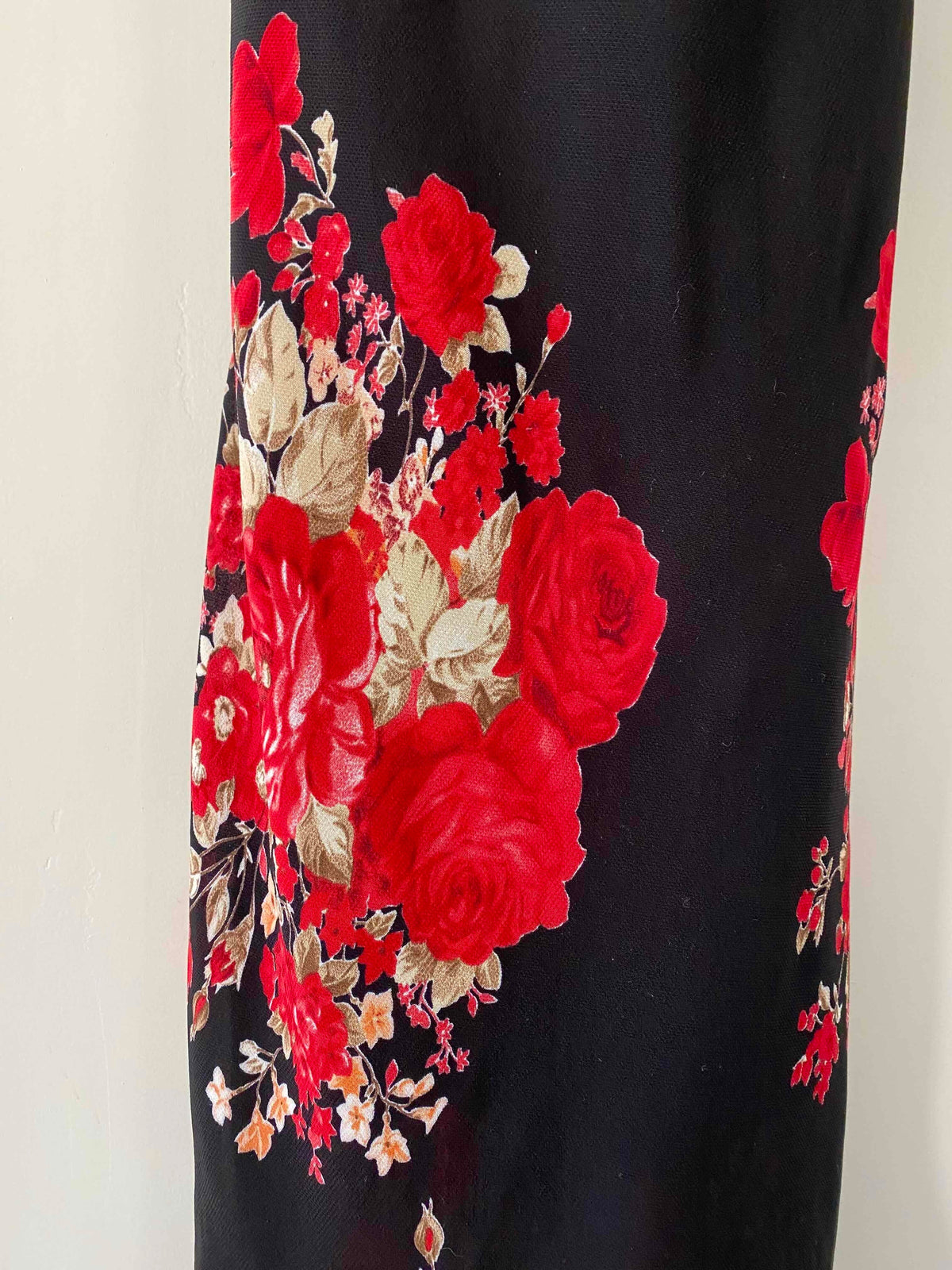 Prix unitaire parRobe midi à fleurs en voile viscose doublée noire imprimée grandes fleurs rouges, oranges et vertes, bretelles spaghettis, encolure benitier drappée, forme fit and flare en biais, fabriquée en France, taille 36 portée ici sur un mannequin T36, aisselles 43cm.