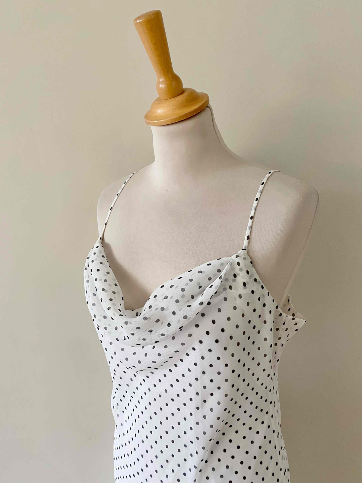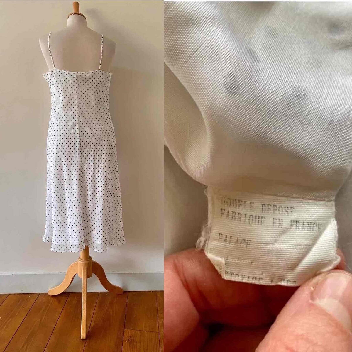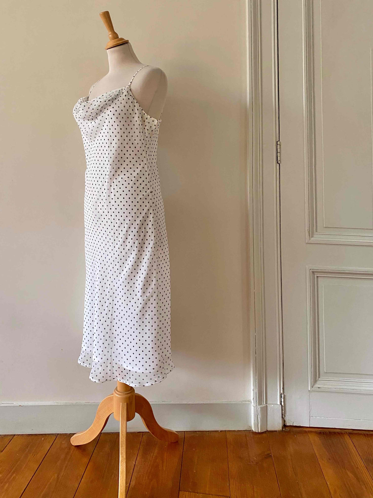 Prix unitaire parRobe midi à pois en voile doublé blanc imprimée pois noirs, encolure benitier drappée, fines bretelles, forme fit and flare en biais, fabriquée en France, taille 38 portée ici sur un mannequin T36.
