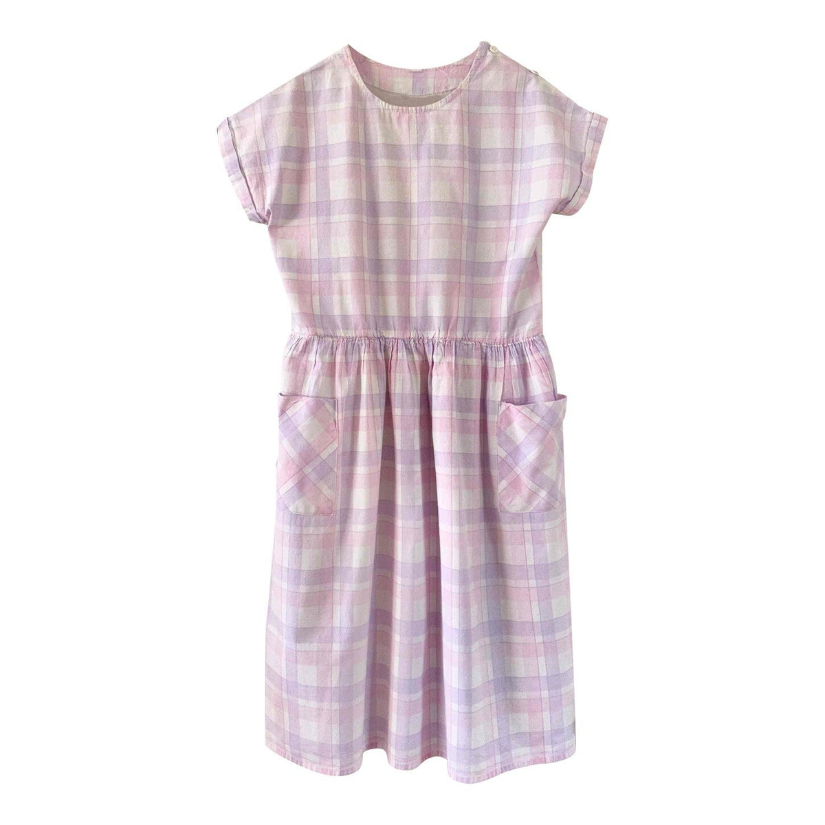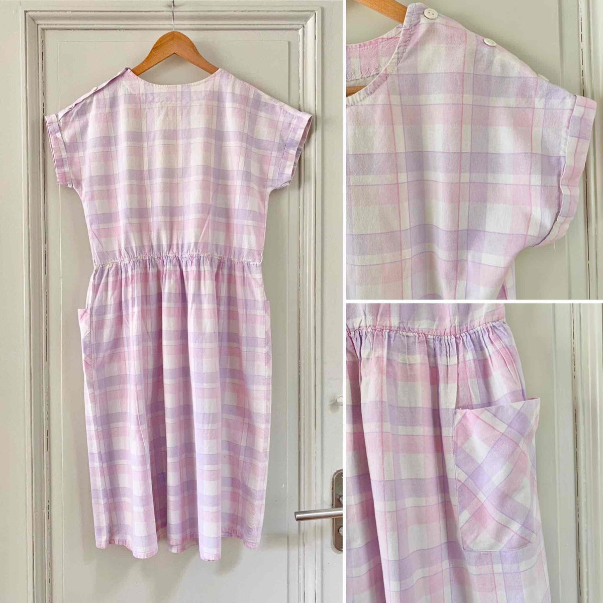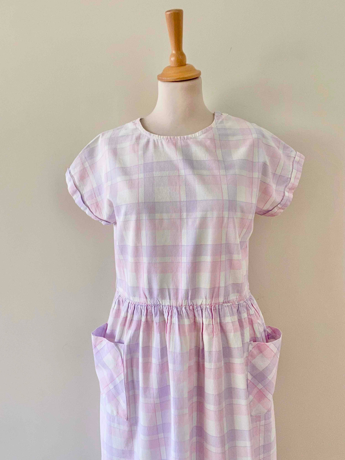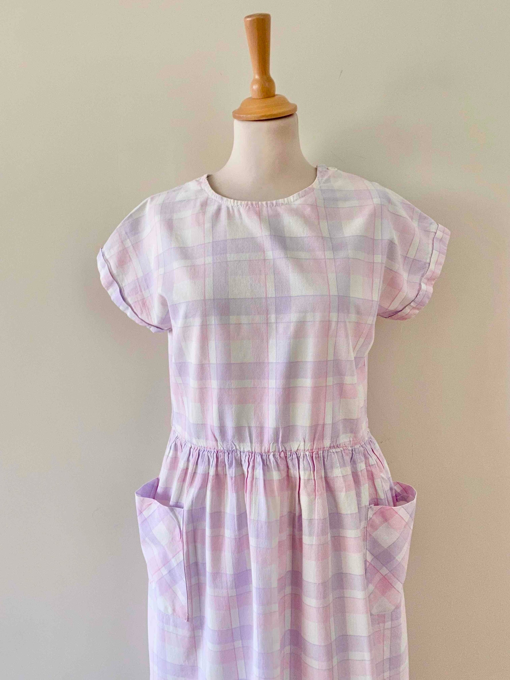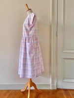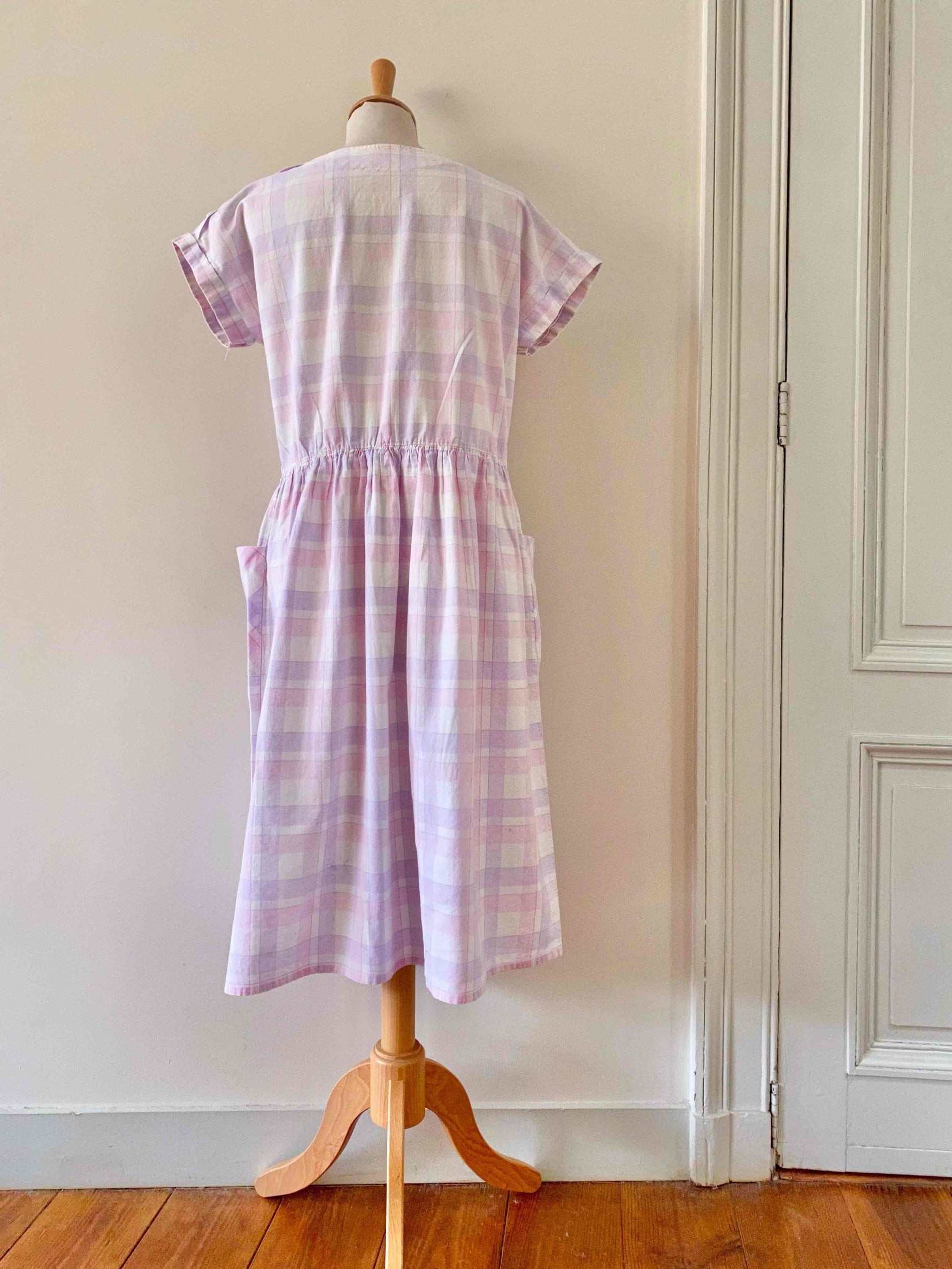 Prix unitaire parRobe midi en 100% coton, carreaux pastels roses et lilas fond blanc, boutons sur une épaule, manches courtes chauve-souris, forme babydoll, fabriquée en France, années 60’s, se porte du 36 au 40, portée ici sur un mannequin T36.