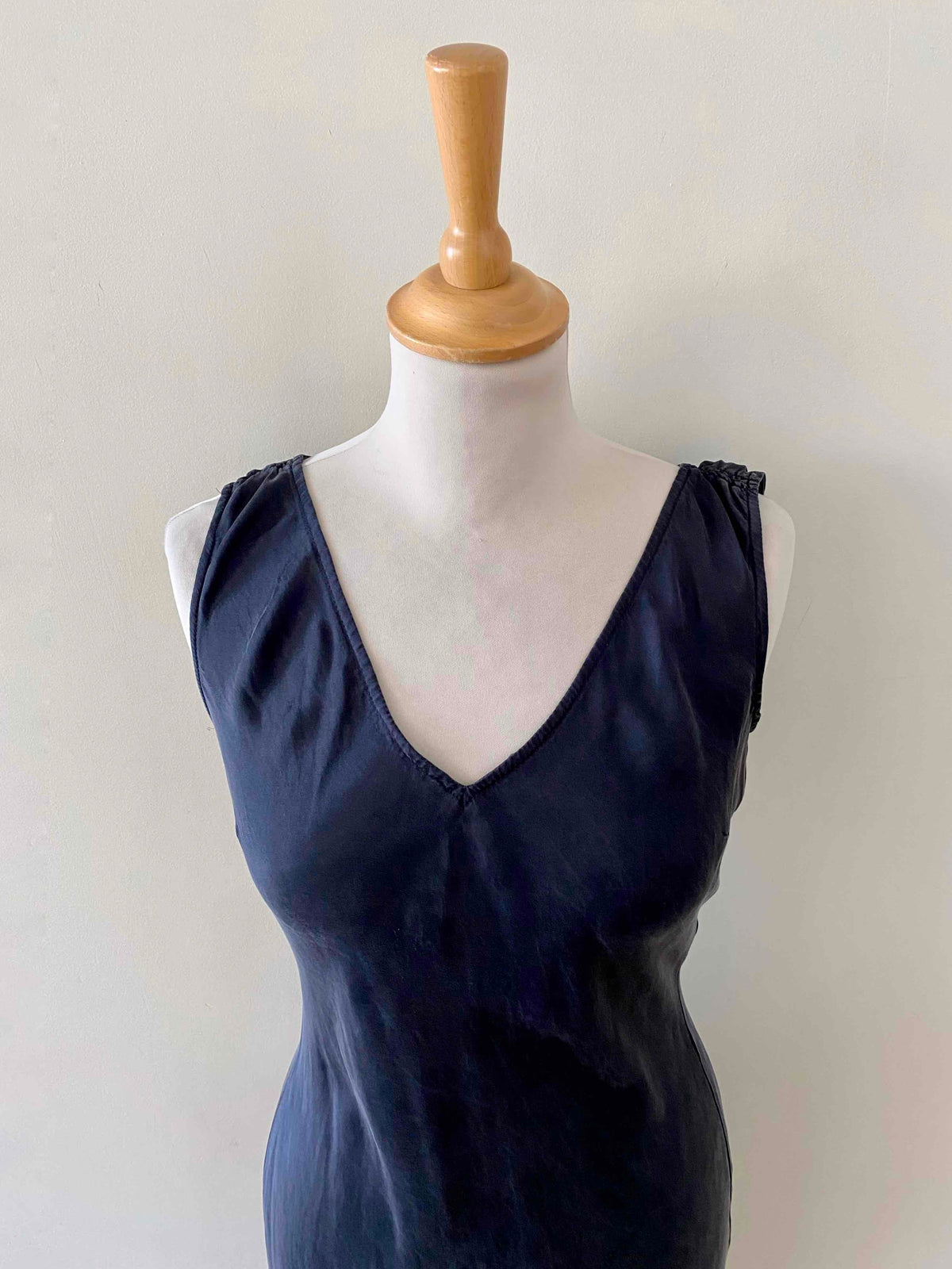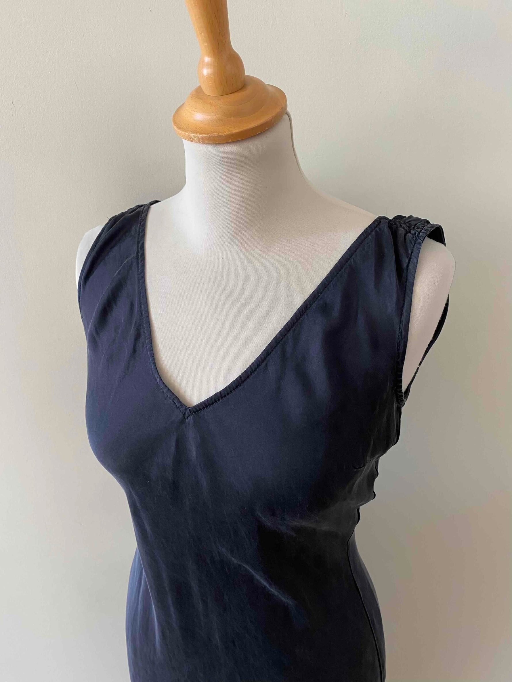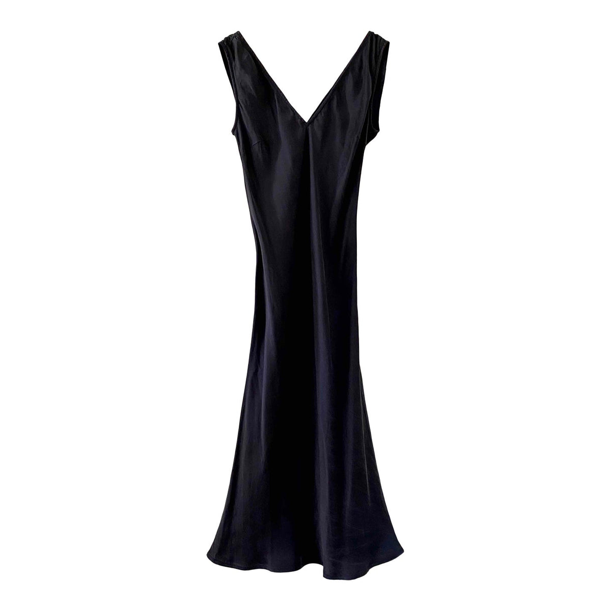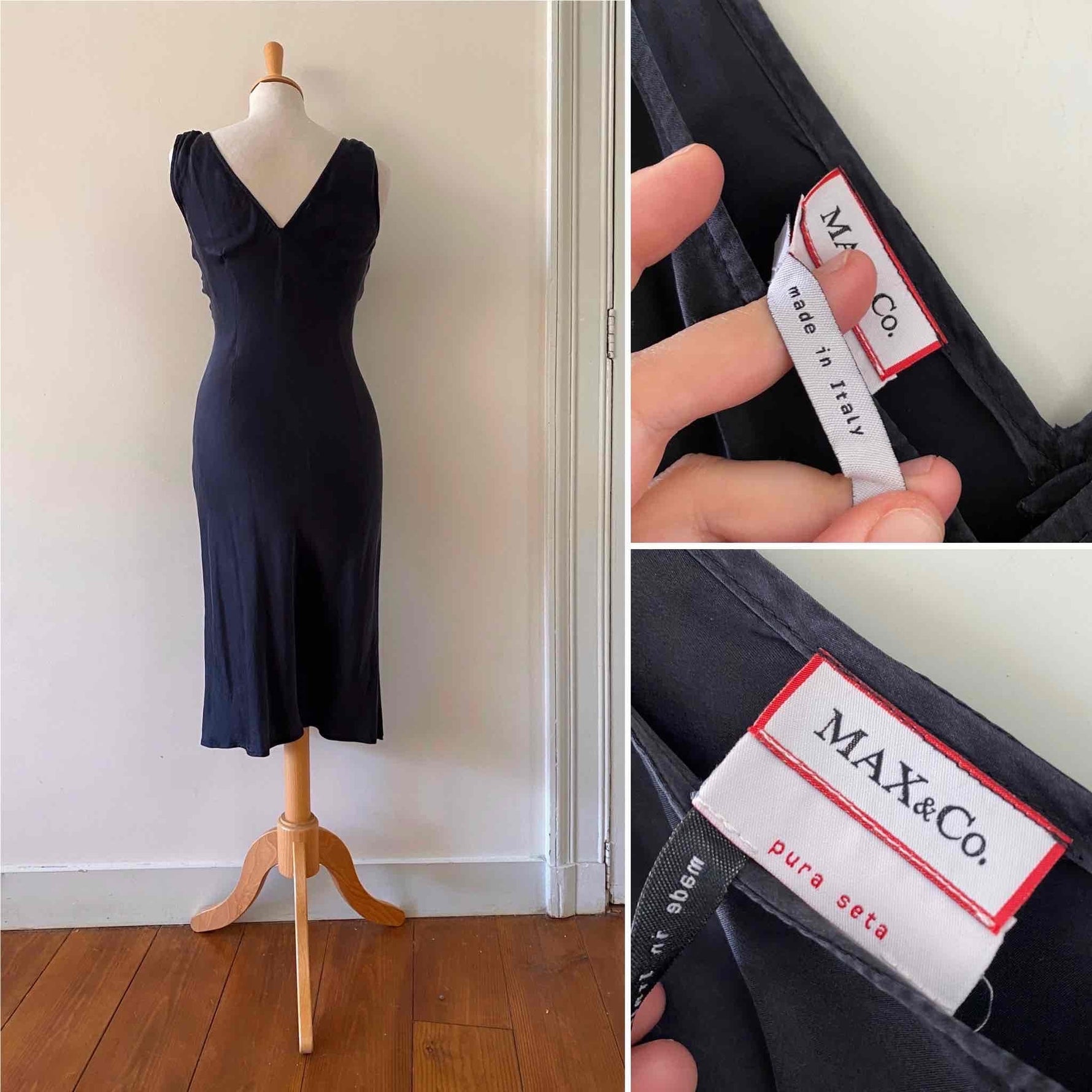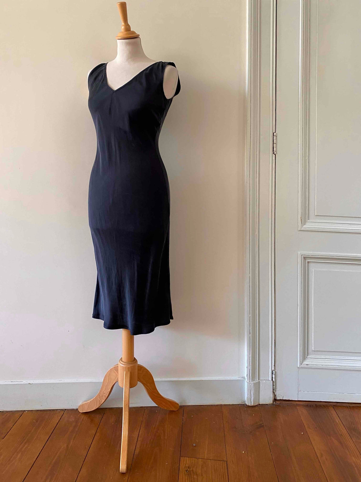 Prix unitaire parRobe midi en soie lavée noire, encolure V devant et dos, forme fit and flare en biais, fabriquée en Italie, taille 34 et 36 portée ici sur un mannequin T36, aisselles 43cm.