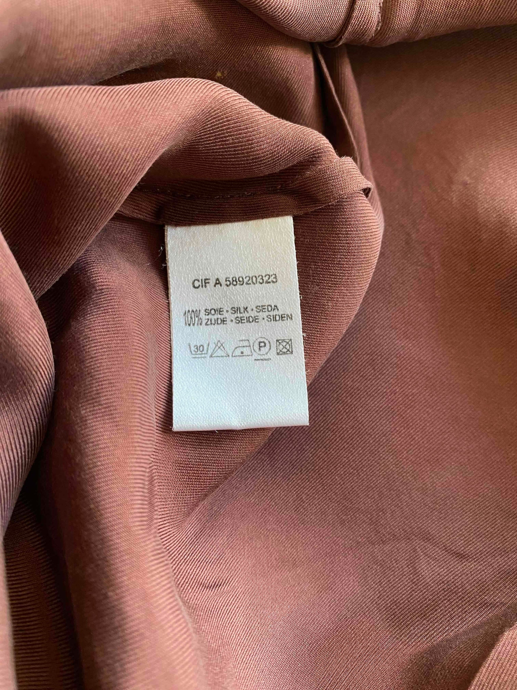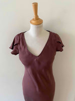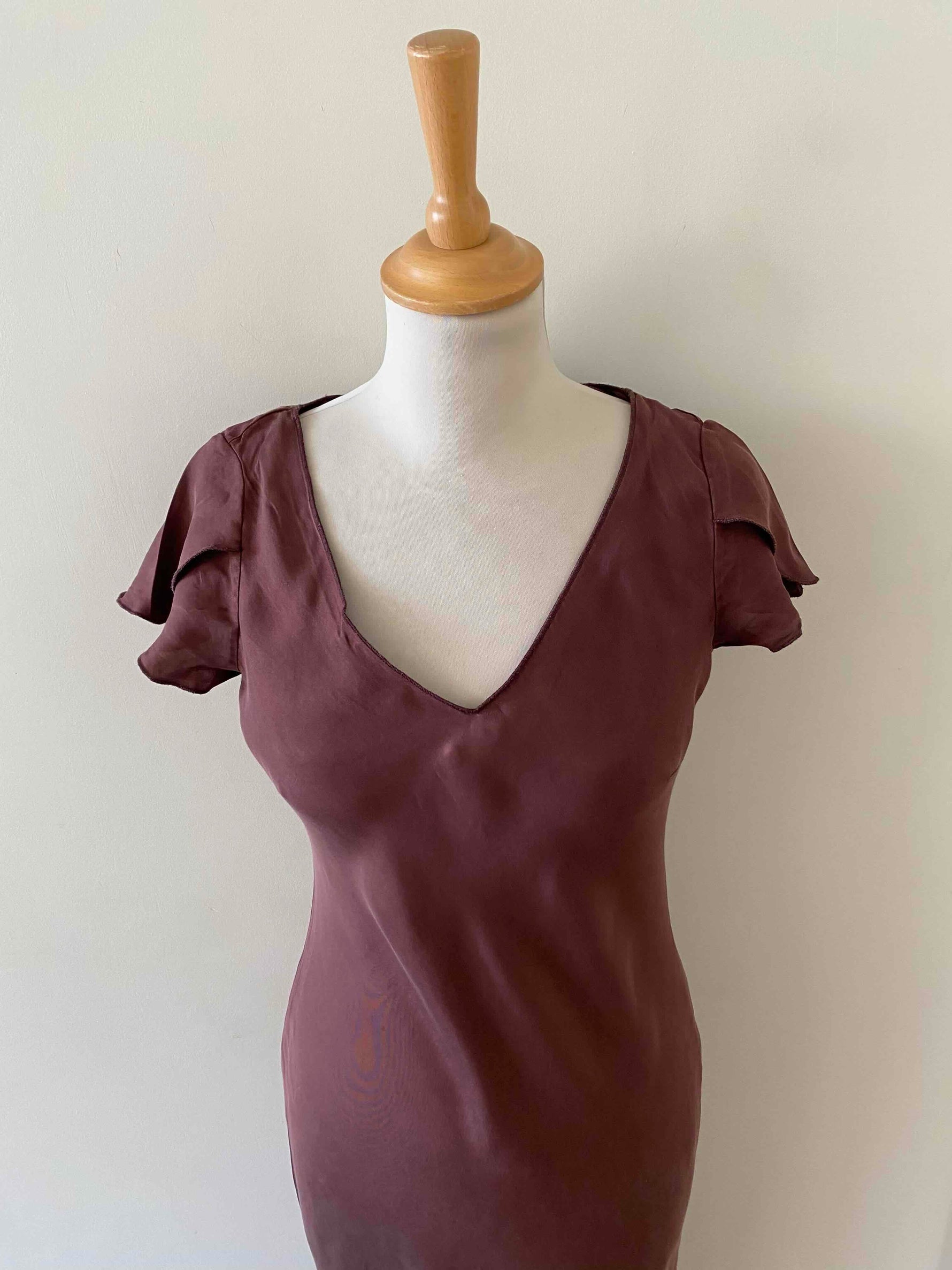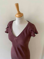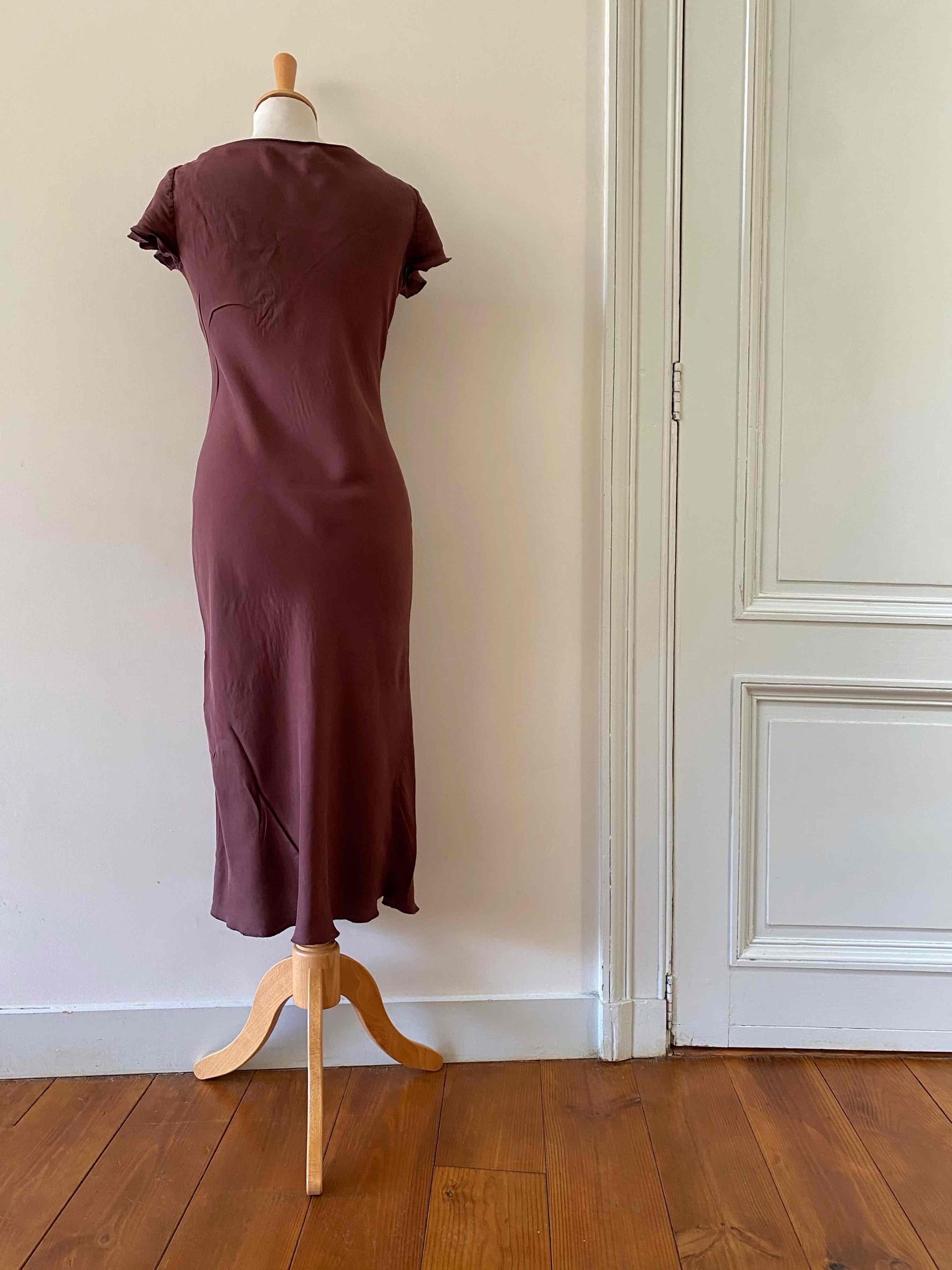 Prix unitaire parRobe midi en soie, twill de soie lavée satinée couleur chocolat, encolure V, manches papillons, forme fit and flare en biais, années 90's, taille 34 et 36 portée ici sur un mannequin T36, aisselles 43cm.