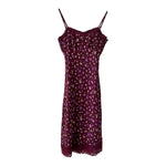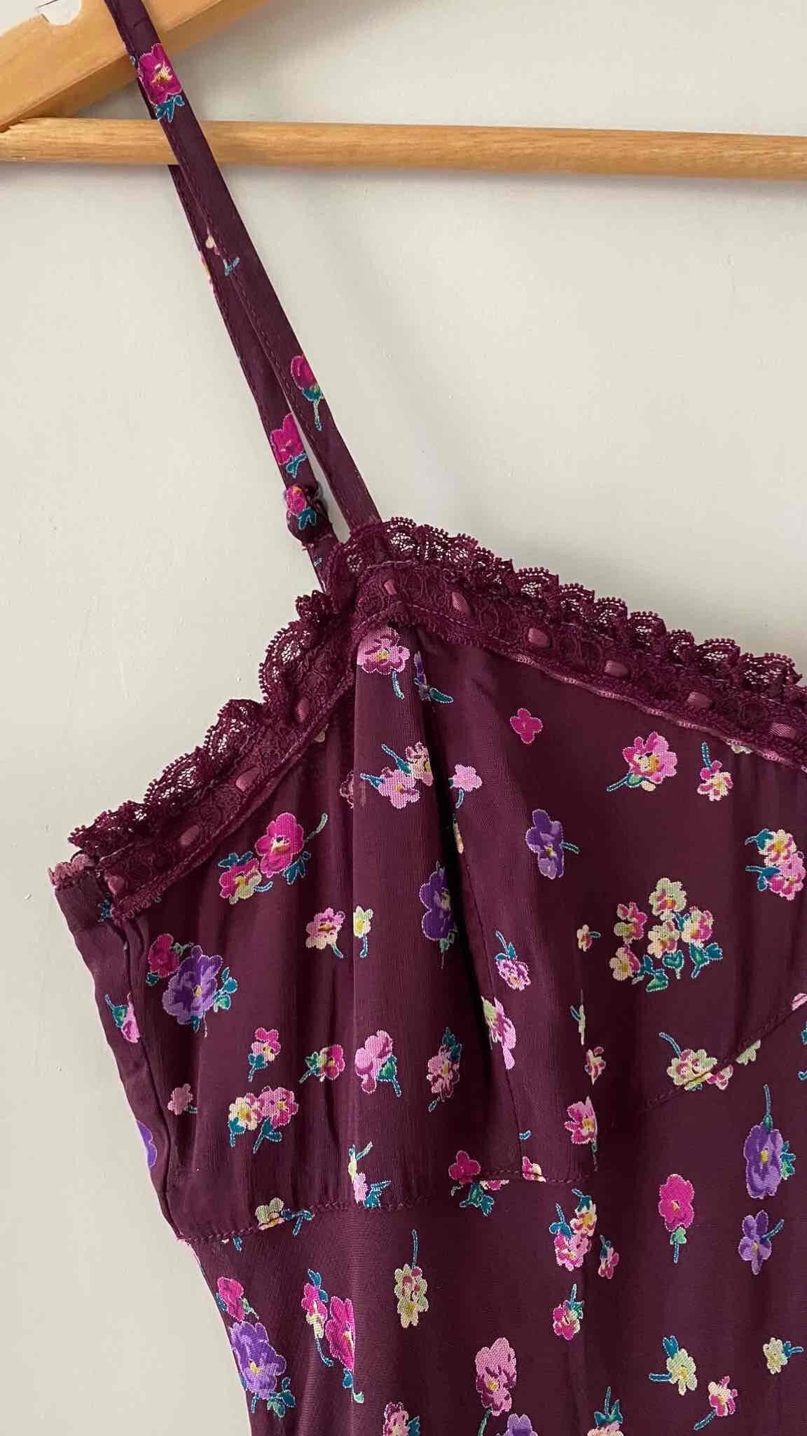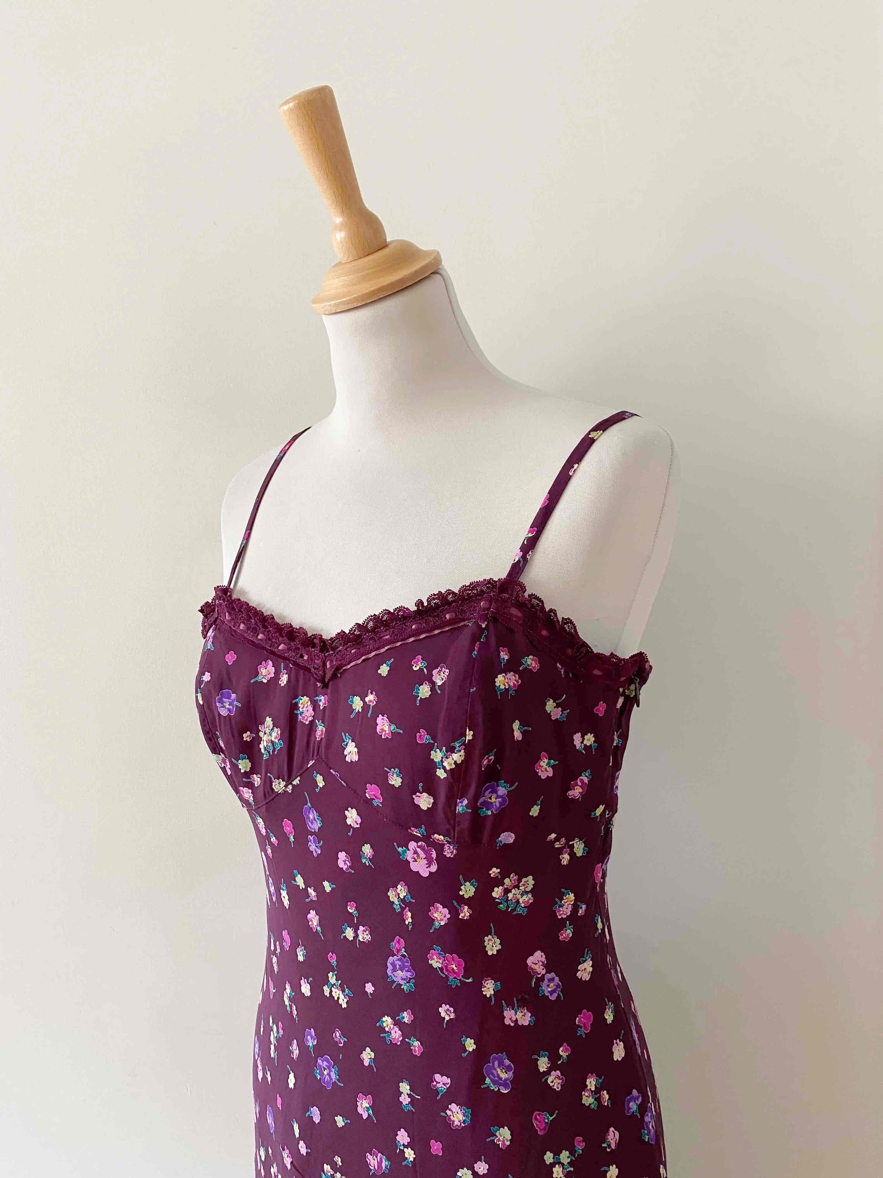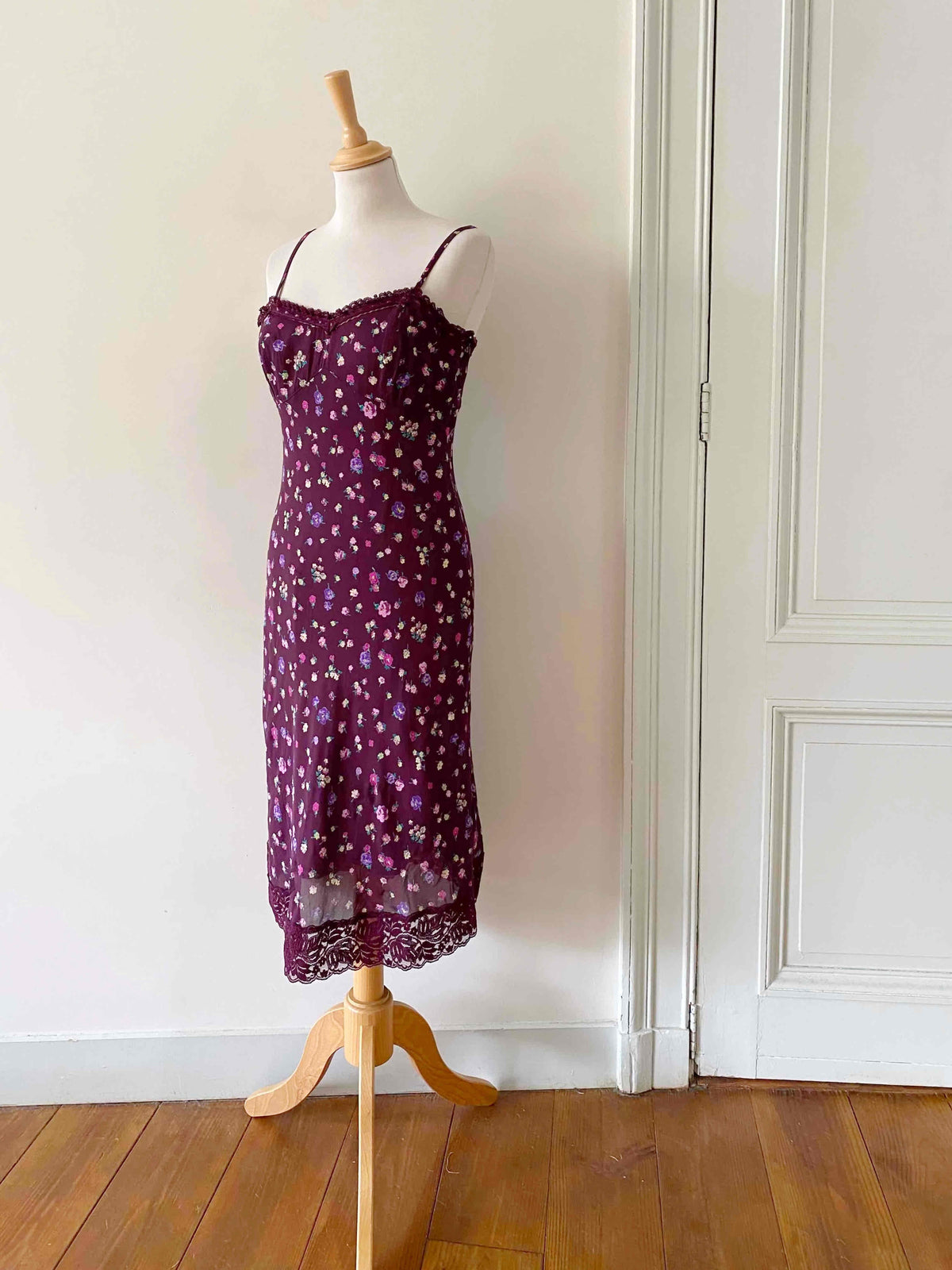 Prix unitaire parRobe / nuisette à pois et dentelle, à fines bretelles réglables, en voile viscose doublée violet prune et petites fleurs multicolores jaunes, lilas, poitrine froncée esprit sleep dress, Alain Manoukian, y2k, taille 36 portée ici sur un mannequin T36, aisselles 43cm.