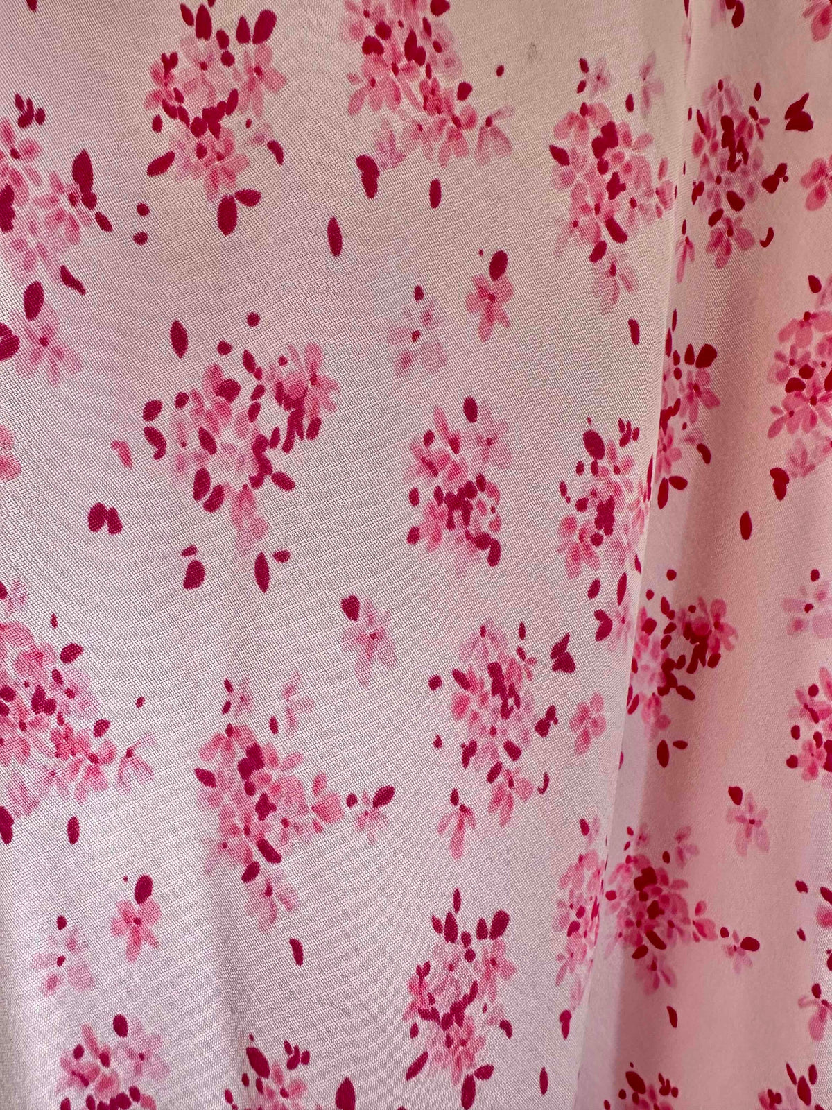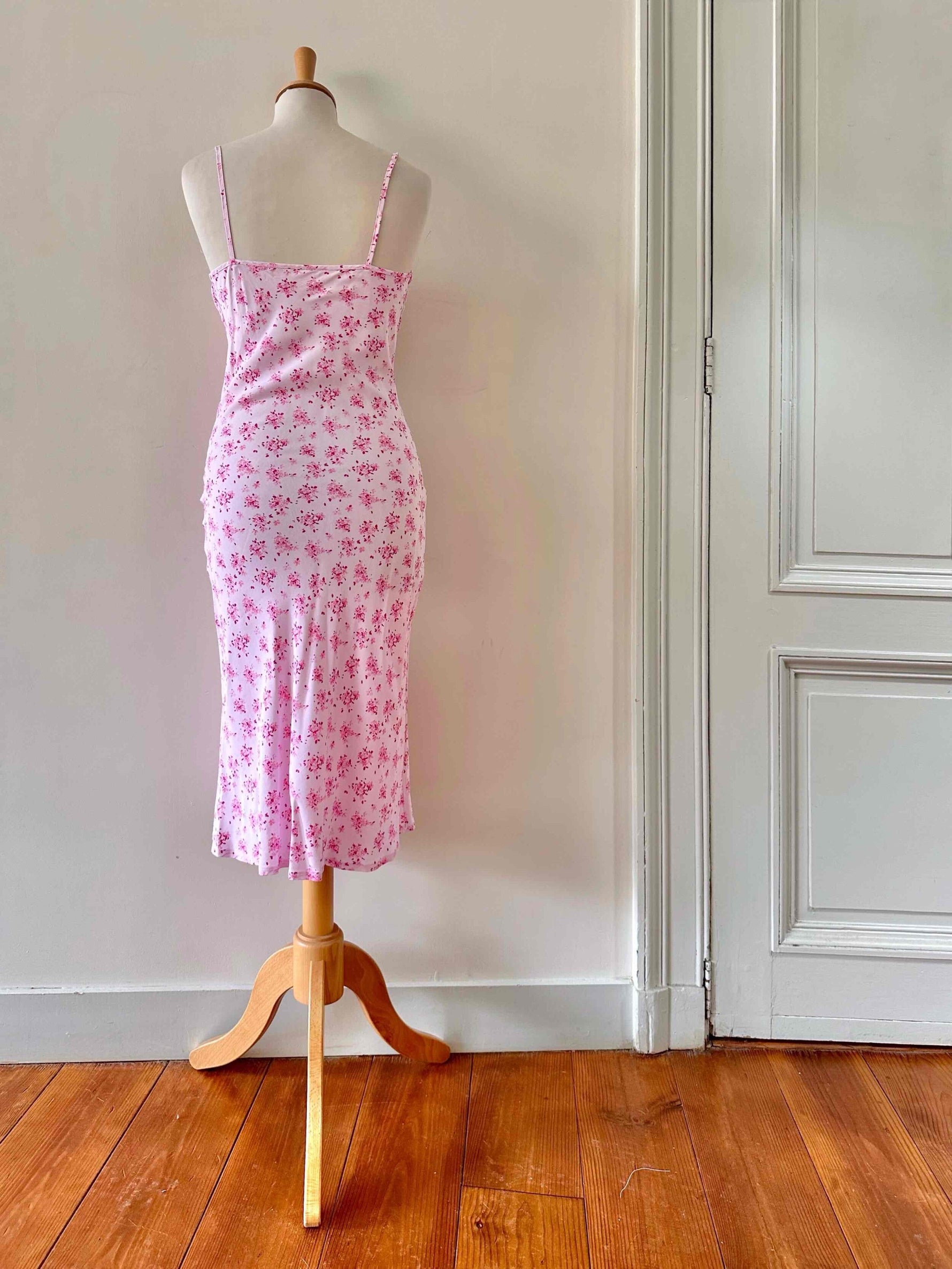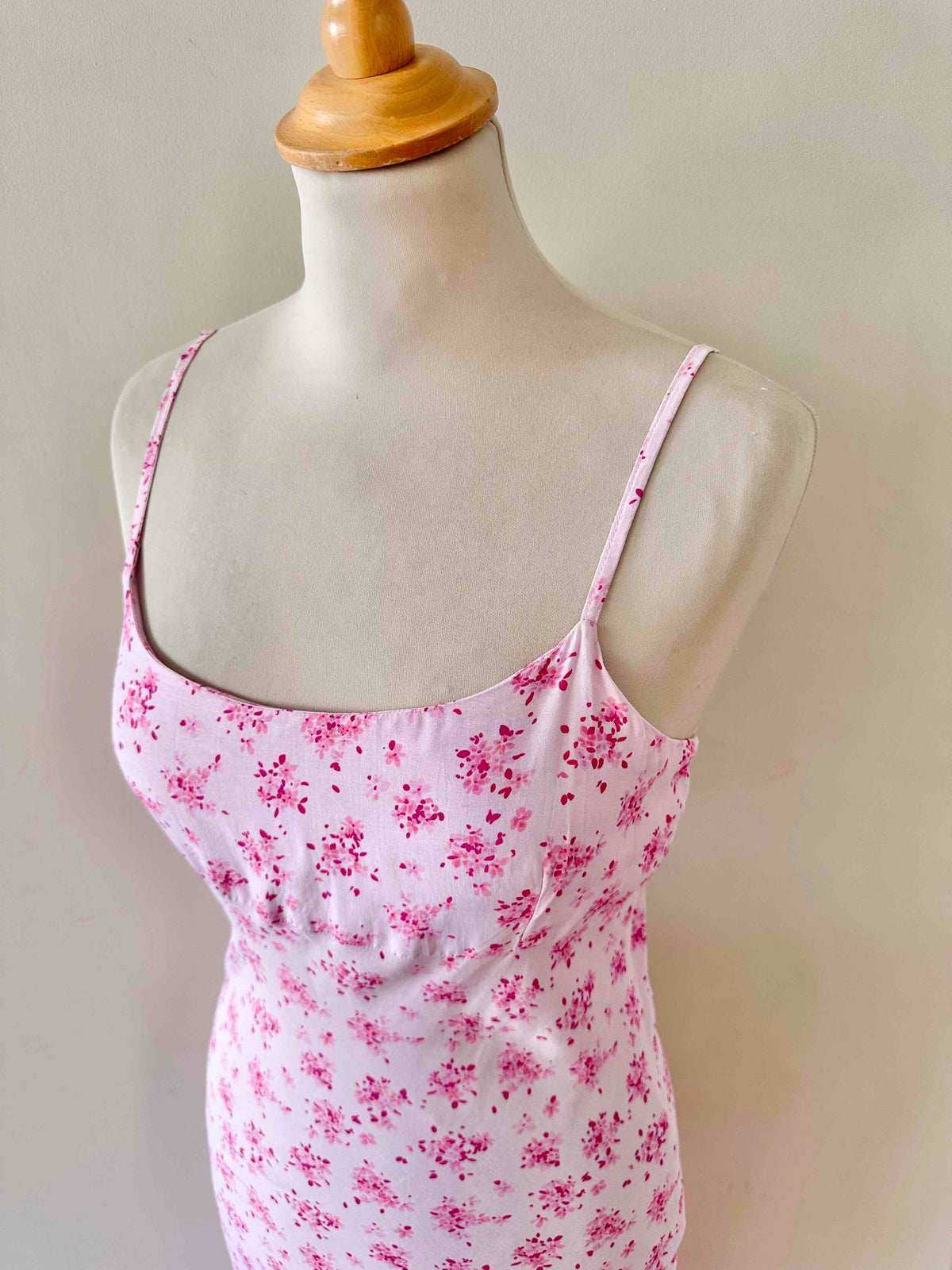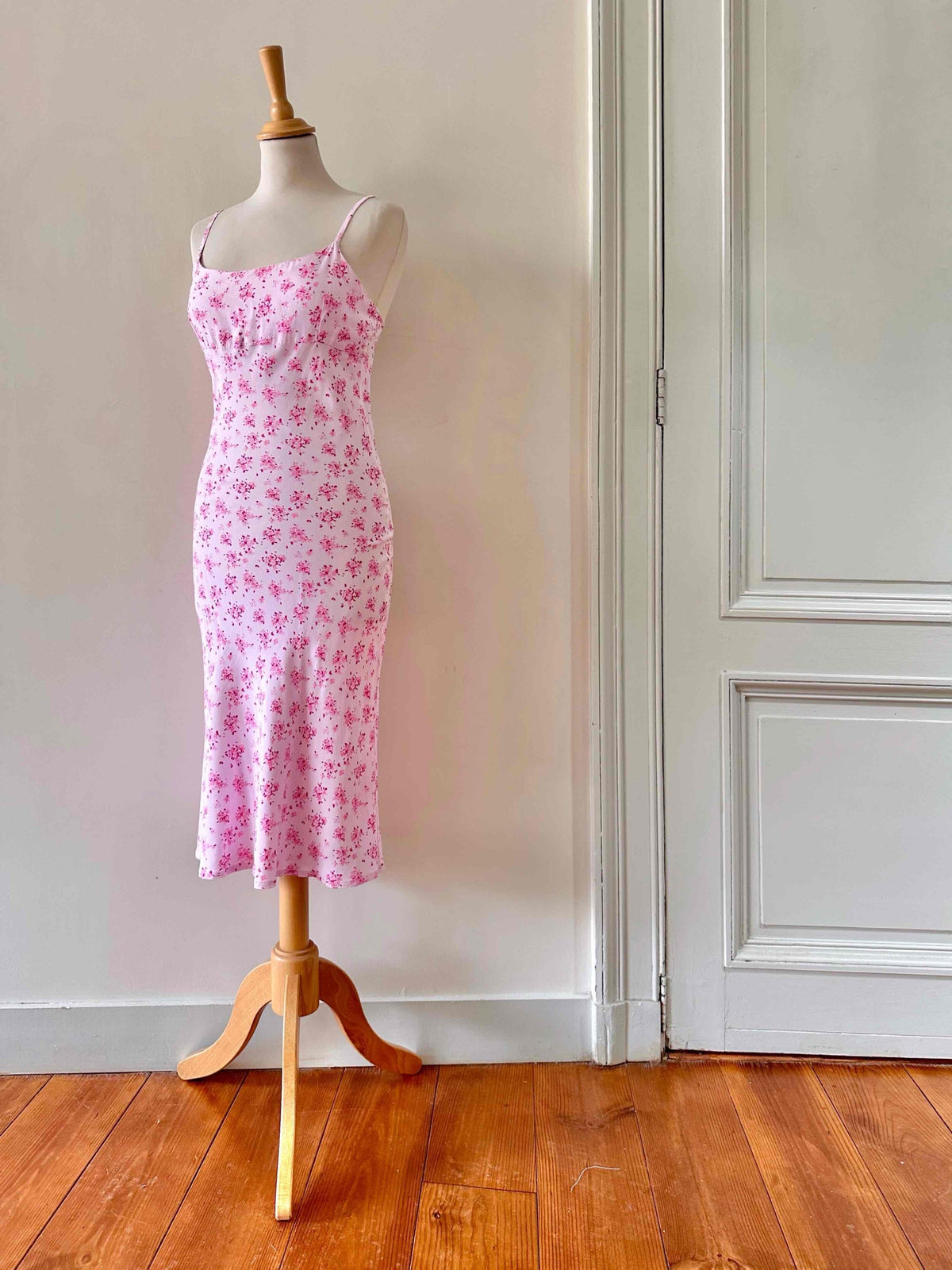 Prix unitaire parRobe nuisette à fleurs en viscose rose imprimée petites fleurs roses fuchsia et bonbon, bretelles spaghettis, poitrine froncée, à enfiler, années 90's, convient aux taille 34 et 36, portée ici sur un mannequin T36, aisselles 43 cm.