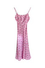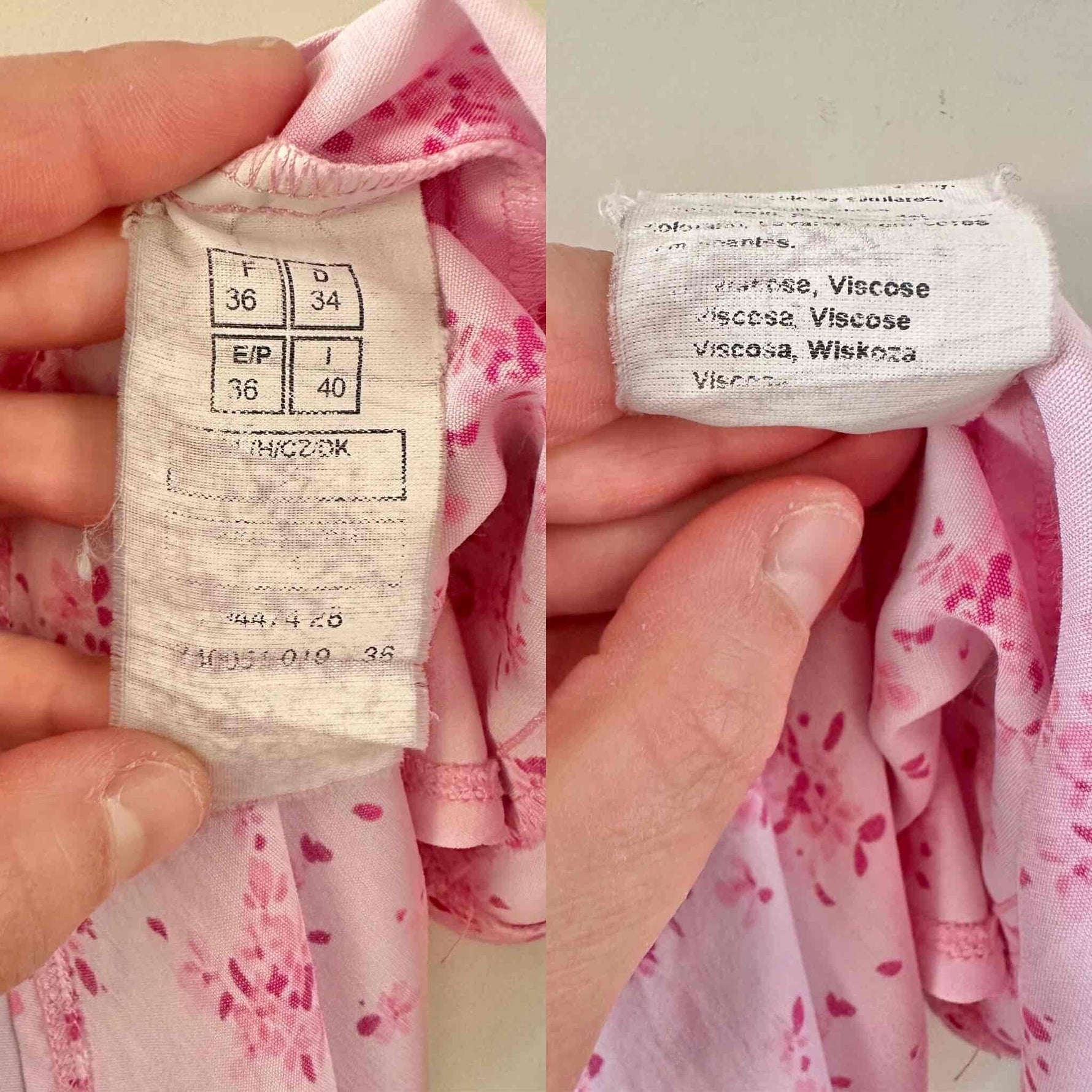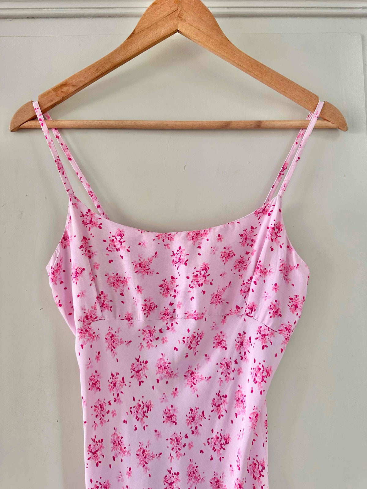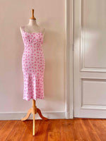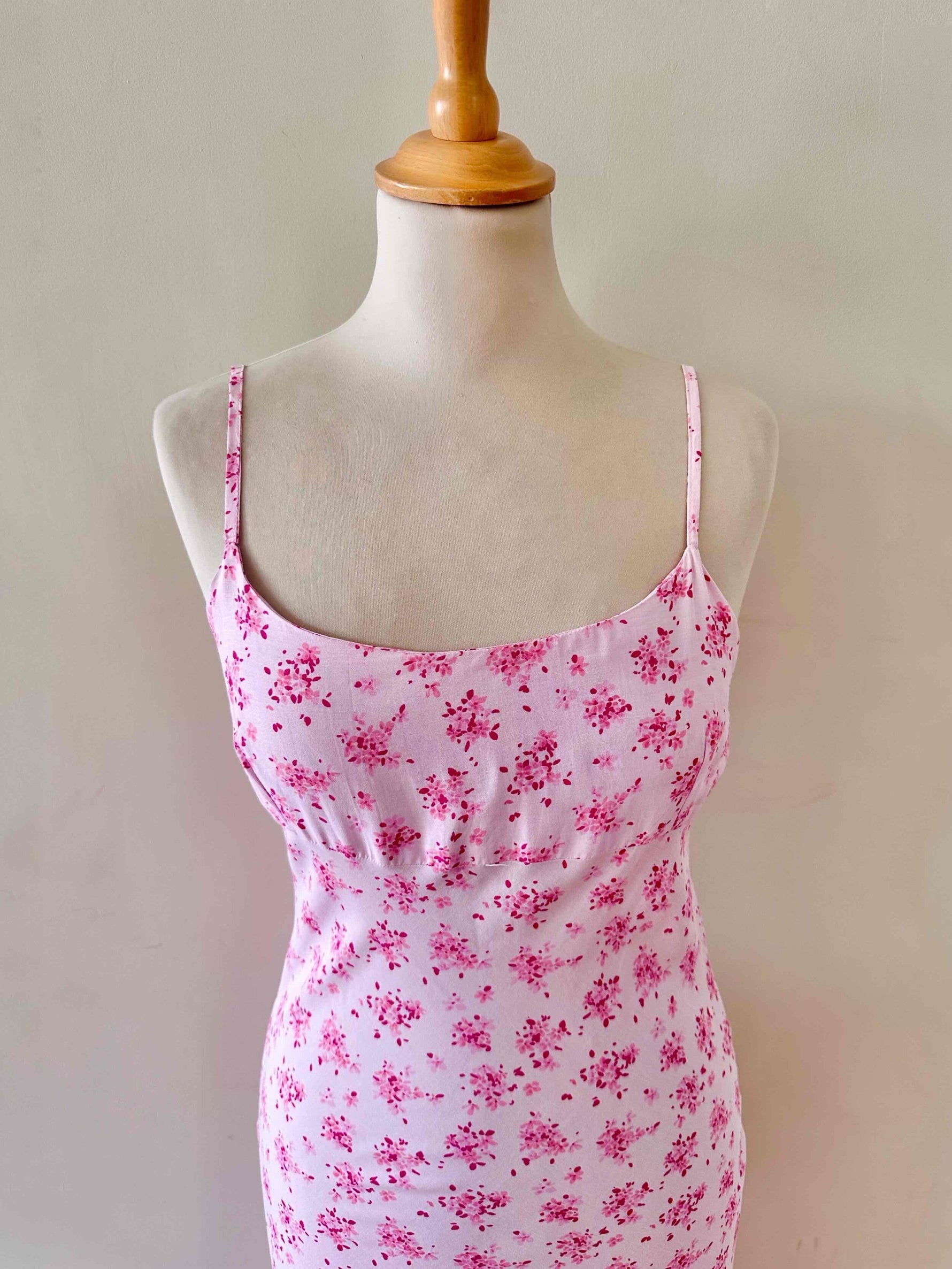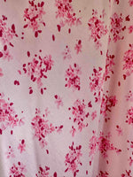 Prix unitaire parRobe nuisette à fleurs en viscose rose imprimée petites fleurs roses fuchsia et bonbon, bretelles spaghettis, poitrine froncée, à enfiler, années 90's, convient aux taille 34 et 36, portée ici sur un mannequin T36, aisselles 43 cm.