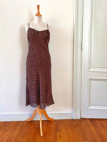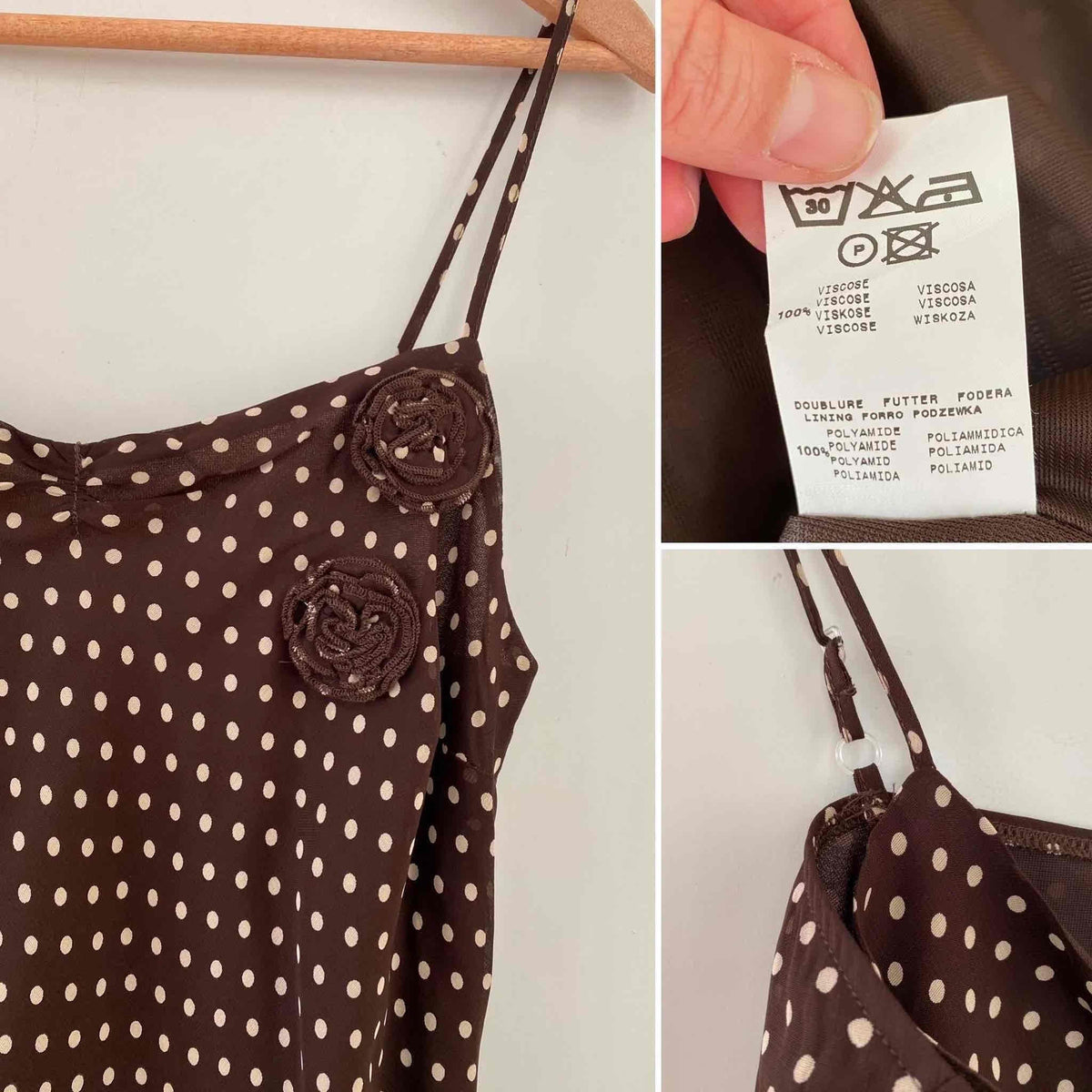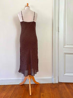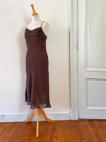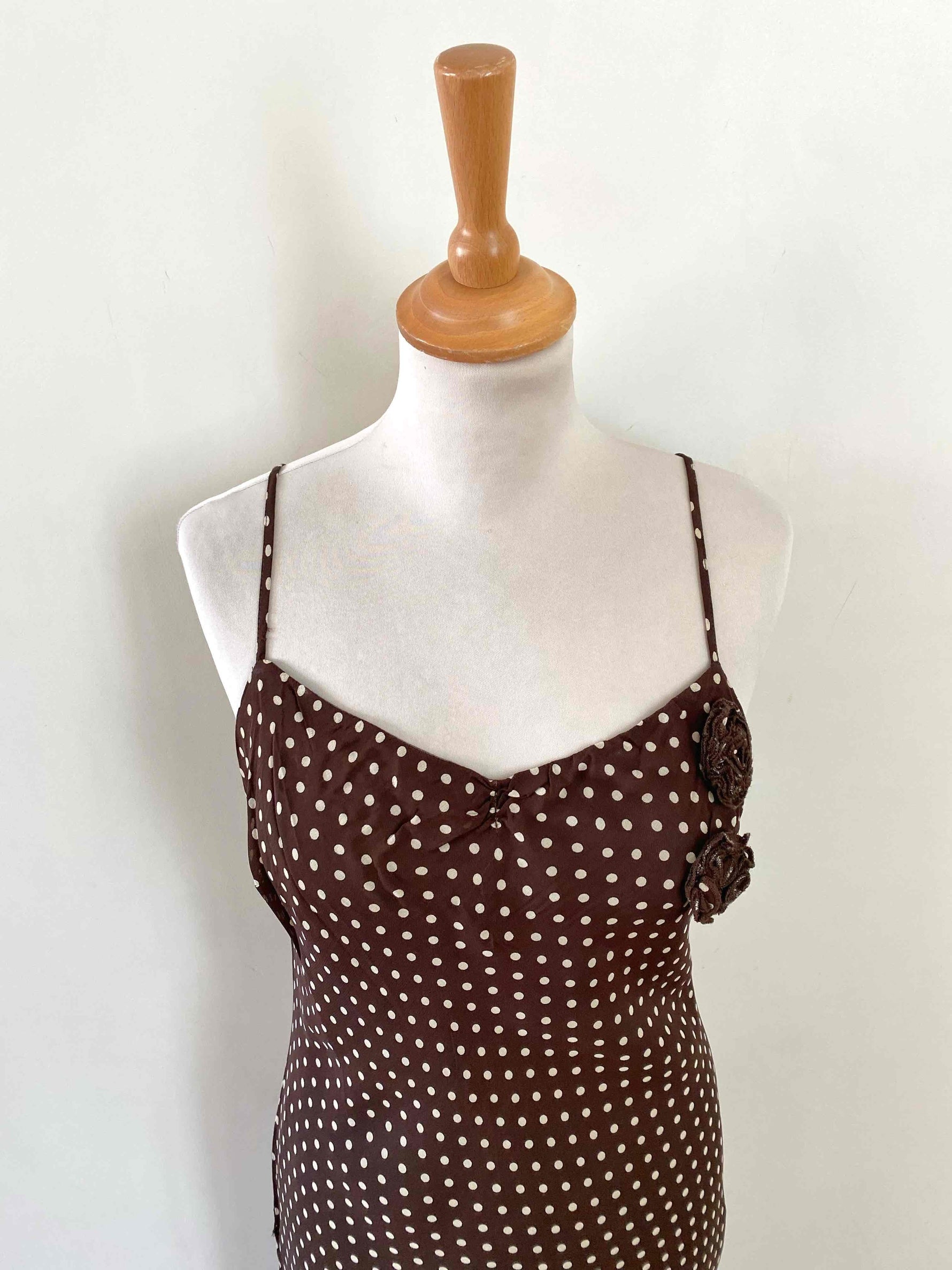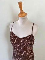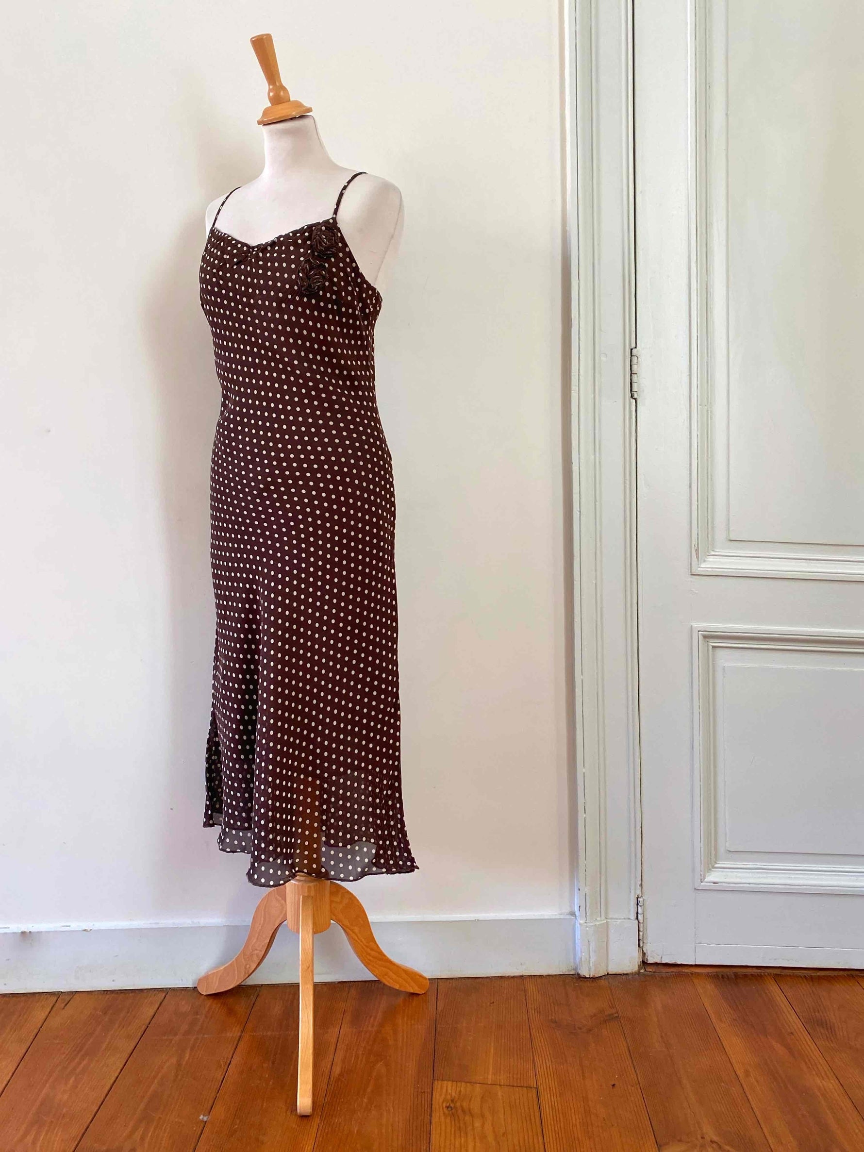 Prix unitaire parRobe nuisette à pois, en viscose chocolat imprimée pois blancs, poitrine froncée et fleurs ornées sur un côté, bretelles spaghettis réglables, forme fit and flare en biais, fabriquée en France, taille 36 portée ici sur un mannequin T36, aisselles 43cm.