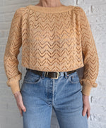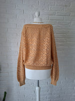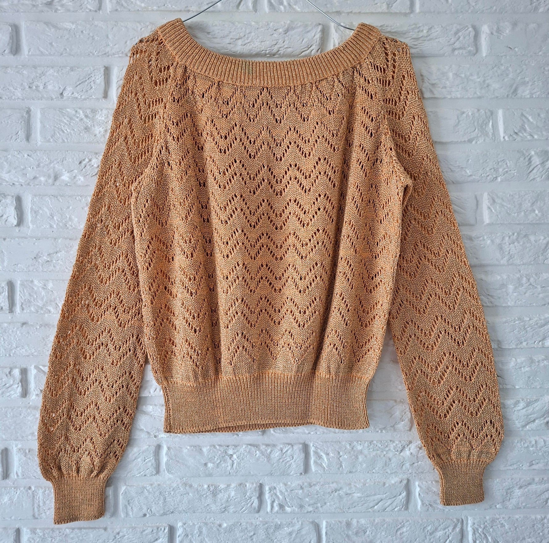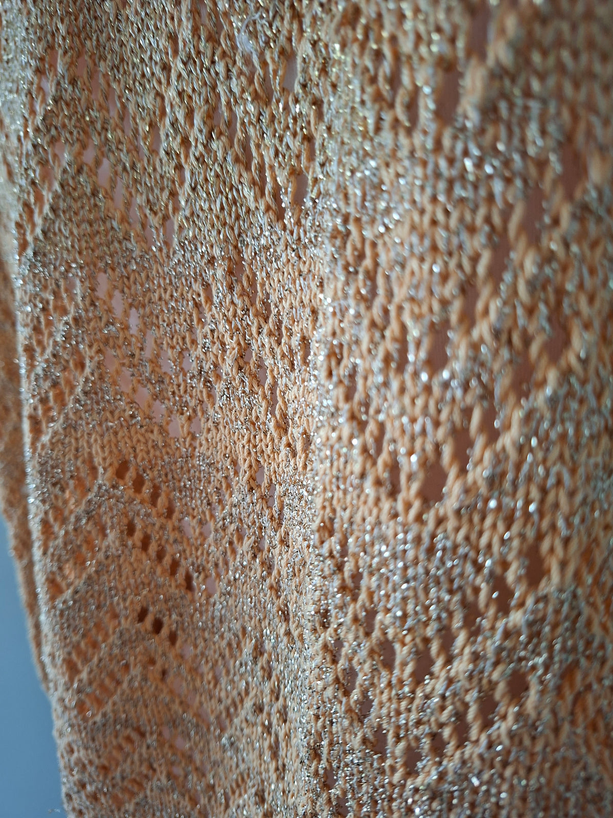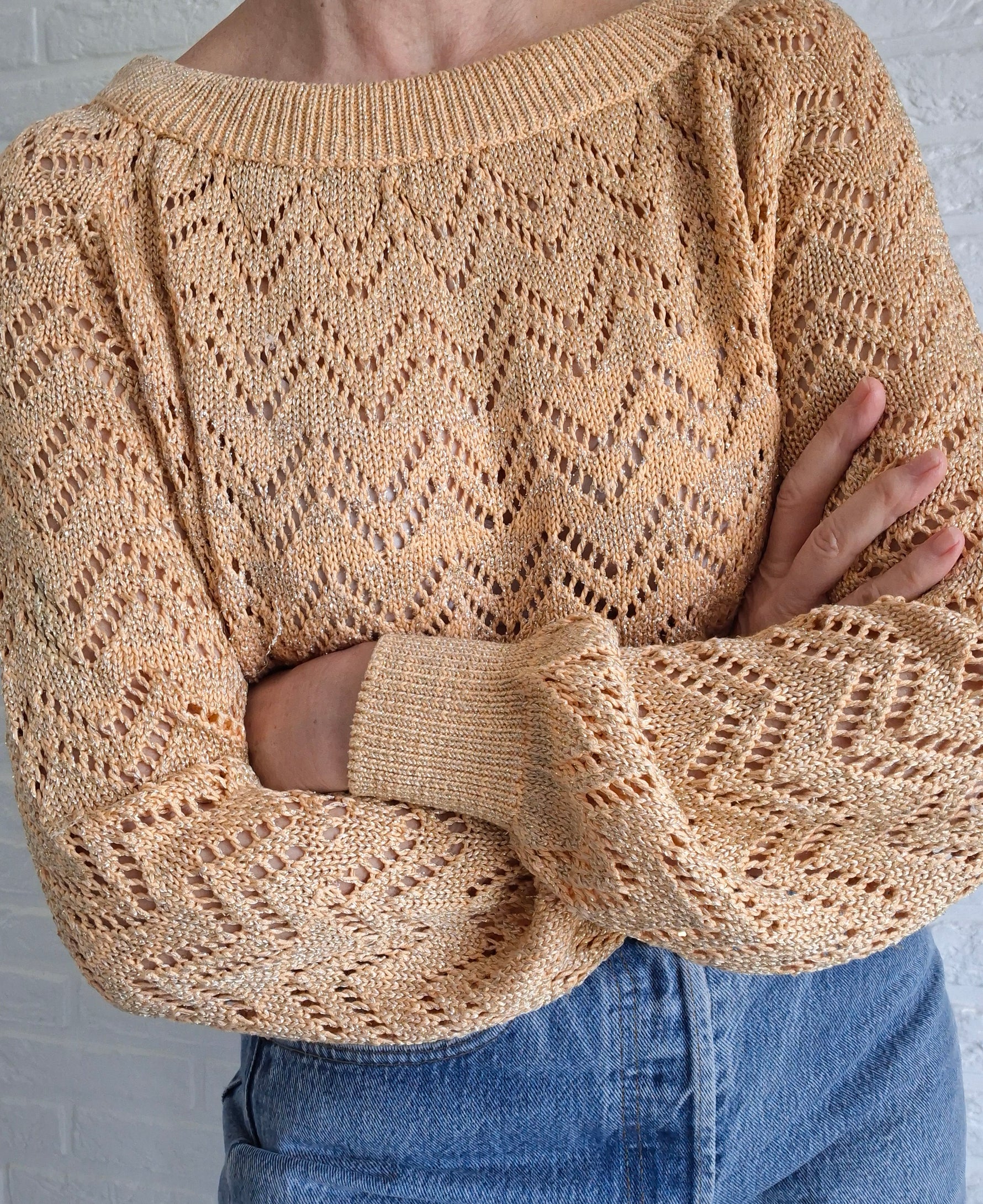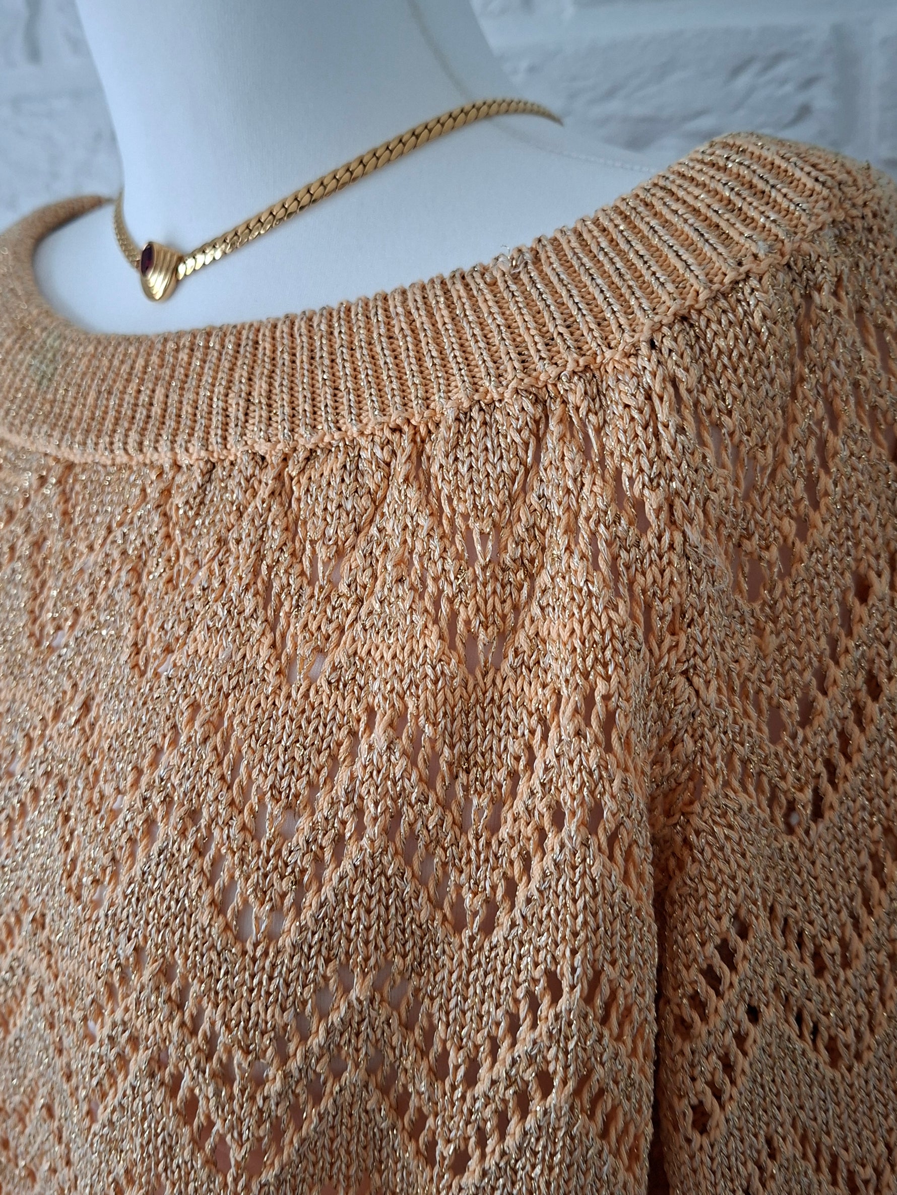 Top en lurex Large encolure ronde Emmanchures raglan et manches longues Bords côtes Les mesures à plat Aisselles 53 cm Longueur 54 cm Porté par Patricia qui fait une taille 40.