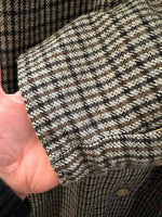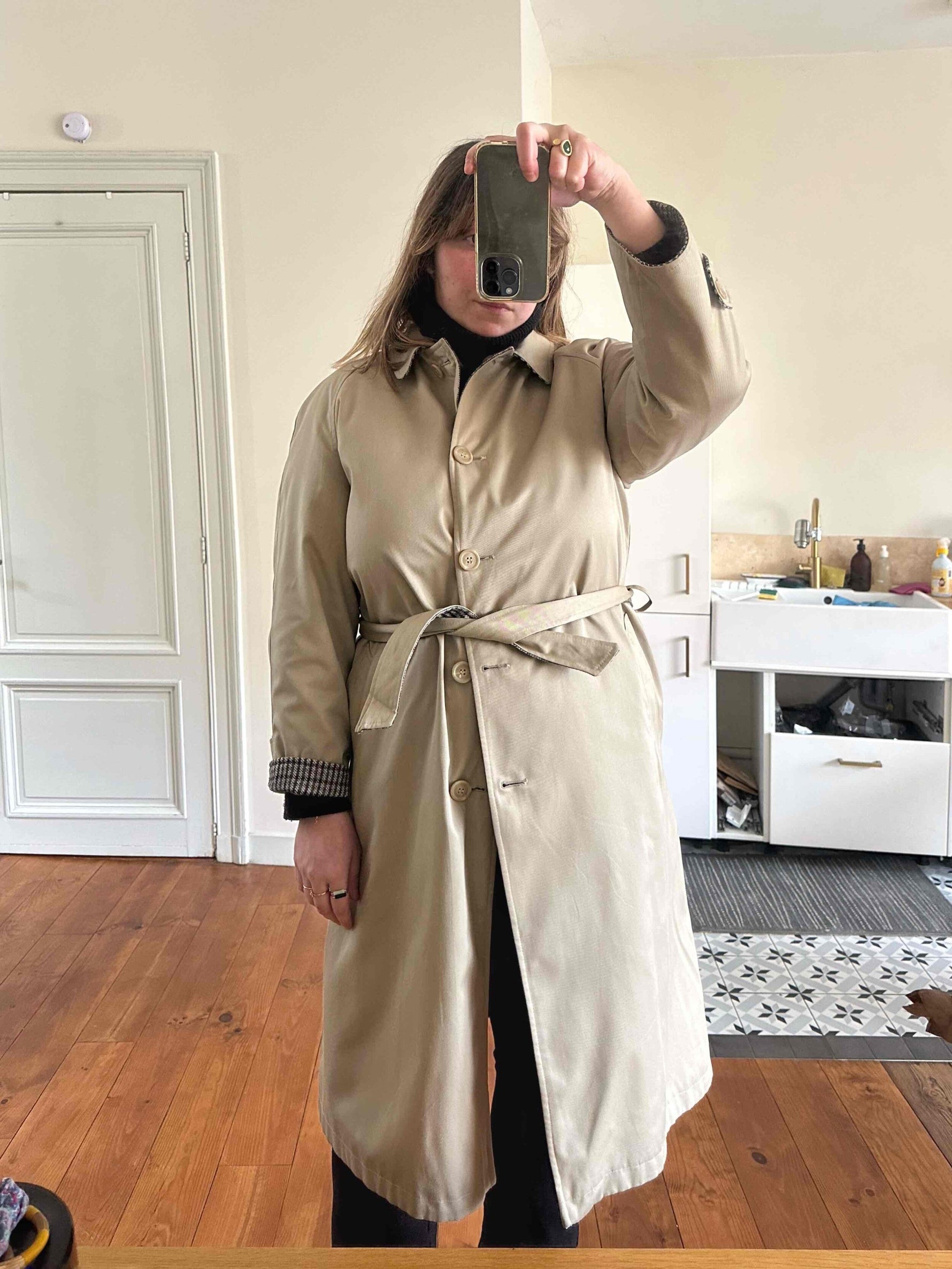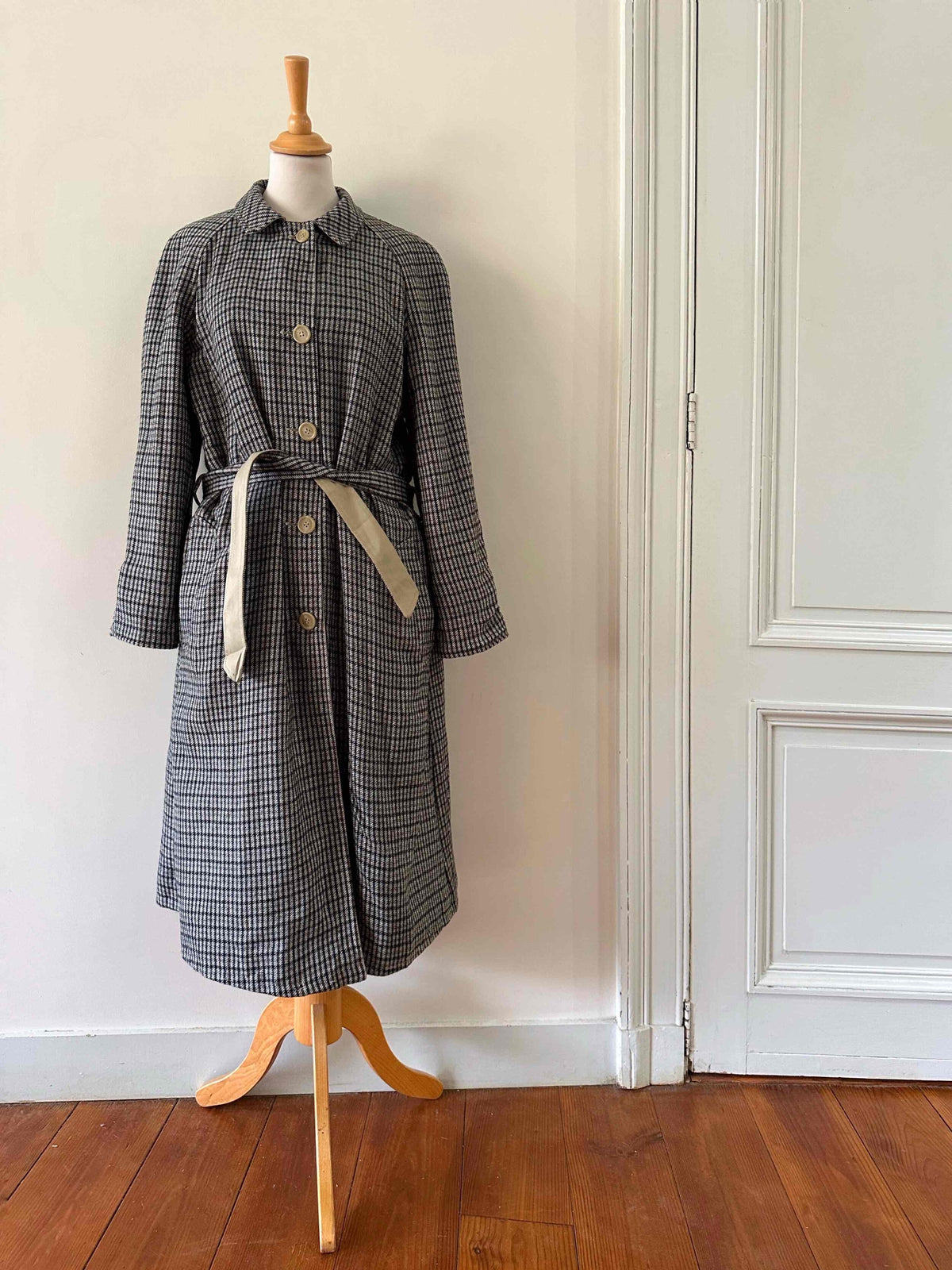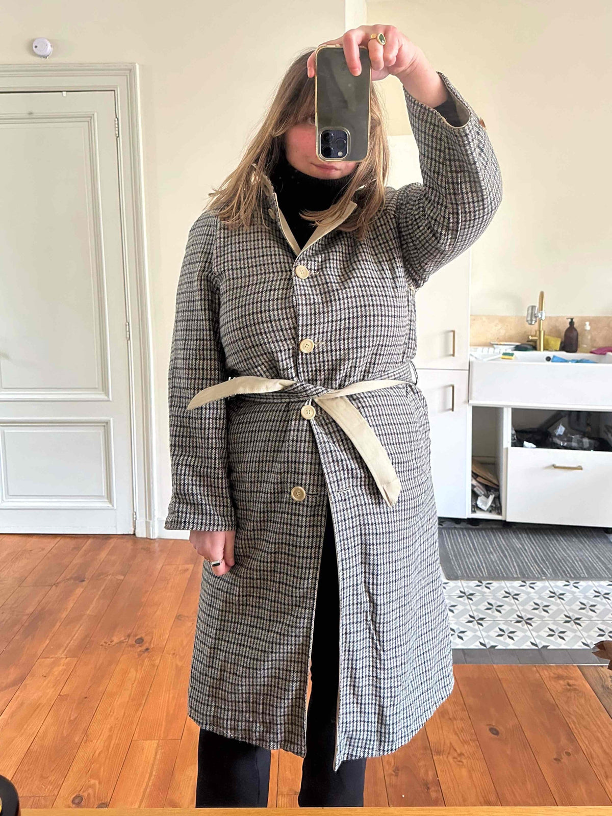 Trenche reversible en laine, gabardine beige réversible en laine à carreaux pied de puce couleurs marron, gris, noirs et blancs. Boutonnage de chaque côté, et ceinture taille à nouer. Fabriqué en Italie, convient aux tailles 36 et 38 porté ici sur un mannequin T36 et ouvert sur une personne T40.