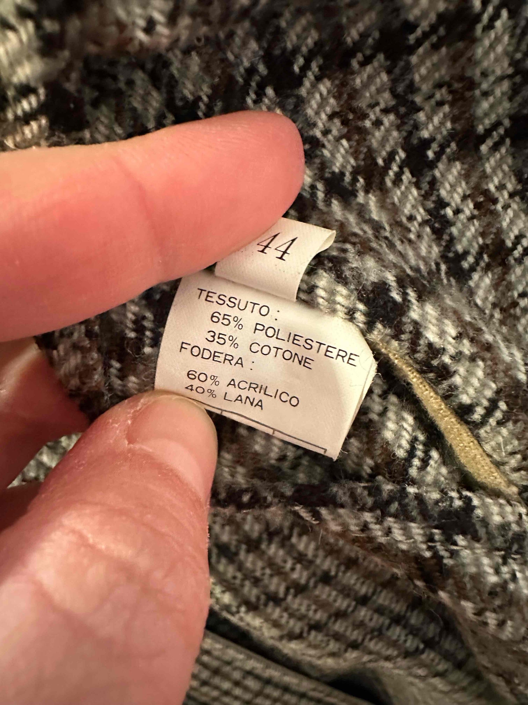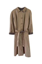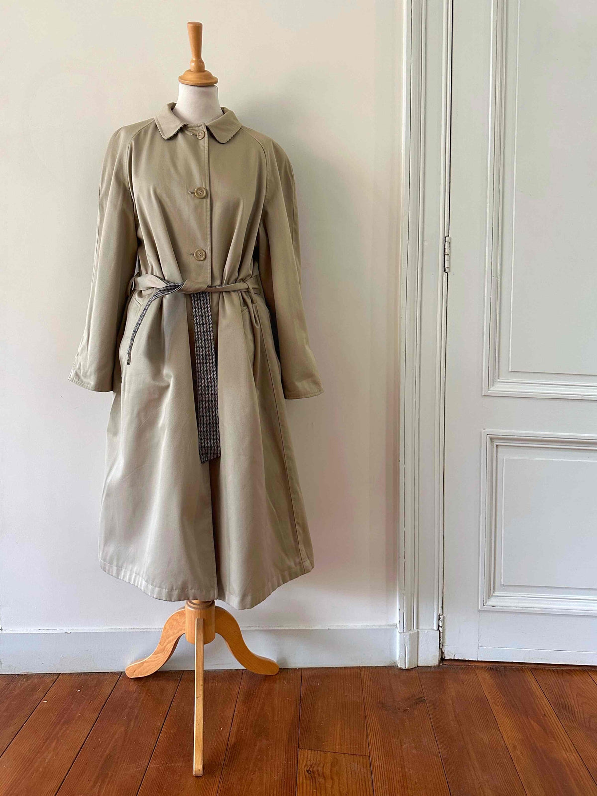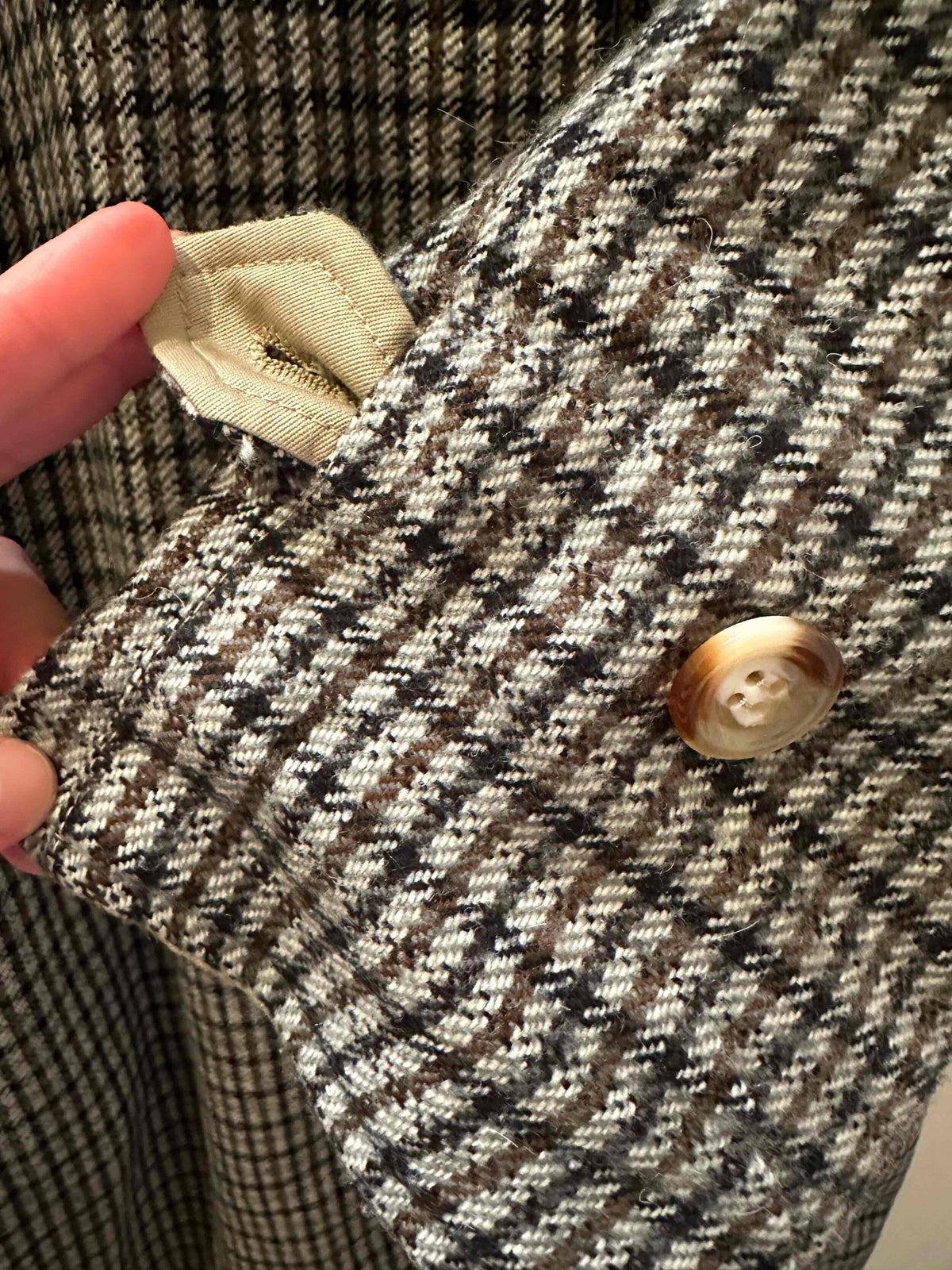 Trenche reversible en laine, gabardine beige réversible en laine à carreaux pied de puce couleurs marron, gris, noirs et blancs. Boutonnage de chaque côté, et ceinture taille à nouer. Fabriqué en Italie, convient aux tailles 36 et 38 porté ici sur un mannequin T36 et ouvert sur une personne T40.