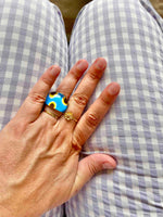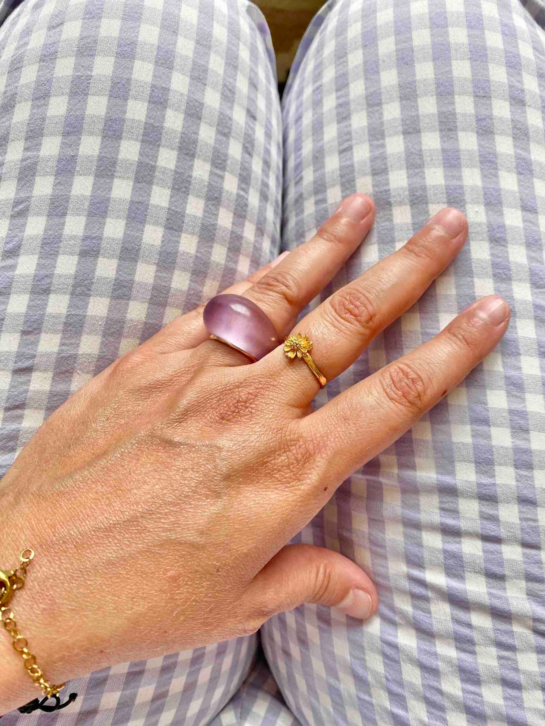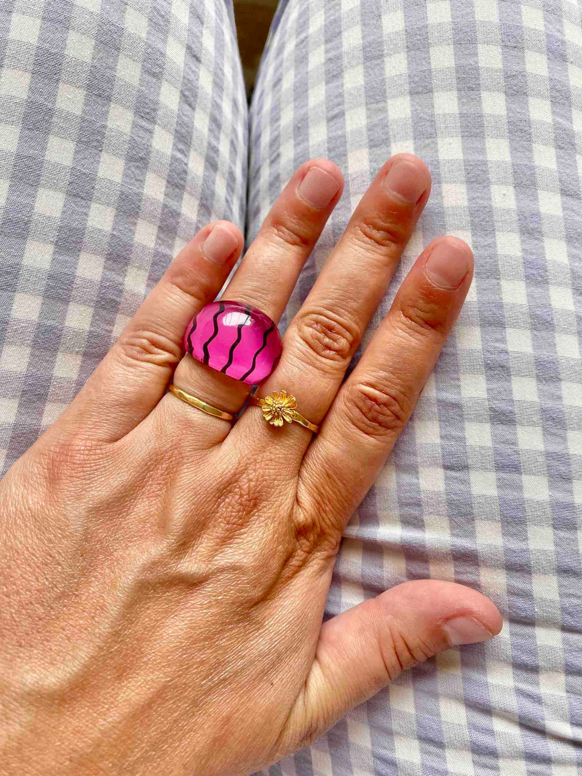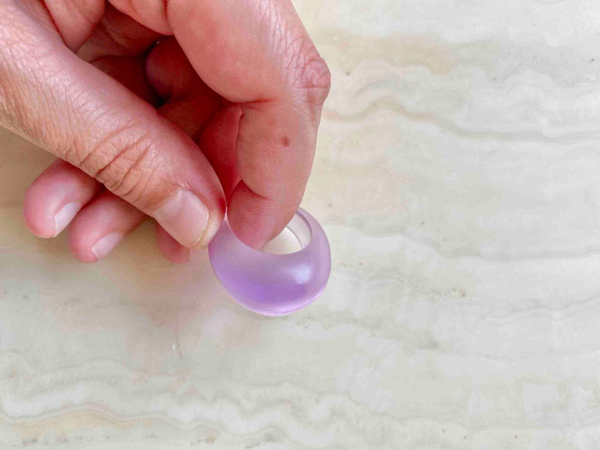 Prix unitaire parBagues en Plastique bombées effet loupe, deux aux motifs incrustés, une lila effet verre poli, années 90’s. Tour 54