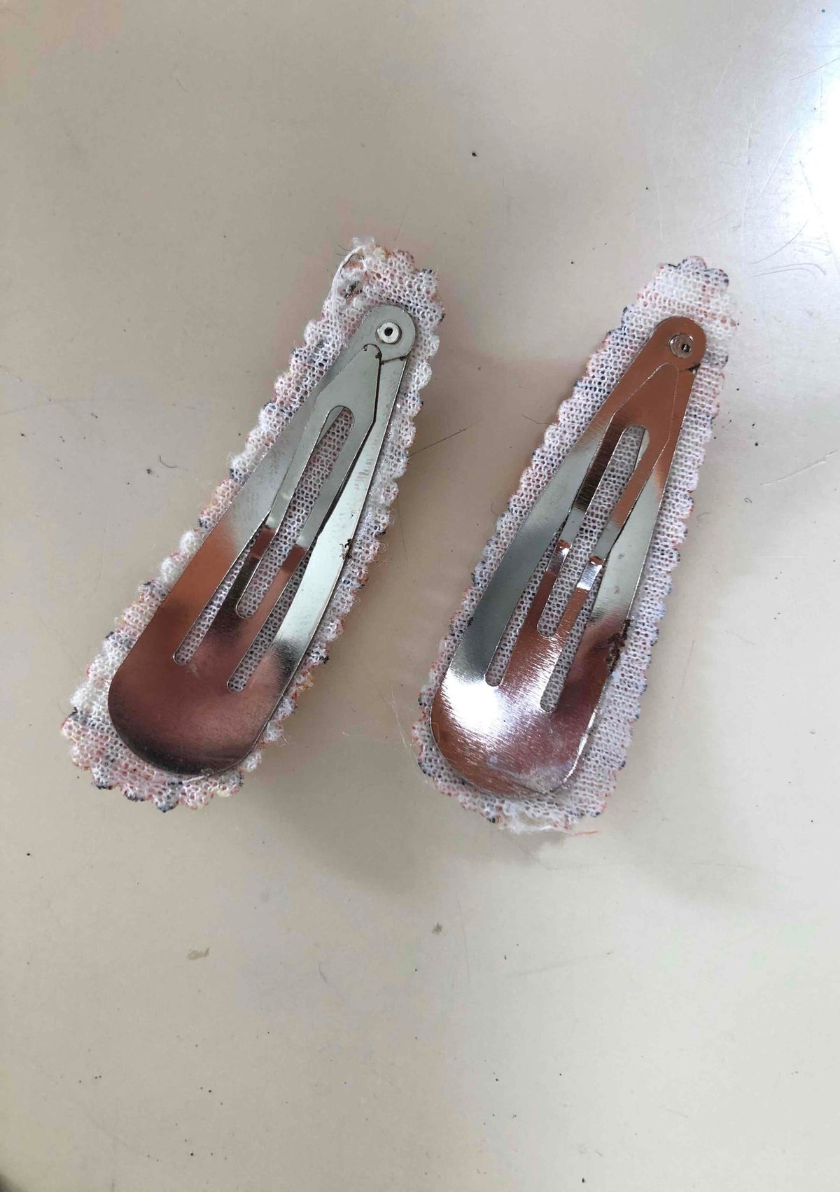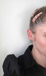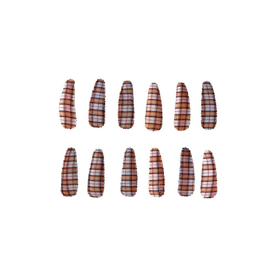 Barrettes à carreaux. Ensemble de douze barrettes, forme crocodiles recouvertes de textiles imprimé tartan. Deadstock 90’s.