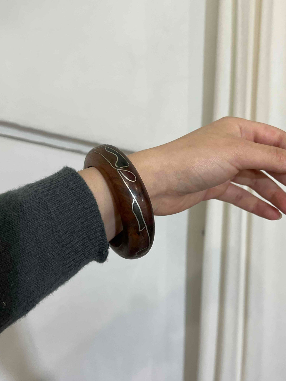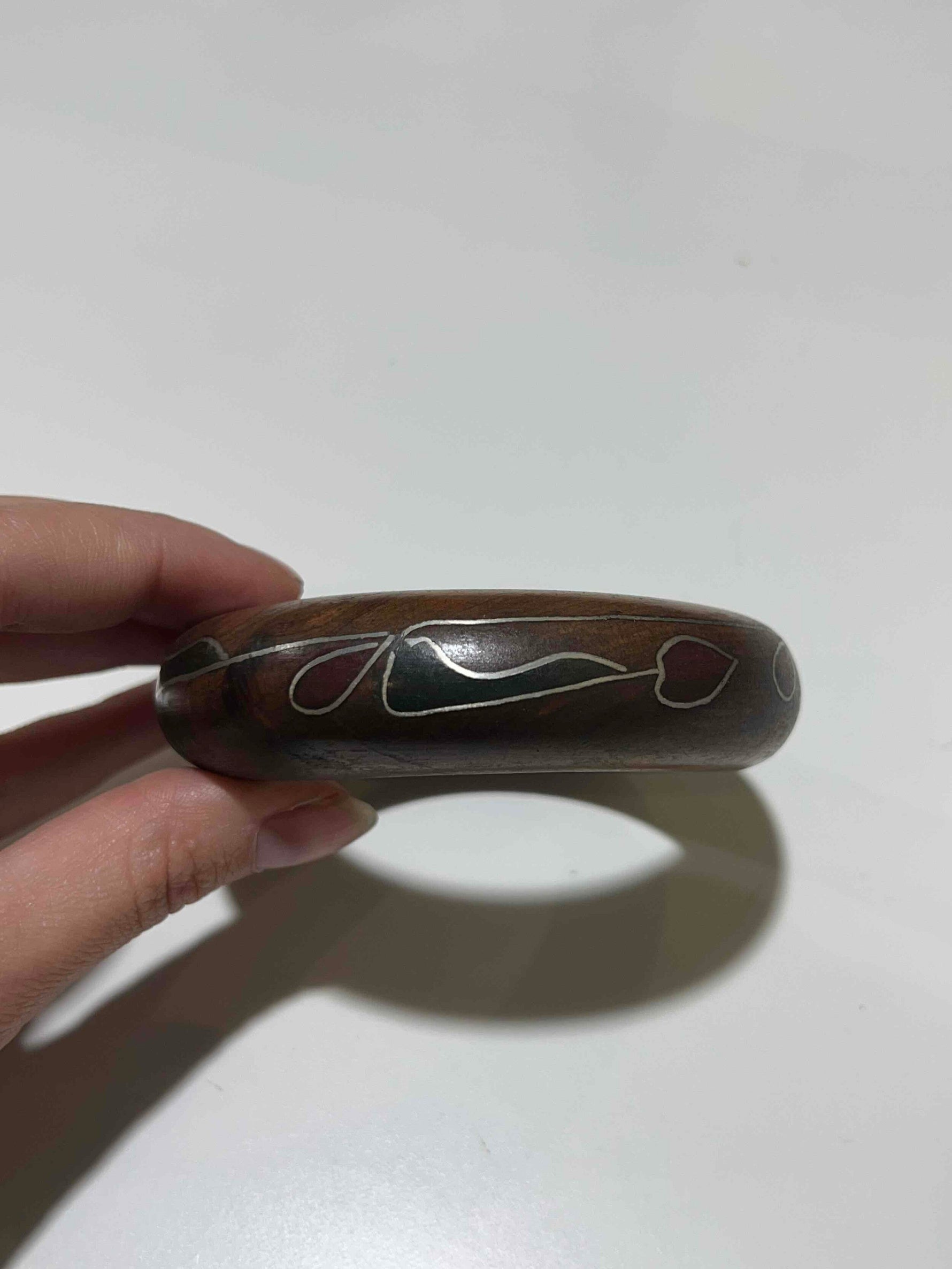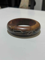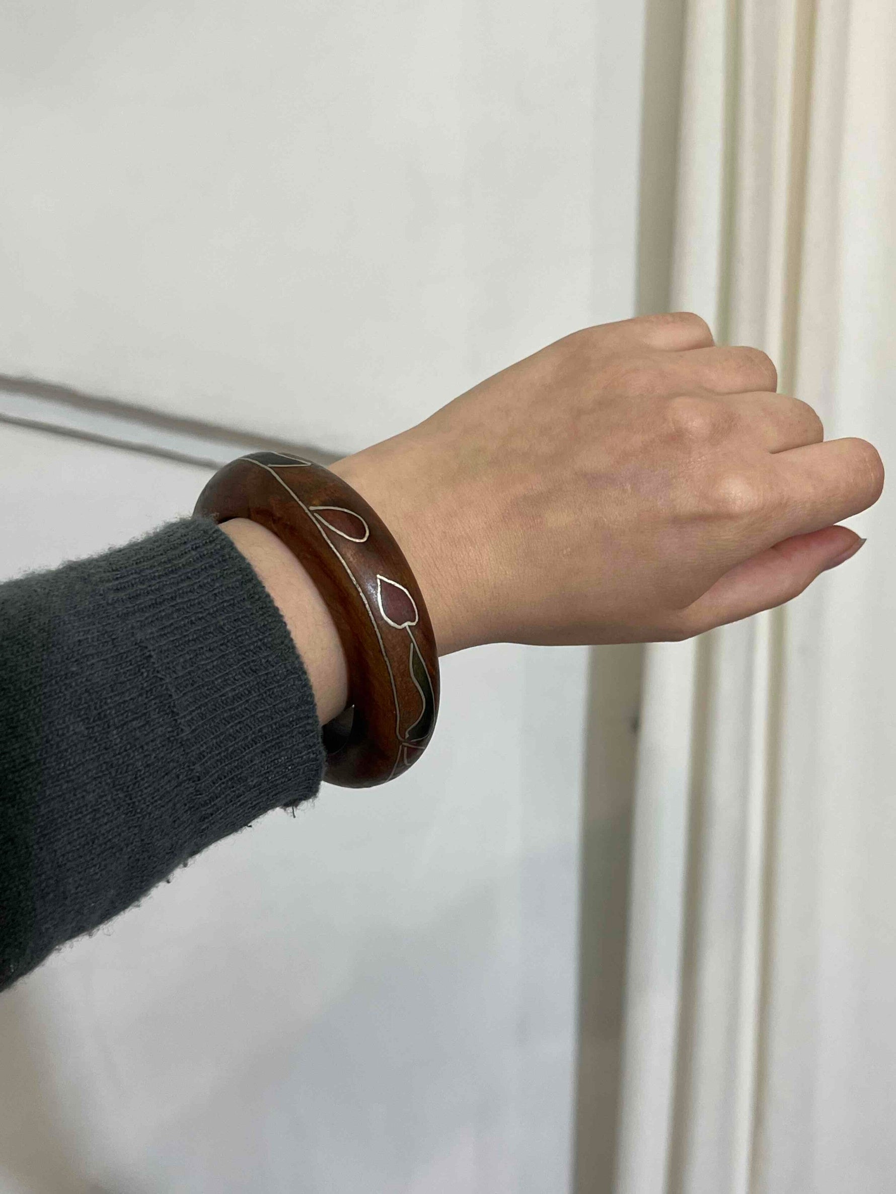 Prix unitaire parBracelet en bois peint datant des années 70s, bois naturel peint avec des feuillages rouges et verts, détails argenté métallique. Parfait état.