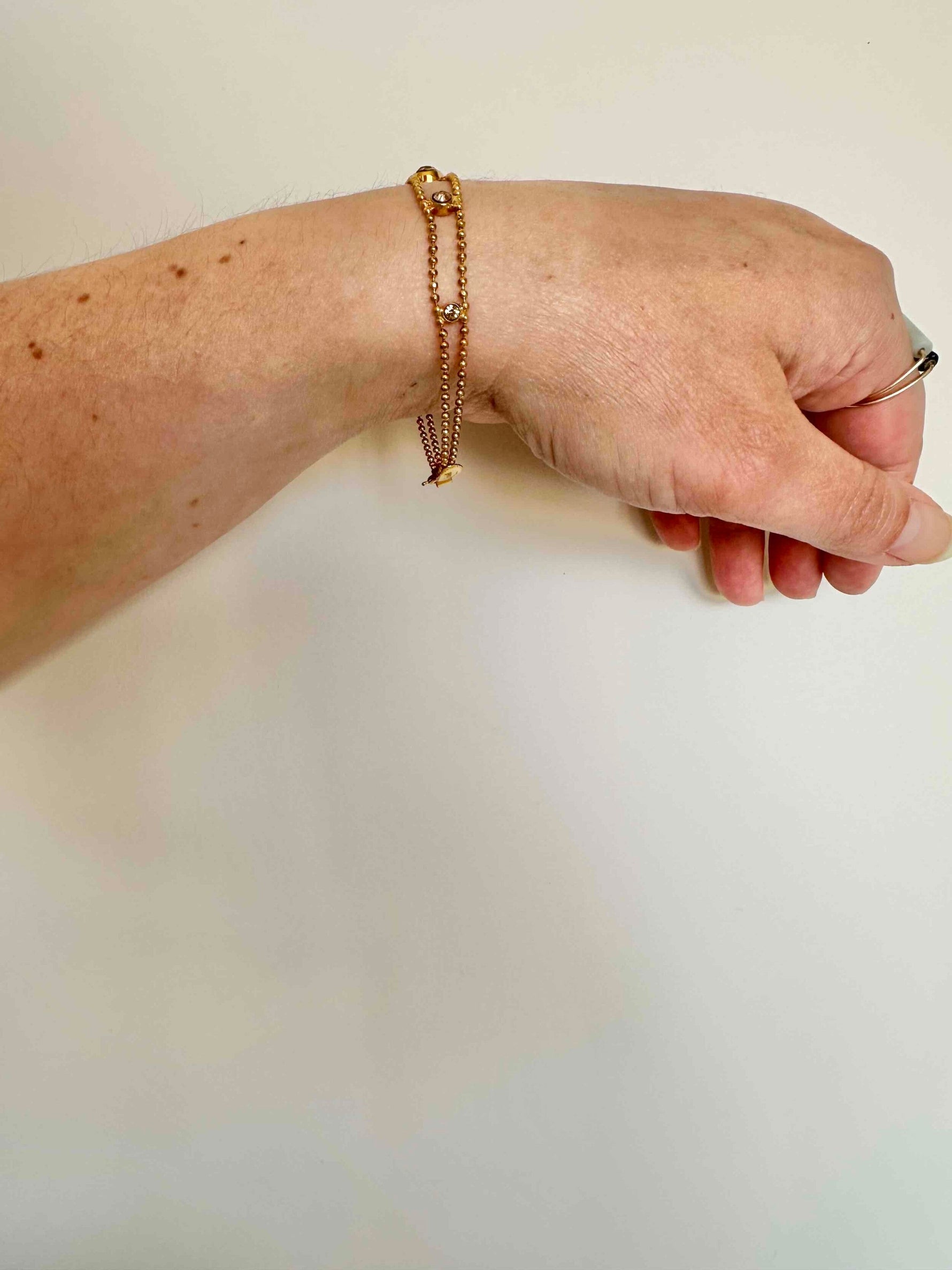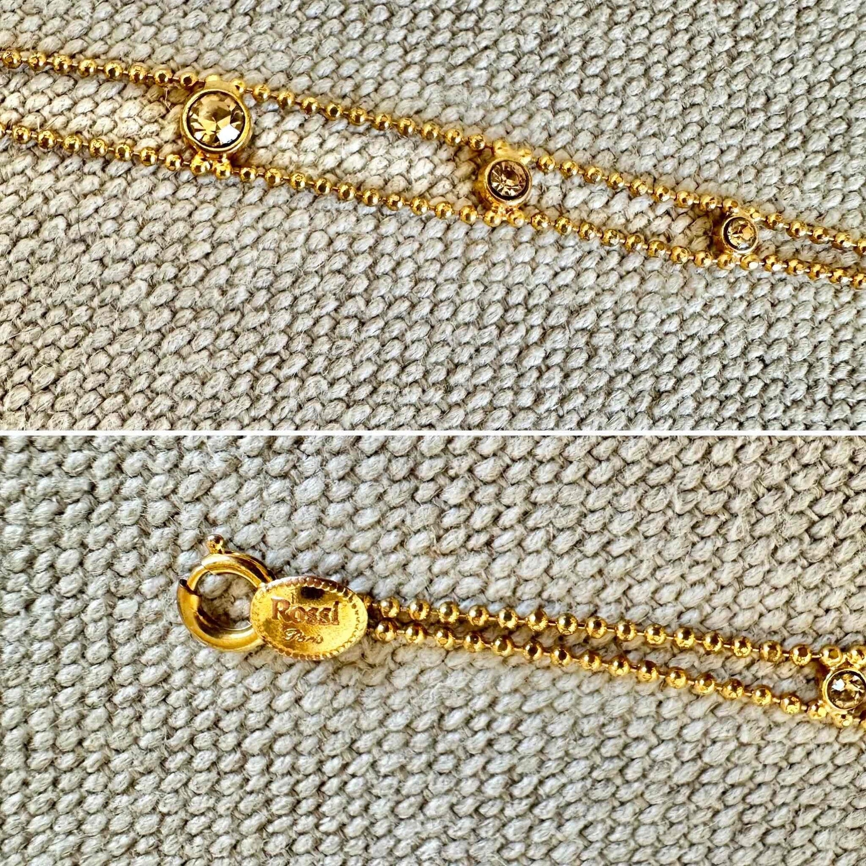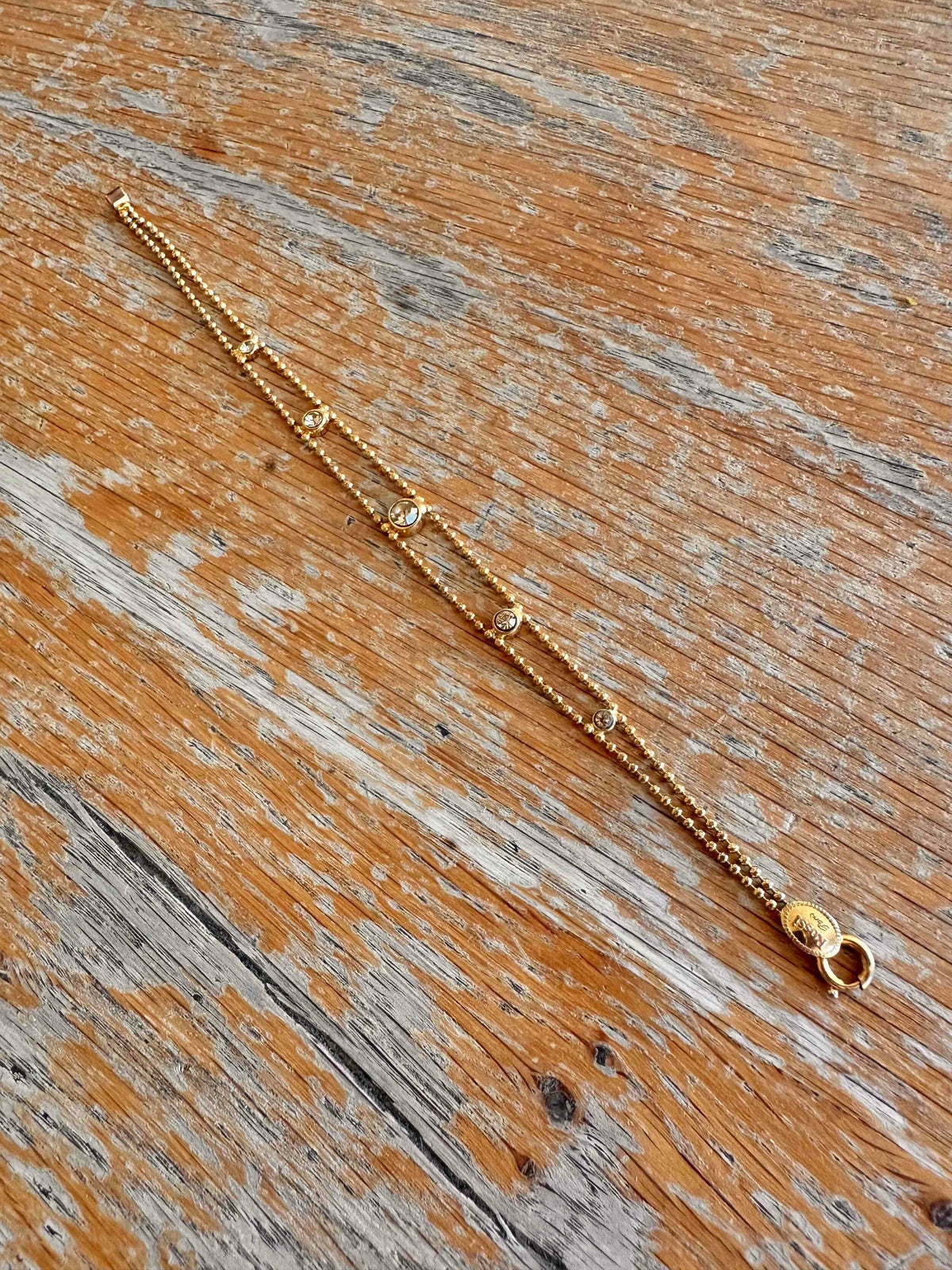 Prix unitaire parBracelet plaqué or et strass, en laiton plaqué or, double range chaîne boules, et strass ambrés, fabriqué en France, années 80s, fermoir a mousqueton. Longueur 17,5cm