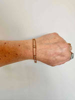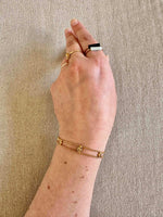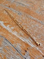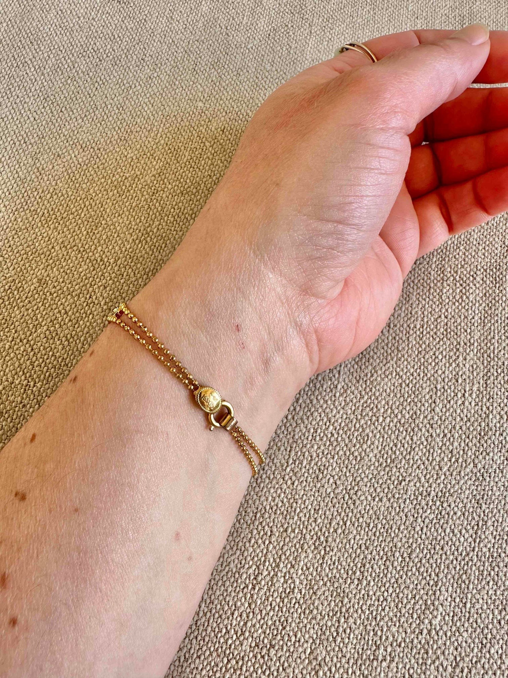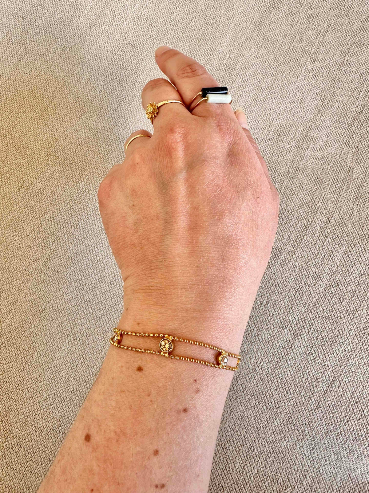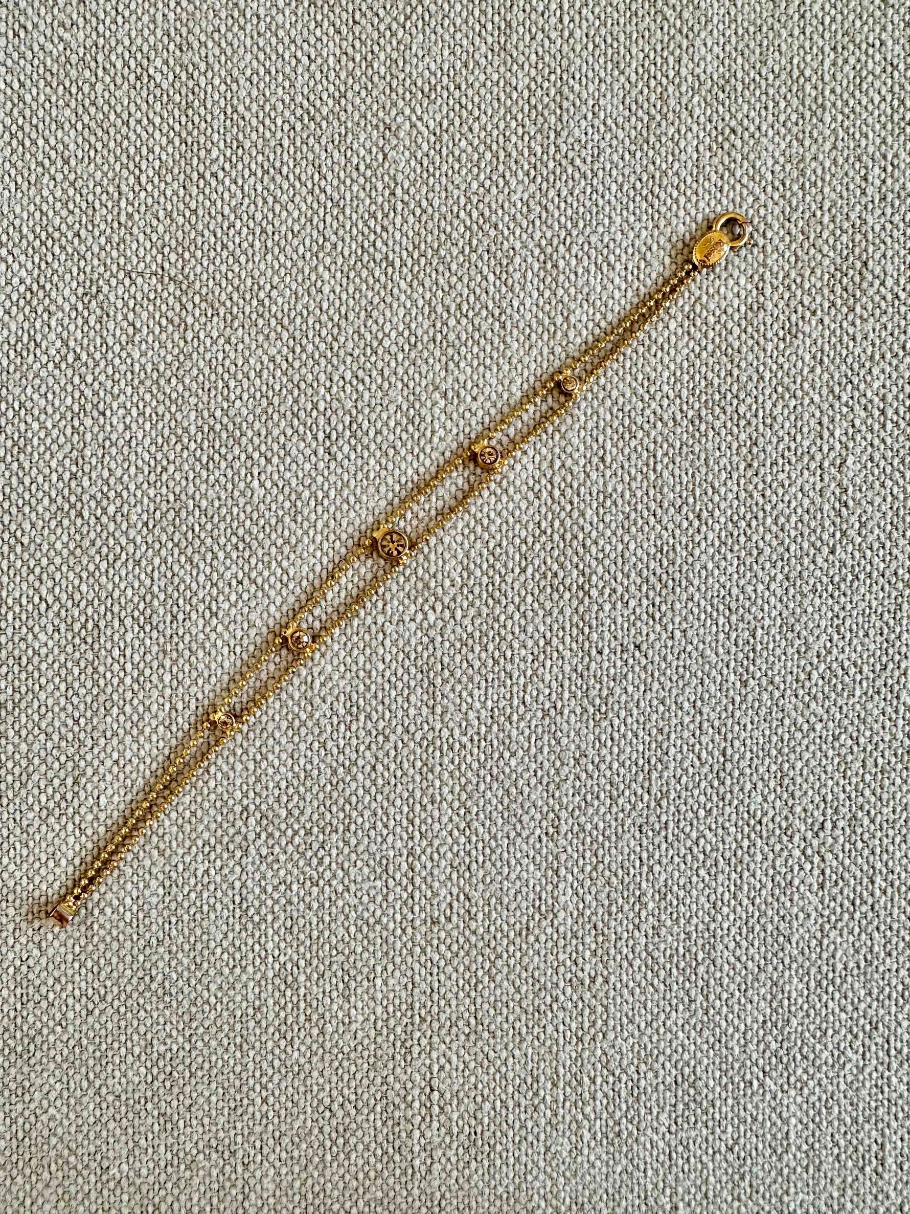 Prix unitaire parBracelet plaqué or et strass, en laiton plaqué or, double range chaîne boules, et strass ambrés, fabriqué en France, années 80s, fermoir a mousqueton. Longueur 17,5cm