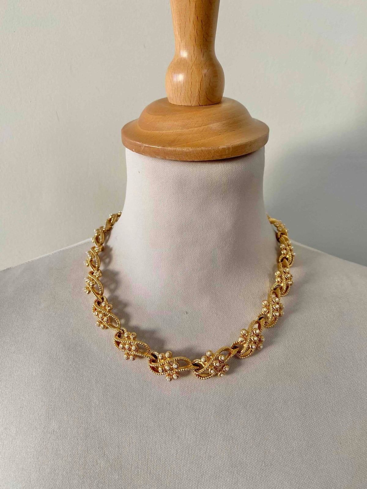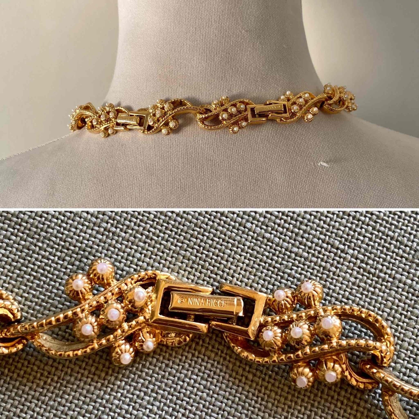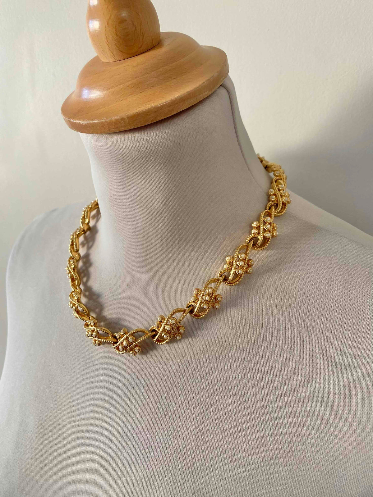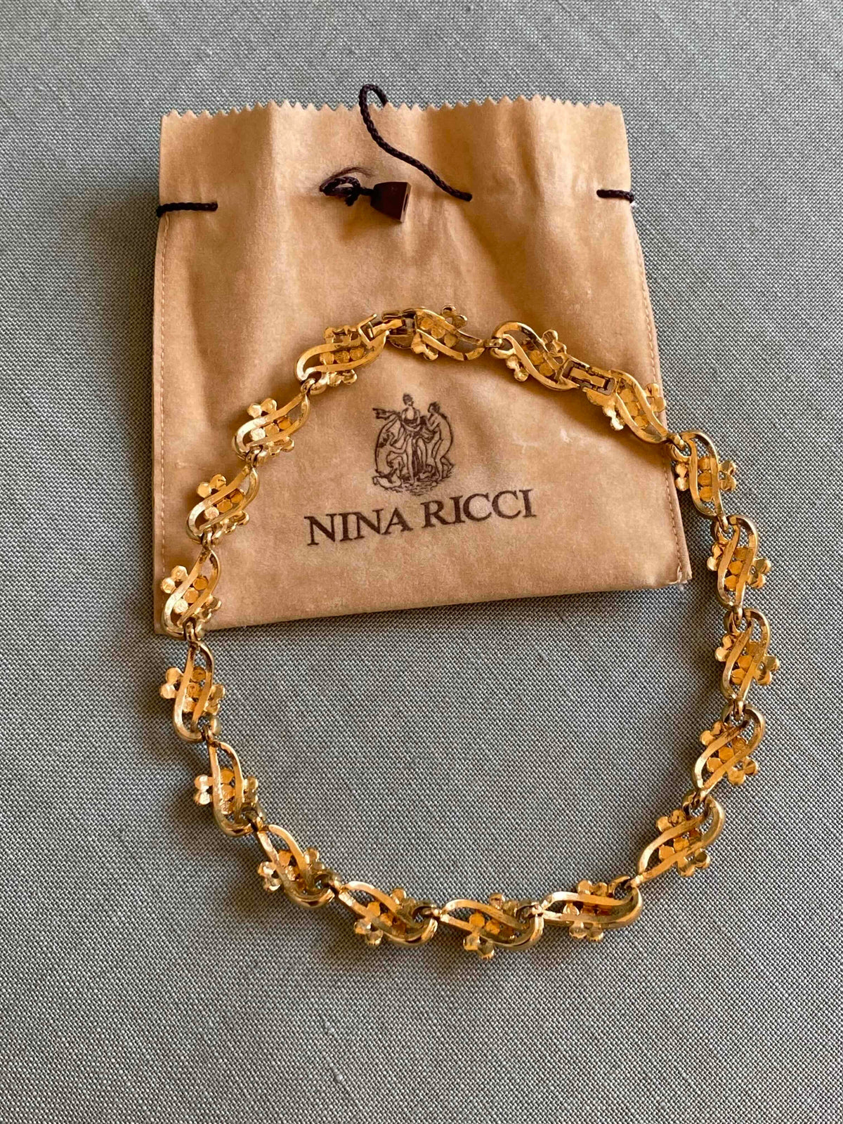 Prix unitaire parCollier filigrané Nina Ricci, ras de cou, en plaqué or et minis perles nacrées, motifs maillons fils torsadés fleuris, deux fermoir gravés Nina Ricci, fabriqué en France, longueur 42cm.