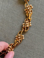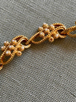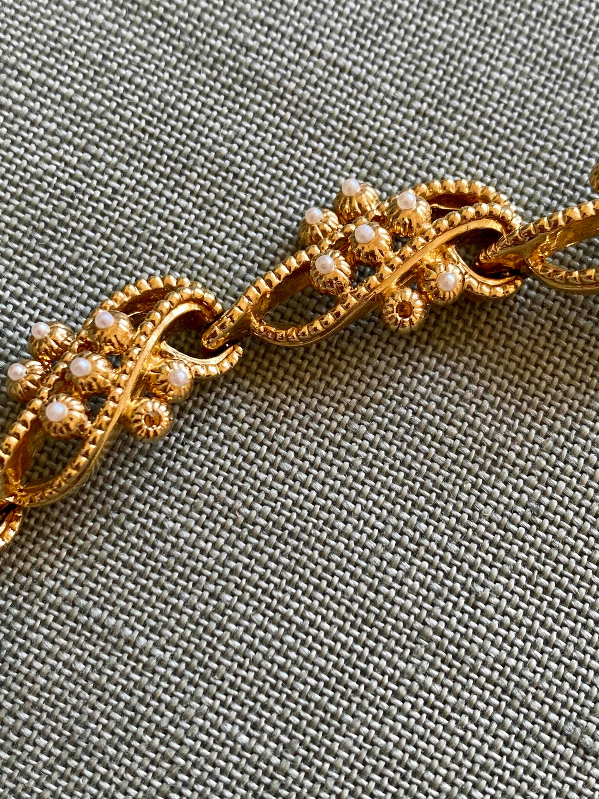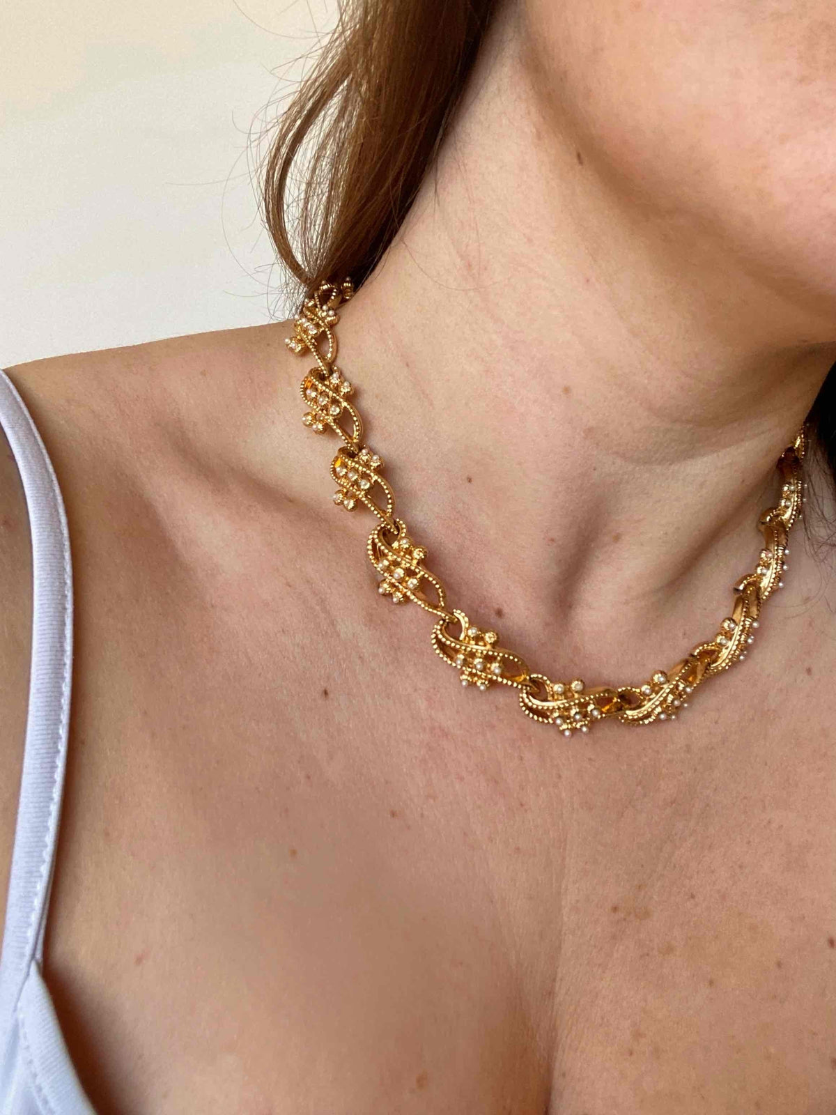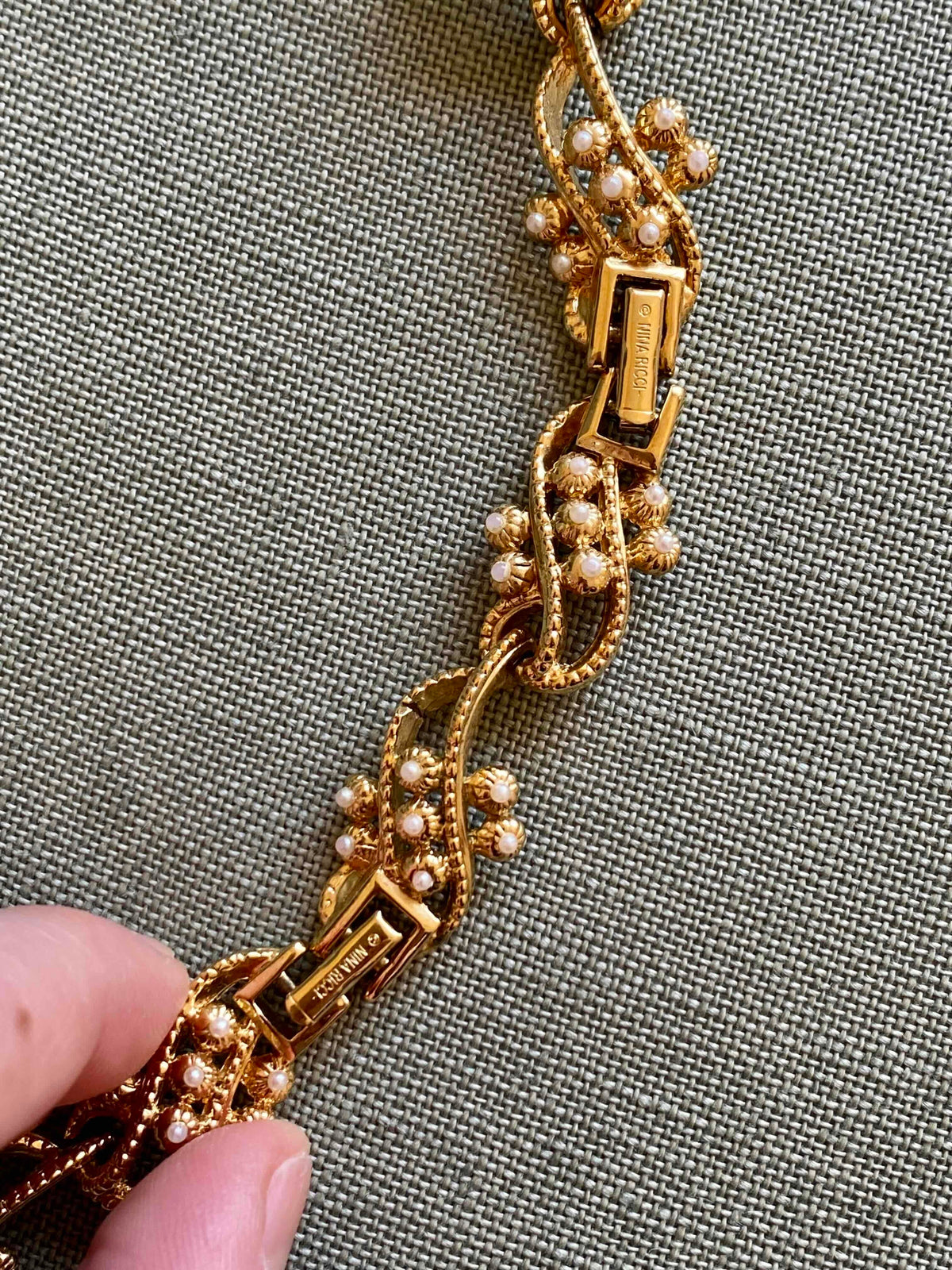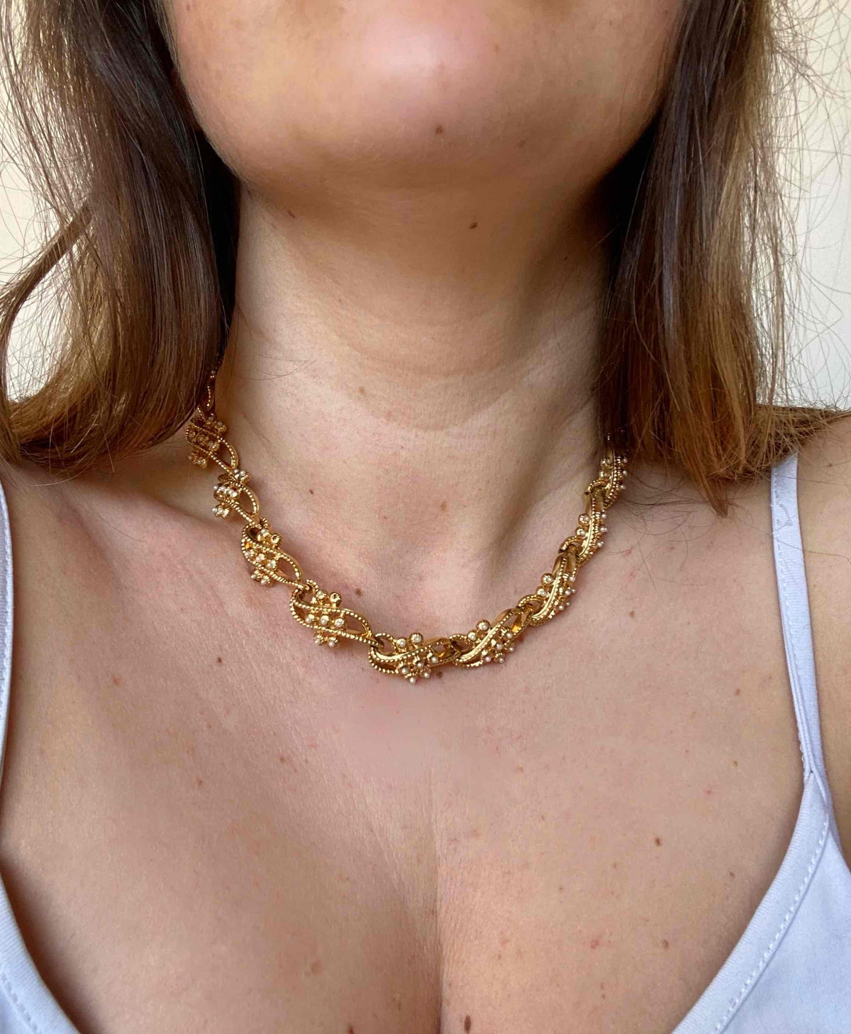 Prix unitaire parCollier filigrané Nina Ricci, ras de cou, en plaqué or et minis perles nacrées, motifs maillons fils torsadés fleuris, deux fermoir gravés Nina Ricci, fabriqué en France, longueur 42cm.