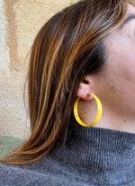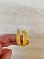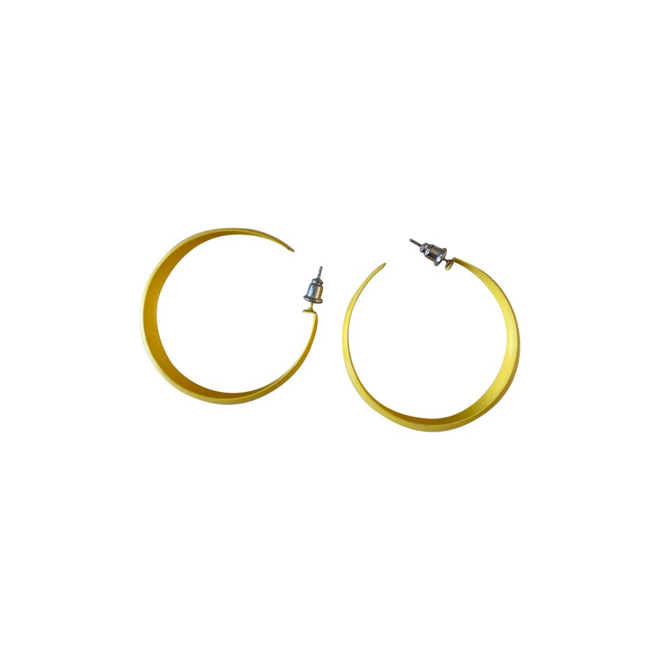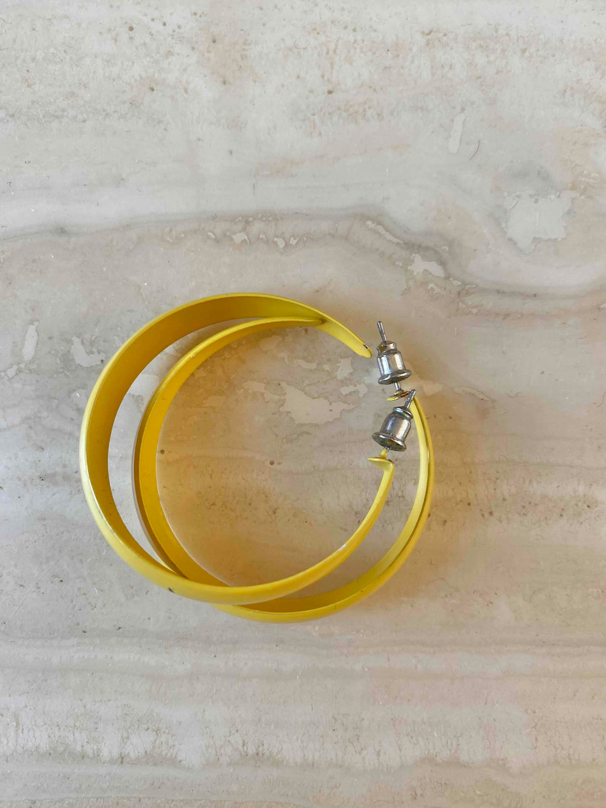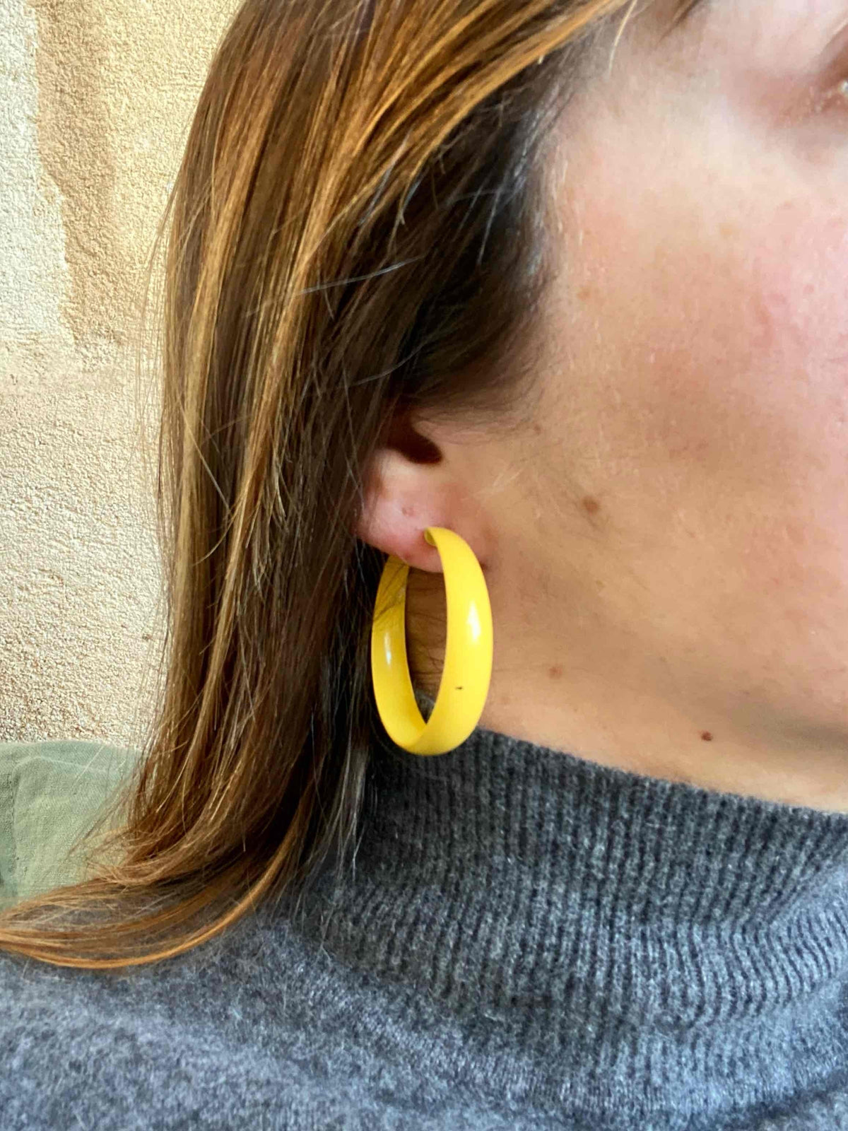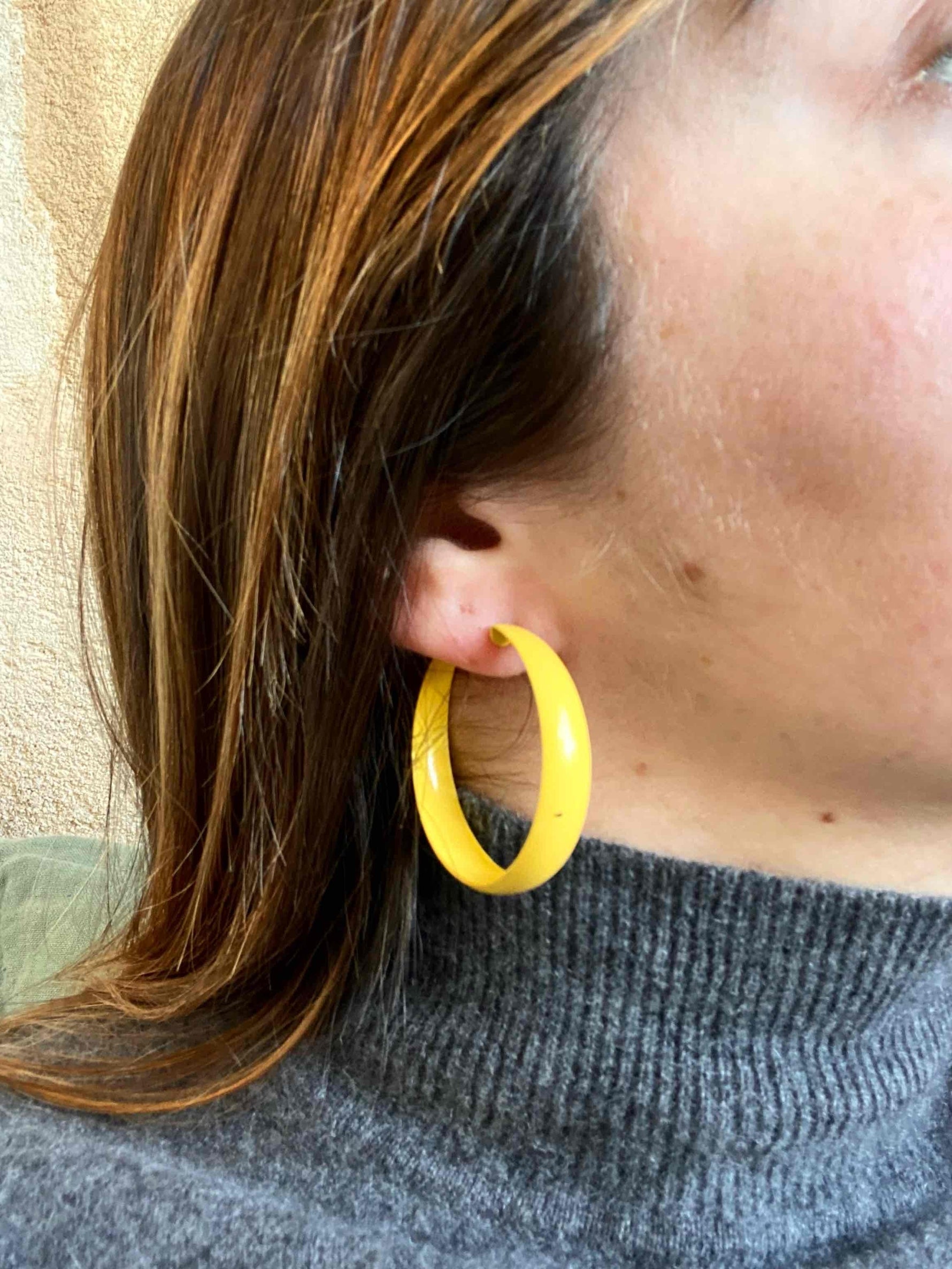 Prix unitaire parCréoles 70’s en laiton émaillé jaune peint, oreilles percées, diamètre 4cm.