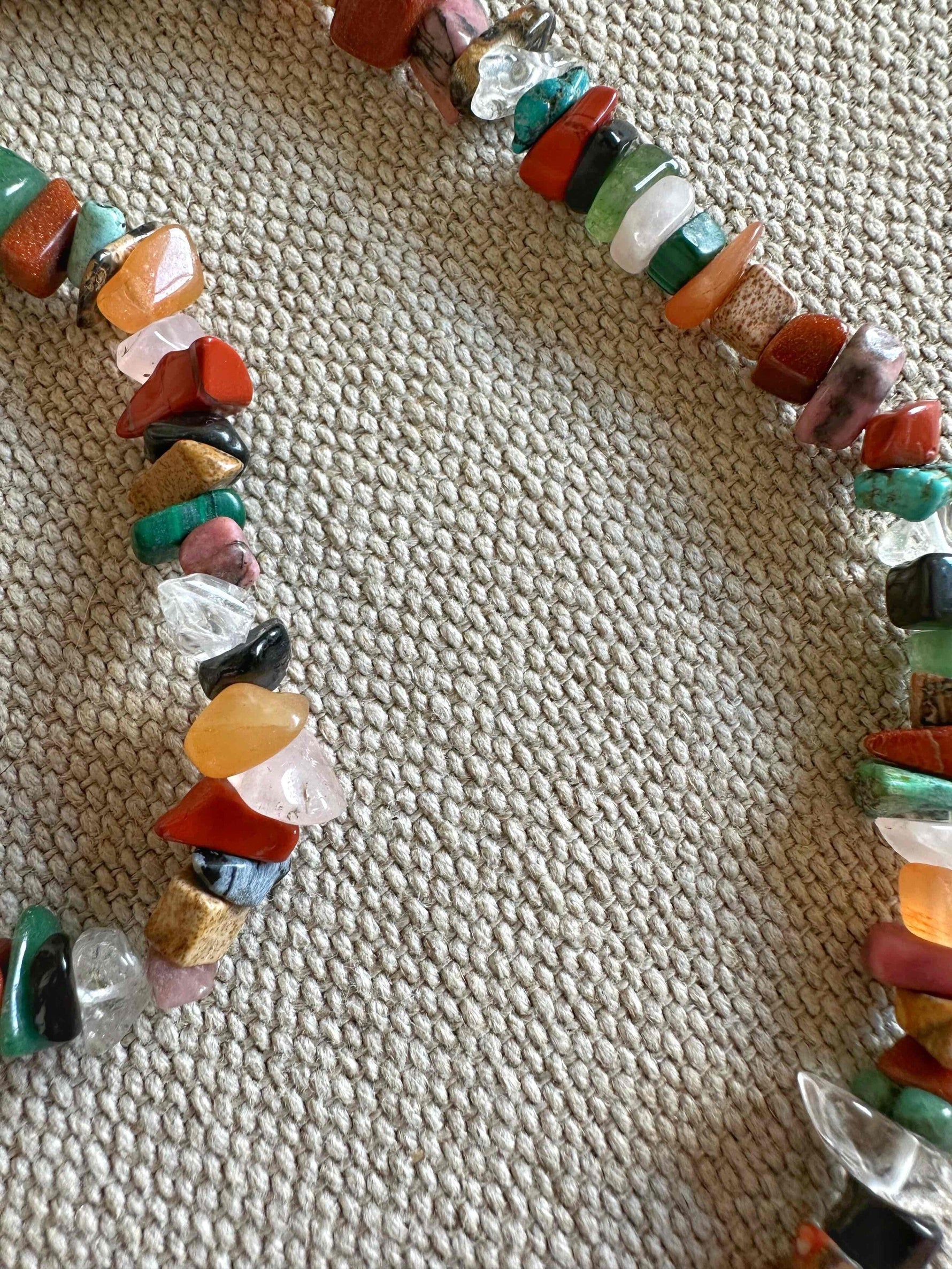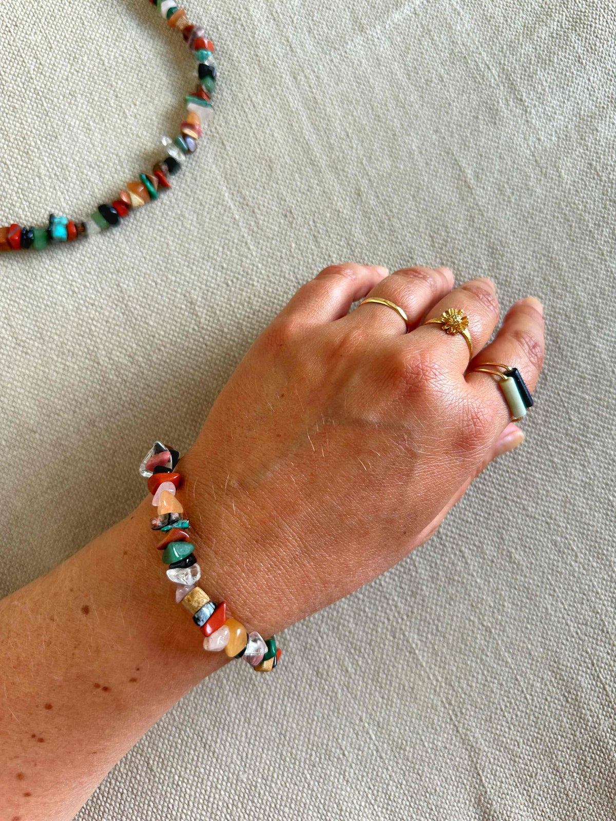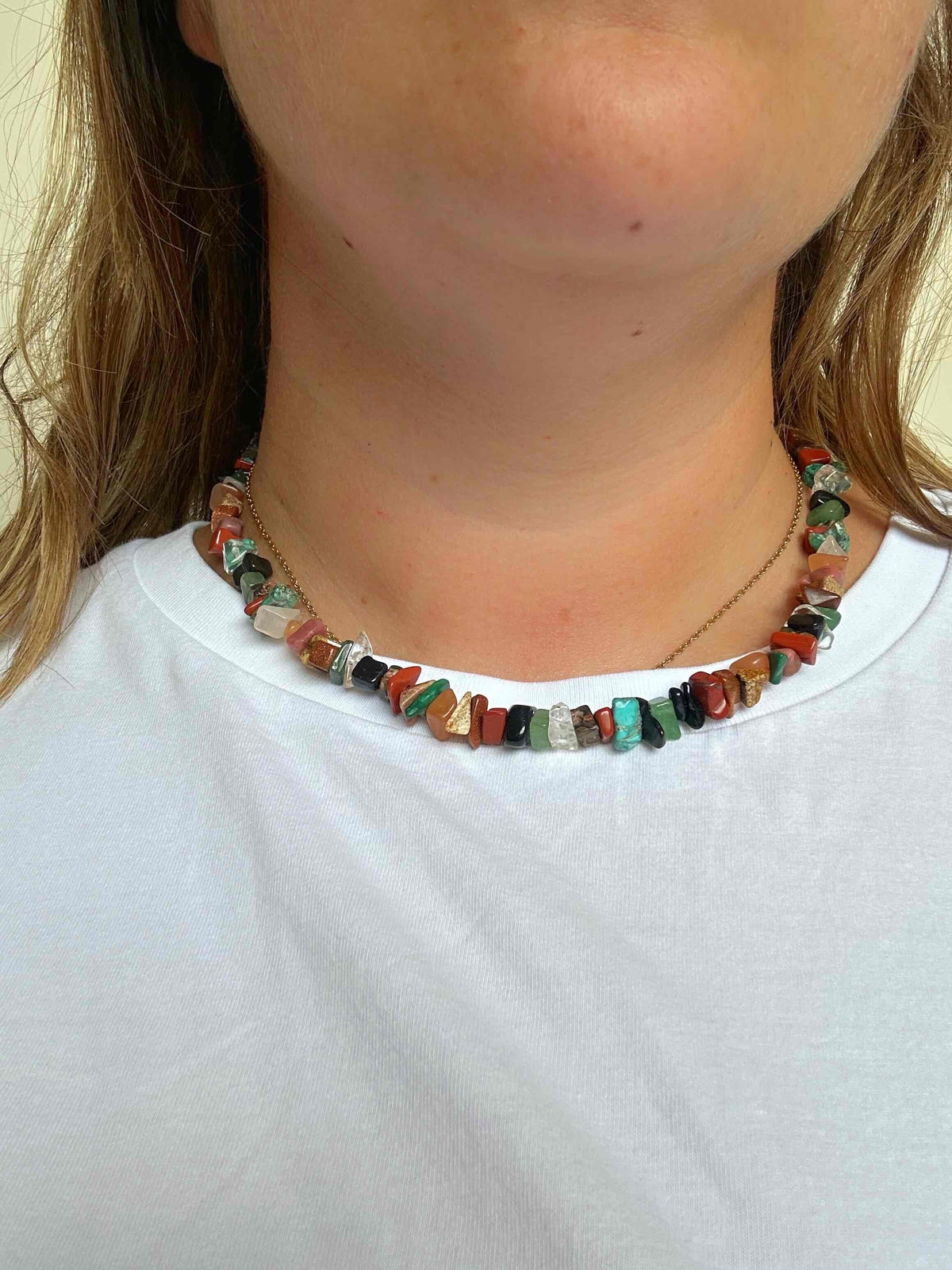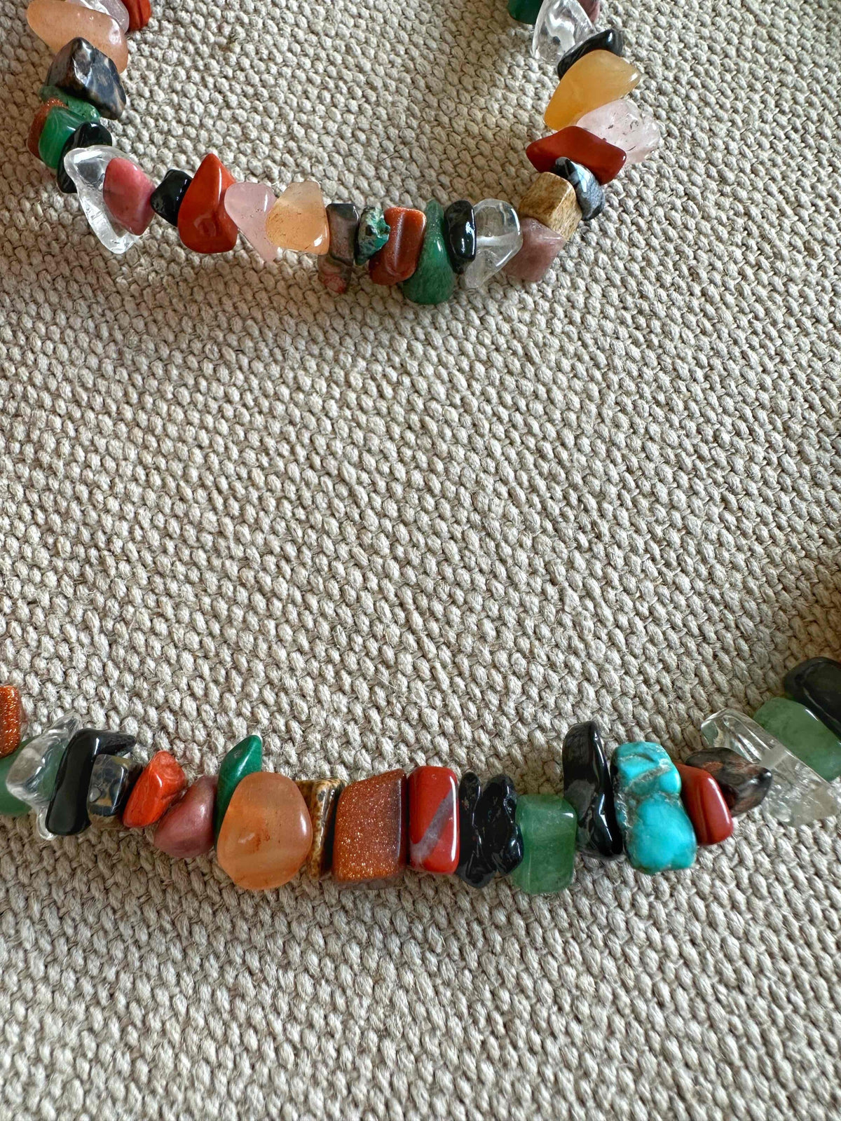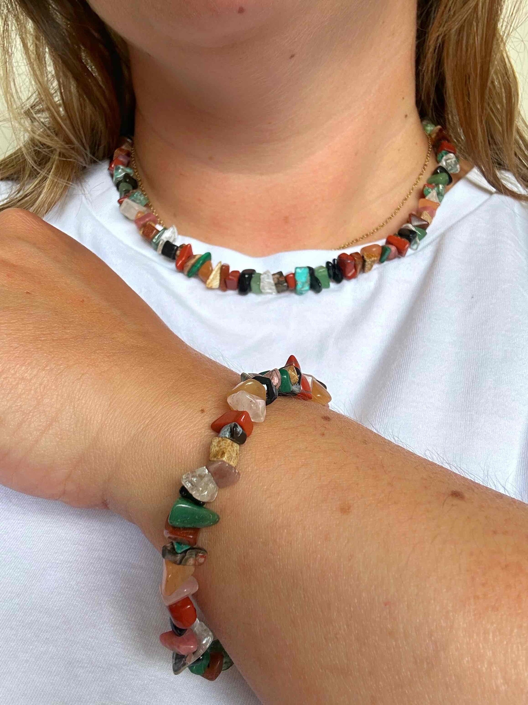 Prix unitaire parParure collier et bracelet en pierres véritables, multicolores, malachite, pierre de sable, jaspes, turquoises. Fabriqué en France, années 90s, longueur collier 45cm, longueur bracelet 21cm.
