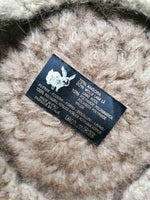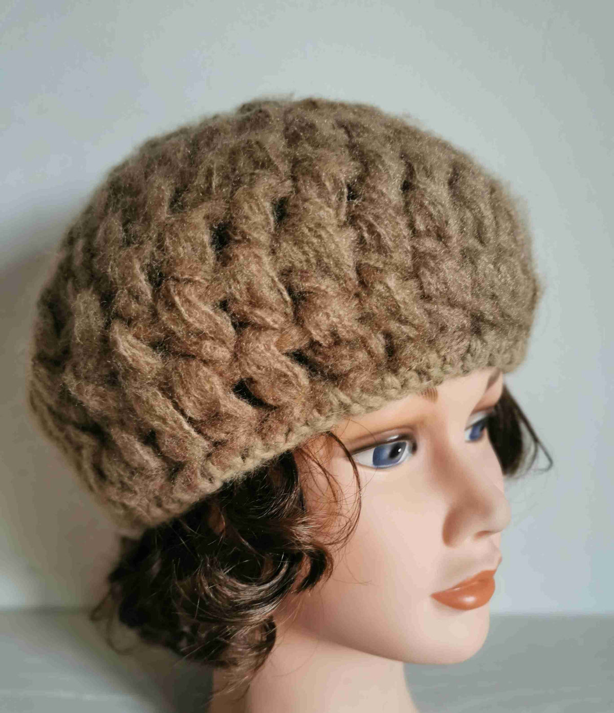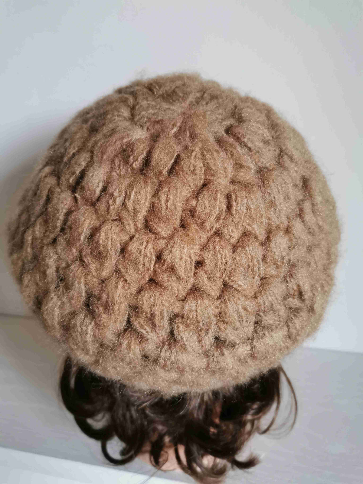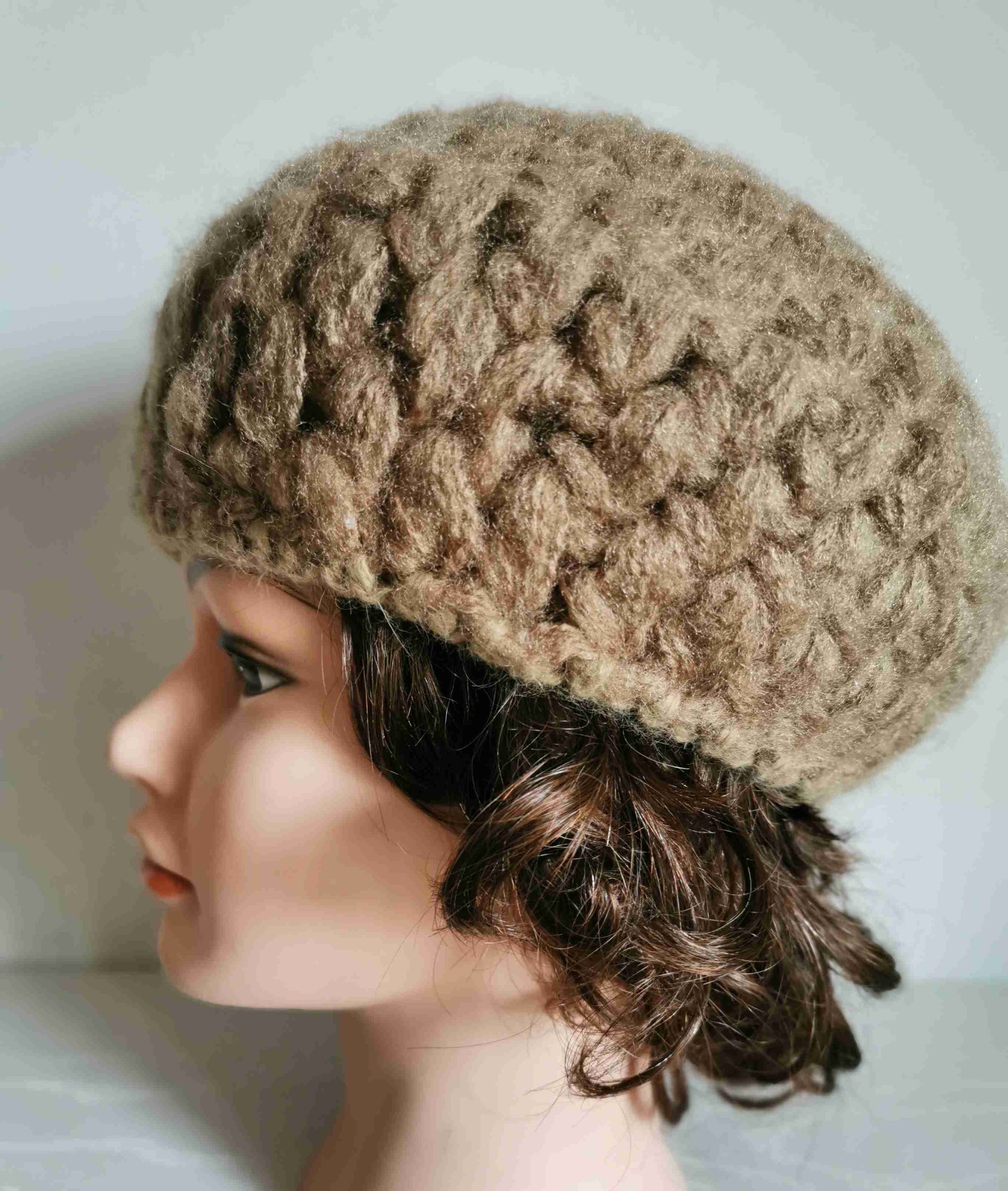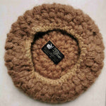 Béret en angora et laine Made in Italy. Grosse maille fantaisie de couleur beige /noisette. Lavable à la main. Taille unique