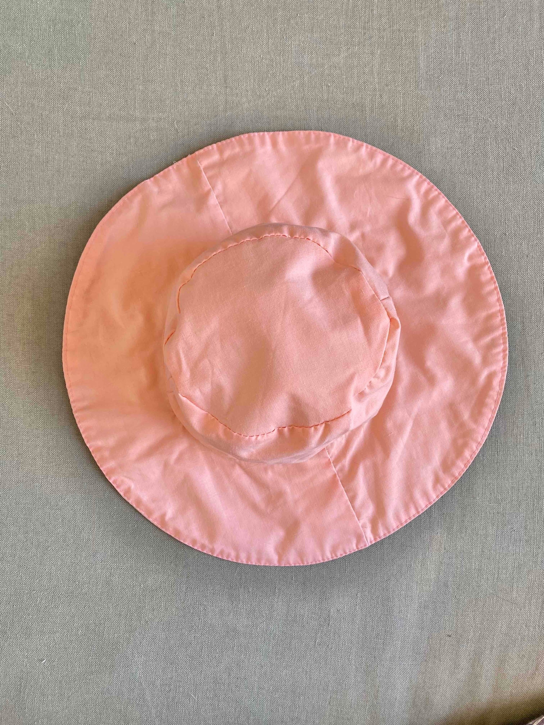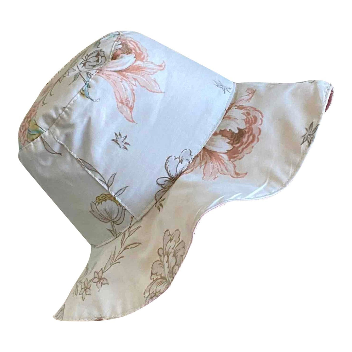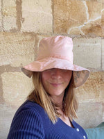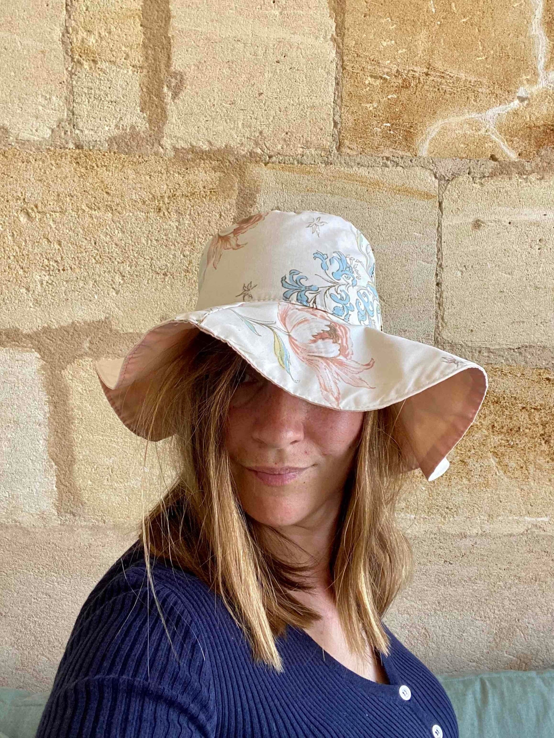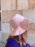 Bob réversible à fleurs en coton imprimé fleurs tapissières et coton rose pastel, tour de tête 56cm / bords 10cm / hauteur 12cm.