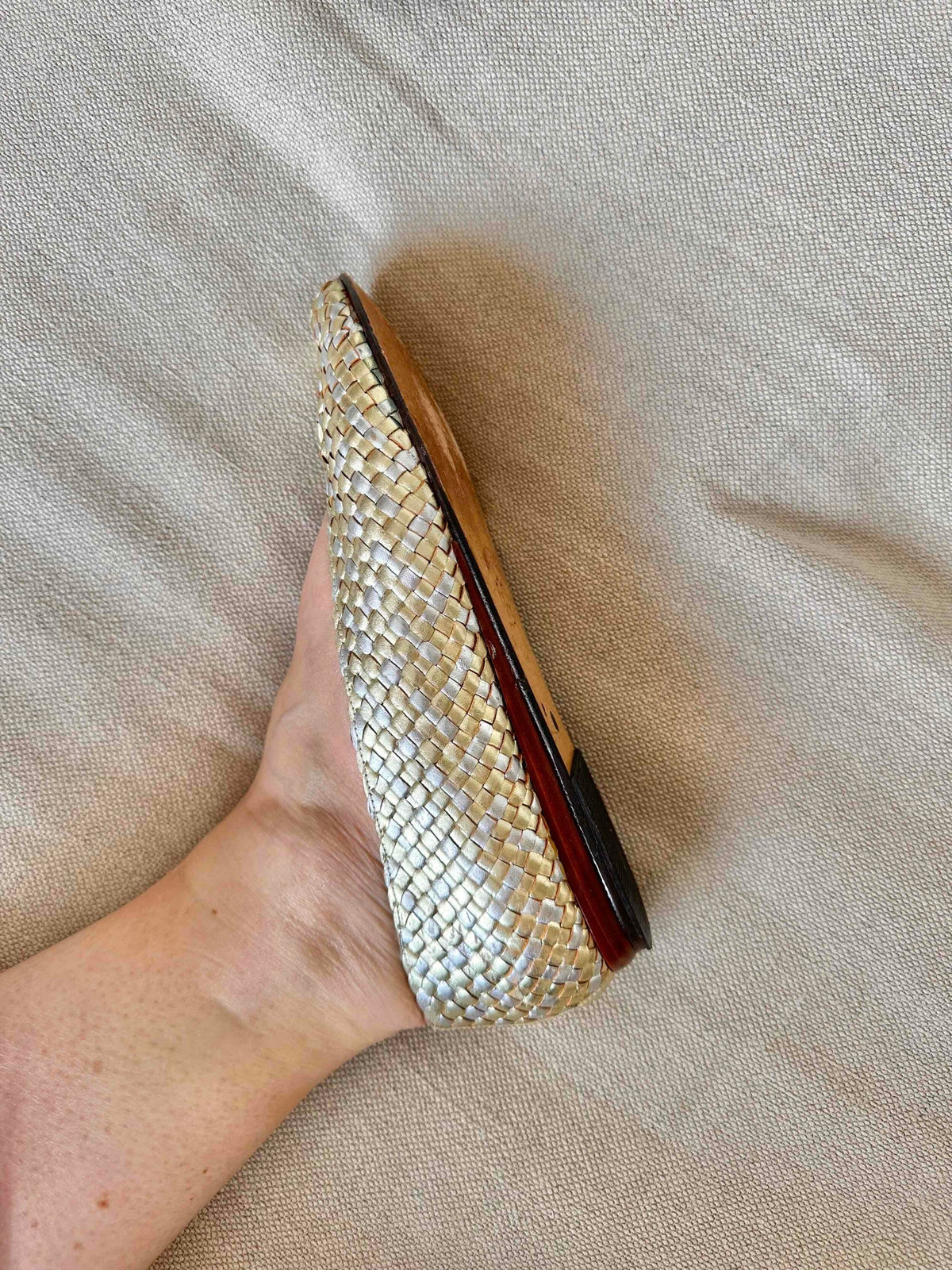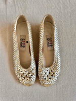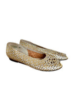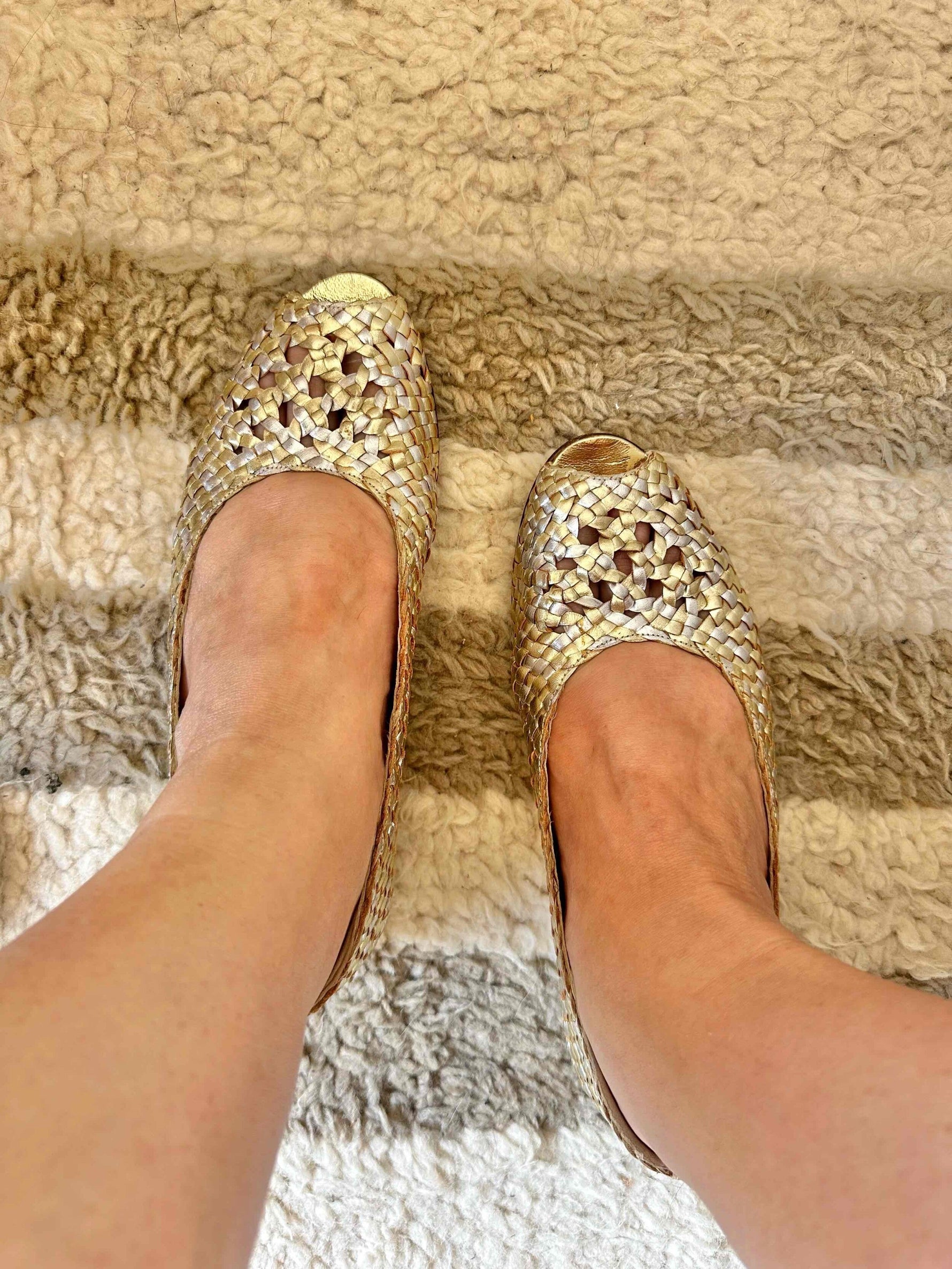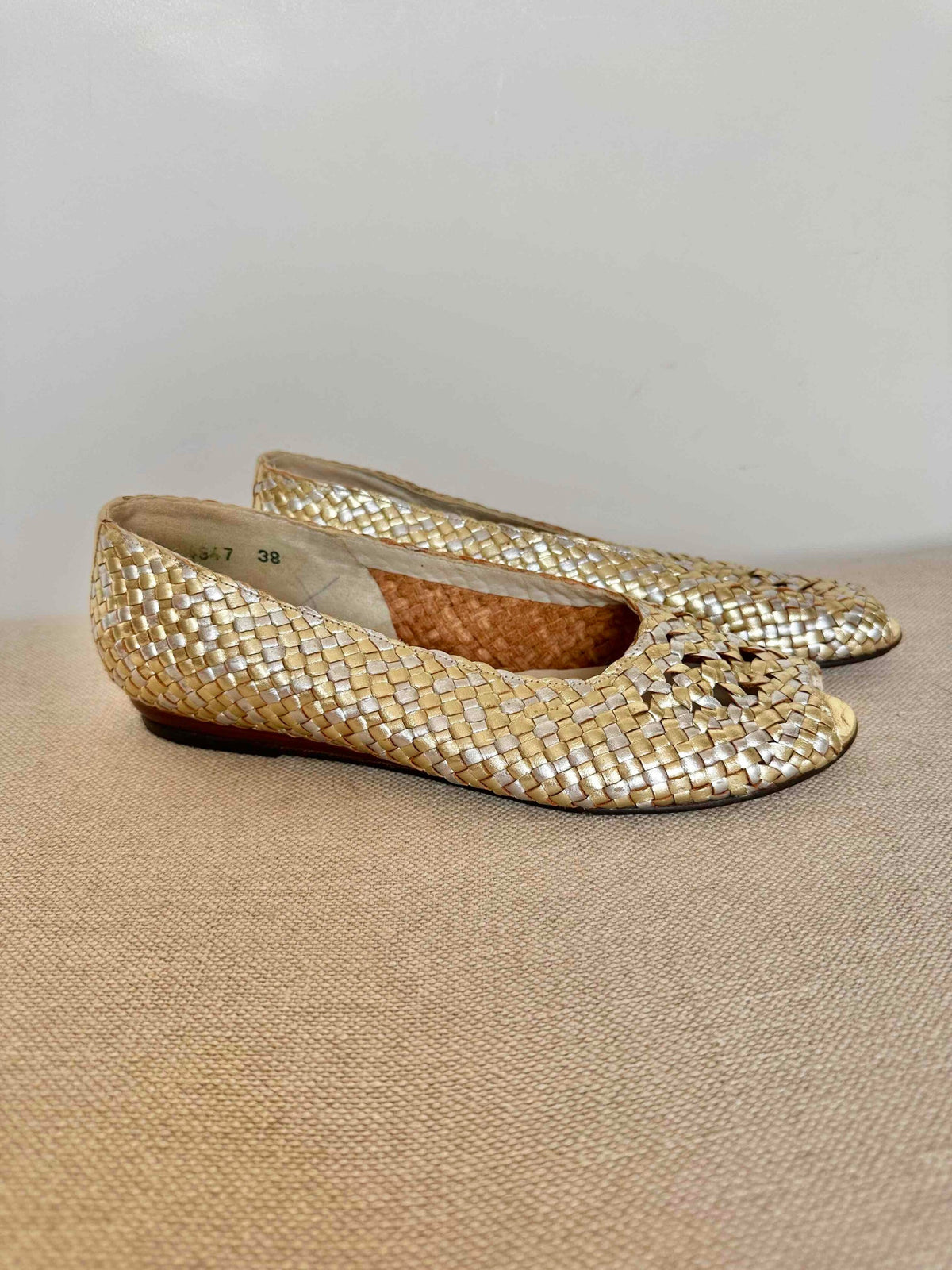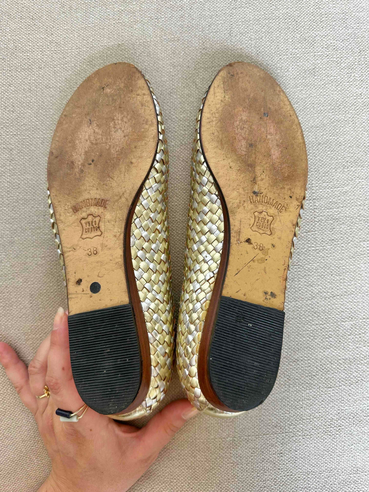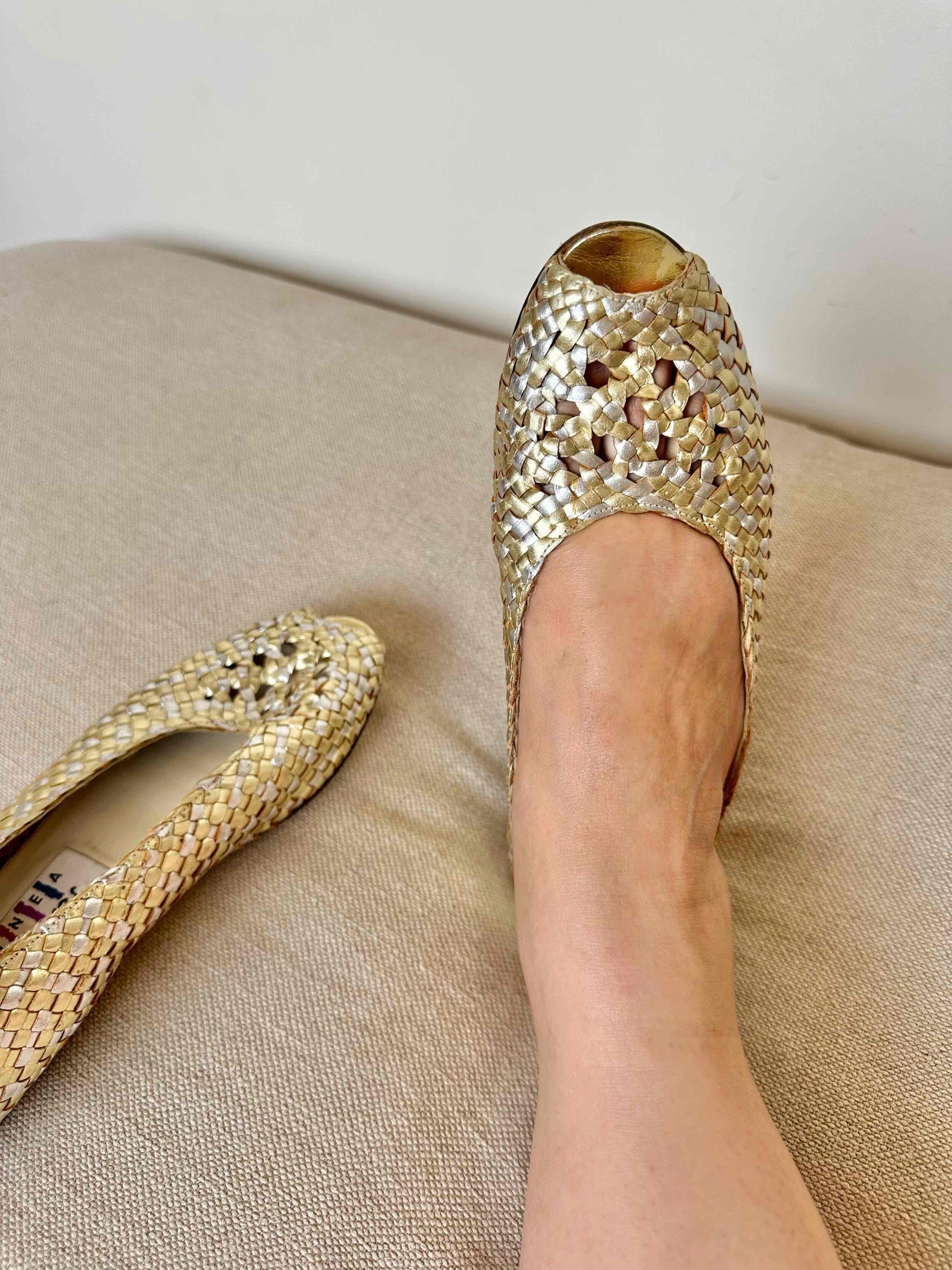 Prix unitaire parBallerines en cuir tressé, cuir tressé doré et argenté, bout ouvert open-toe, mini talon compensé de 1cm, fabriquées en Italie, pointure 38, longueur semelles 24cm.