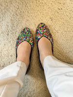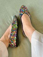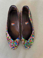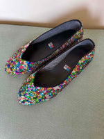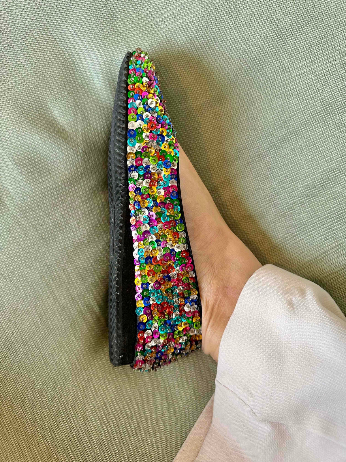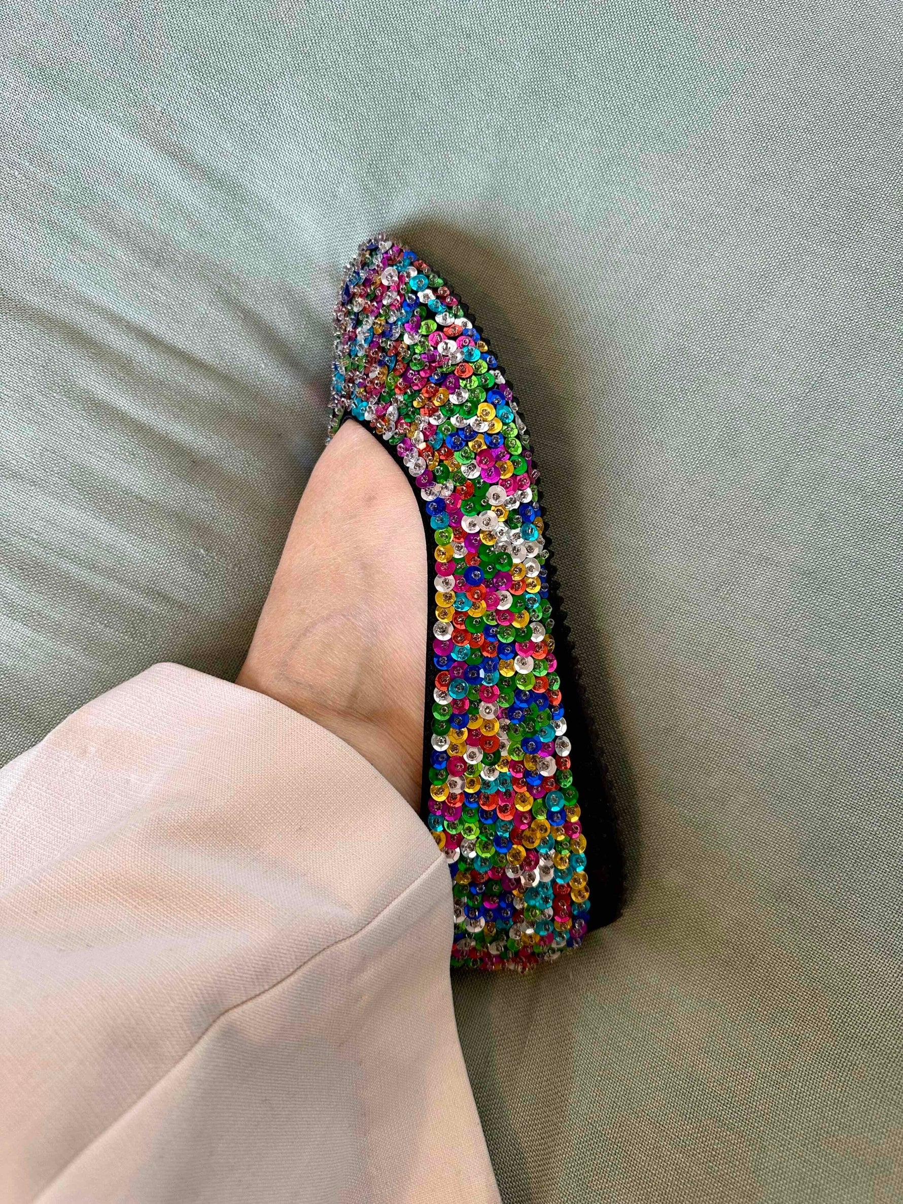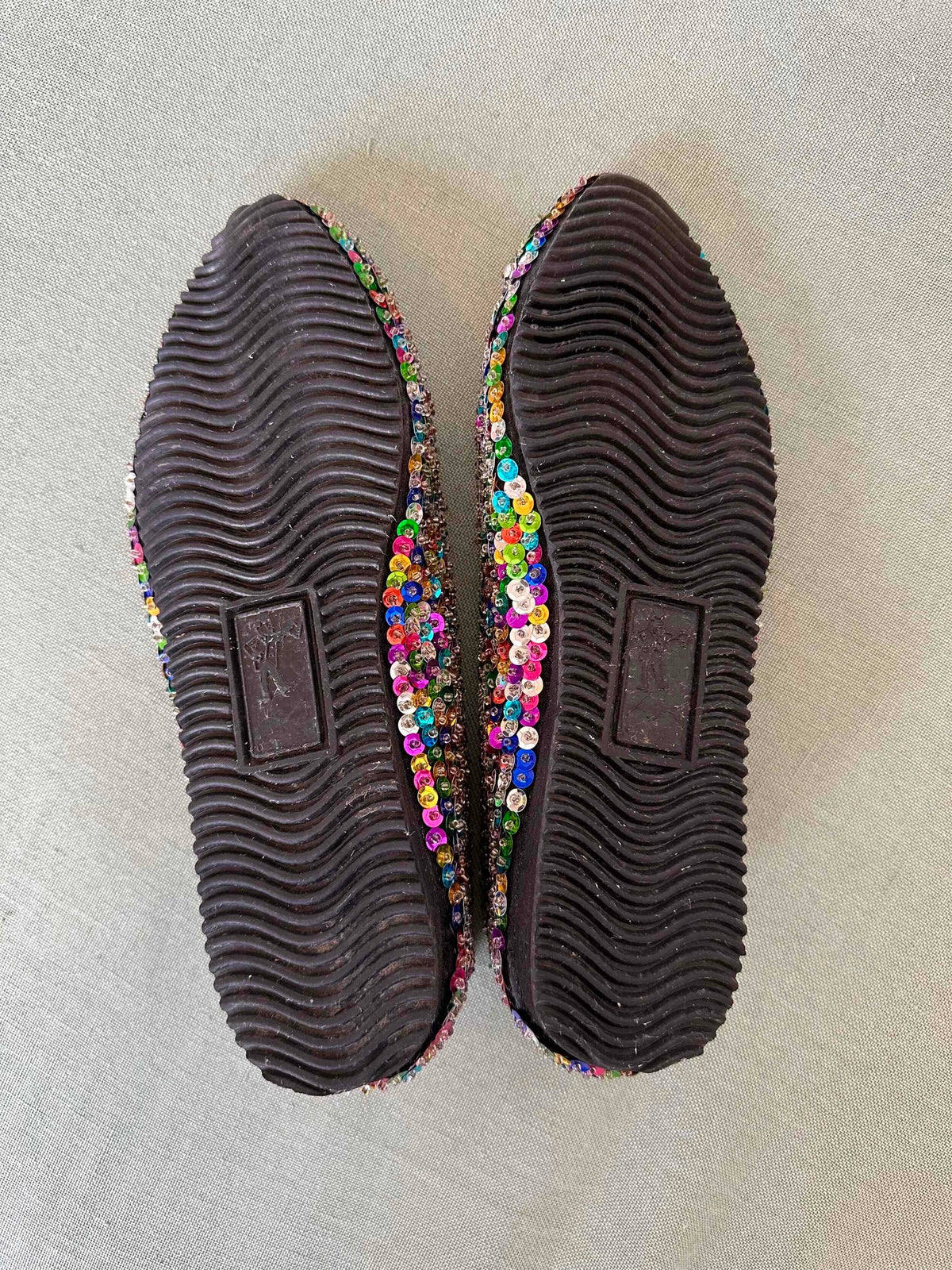 Prix unitaire parBallerines à sequins 80’s, sequins metallisés multicolores, découpe en pointe sur le dessus, bordure en satin noir, semelle en gomme noire et talon en mousse à legere plateforme de 1cm, pointure 37 actuelle, longueur semelle 24cm.