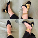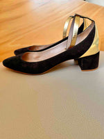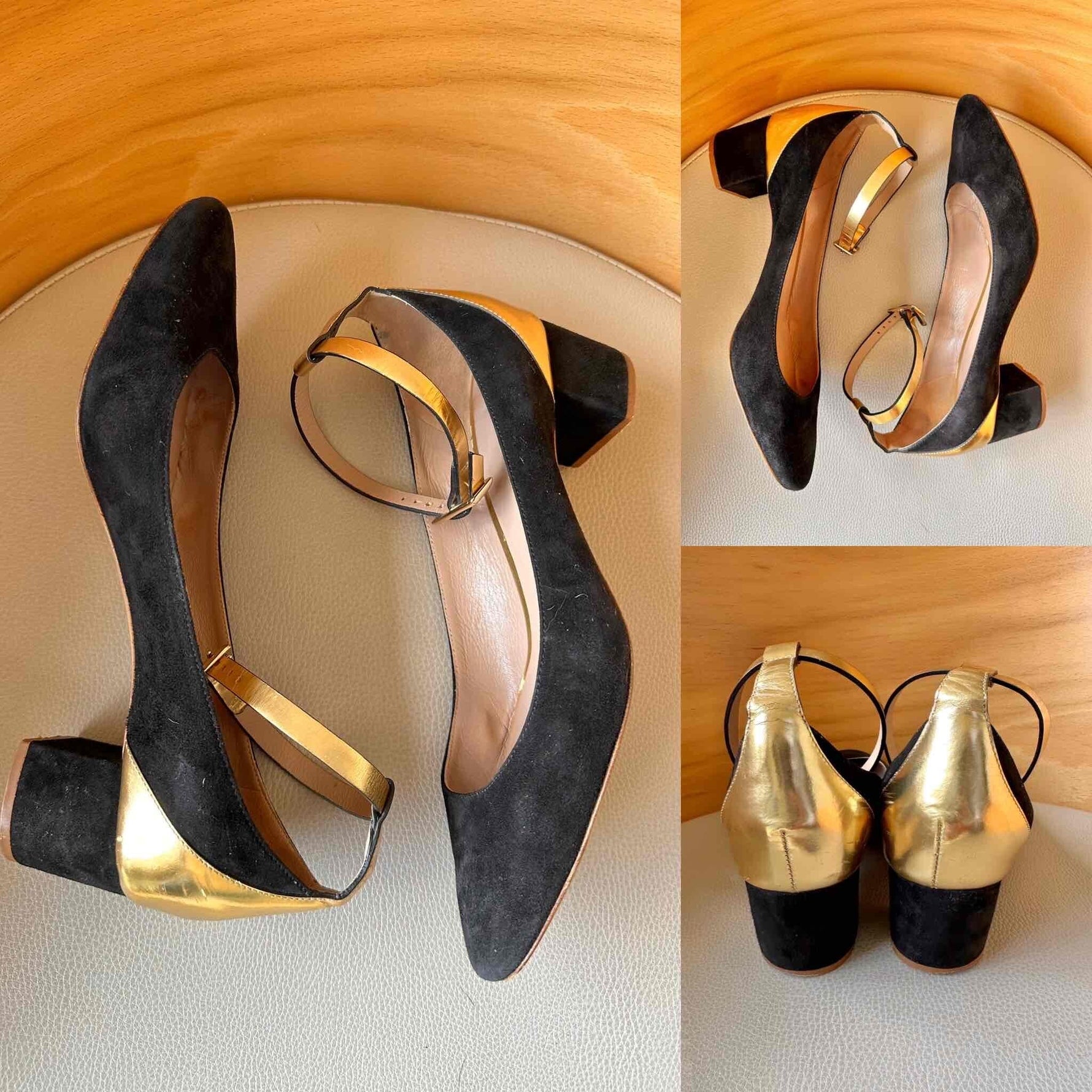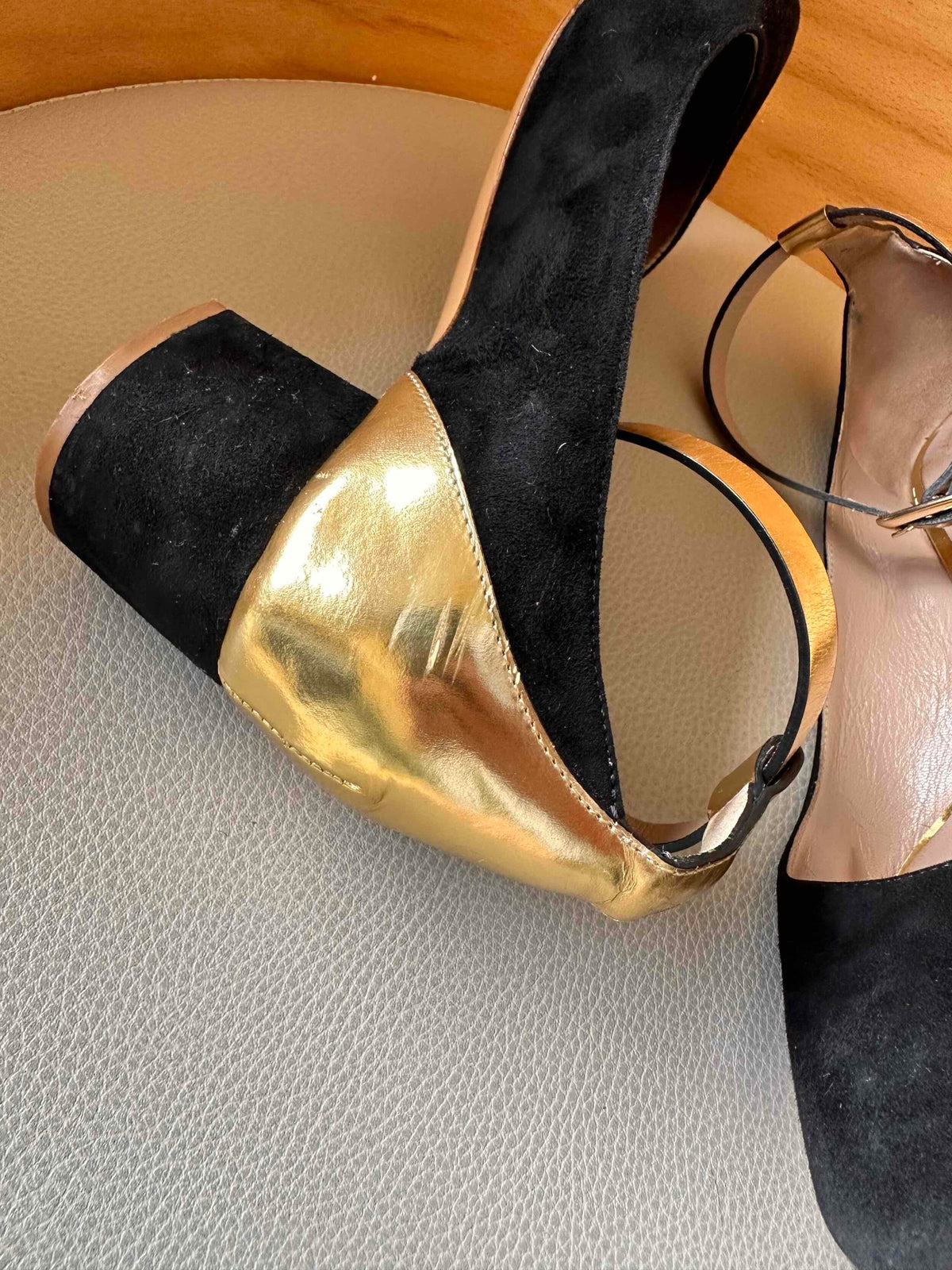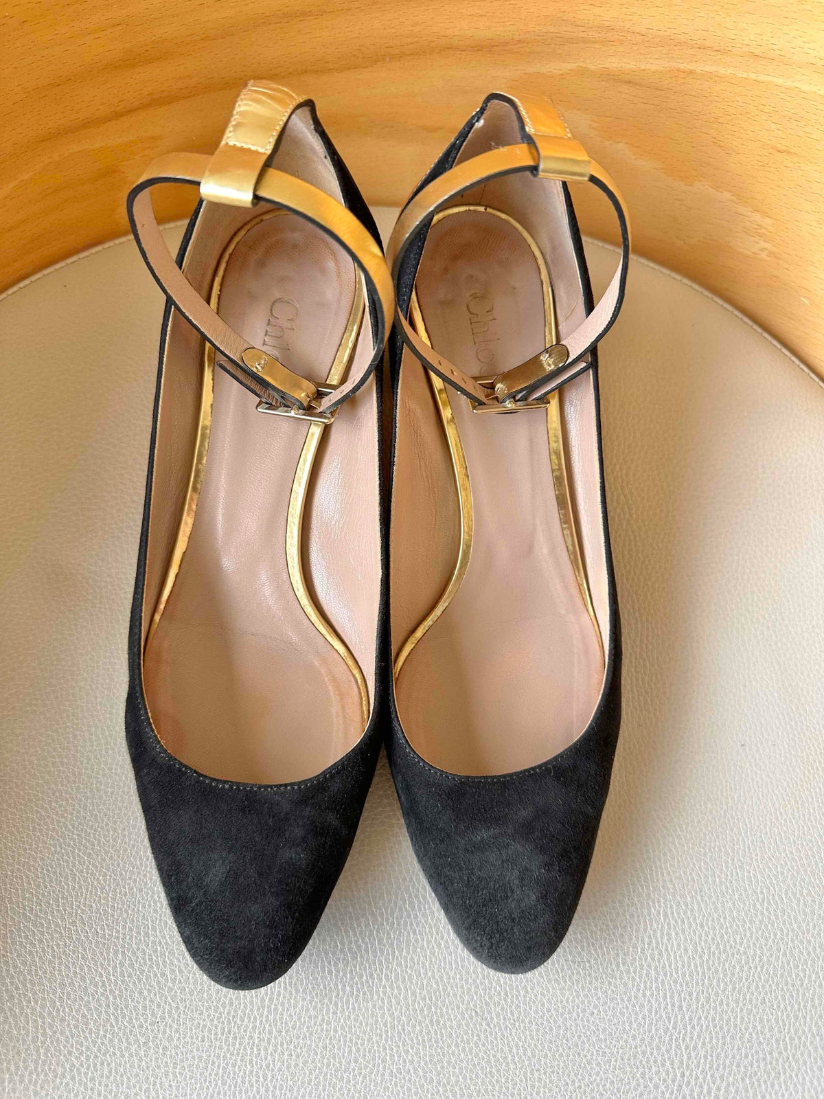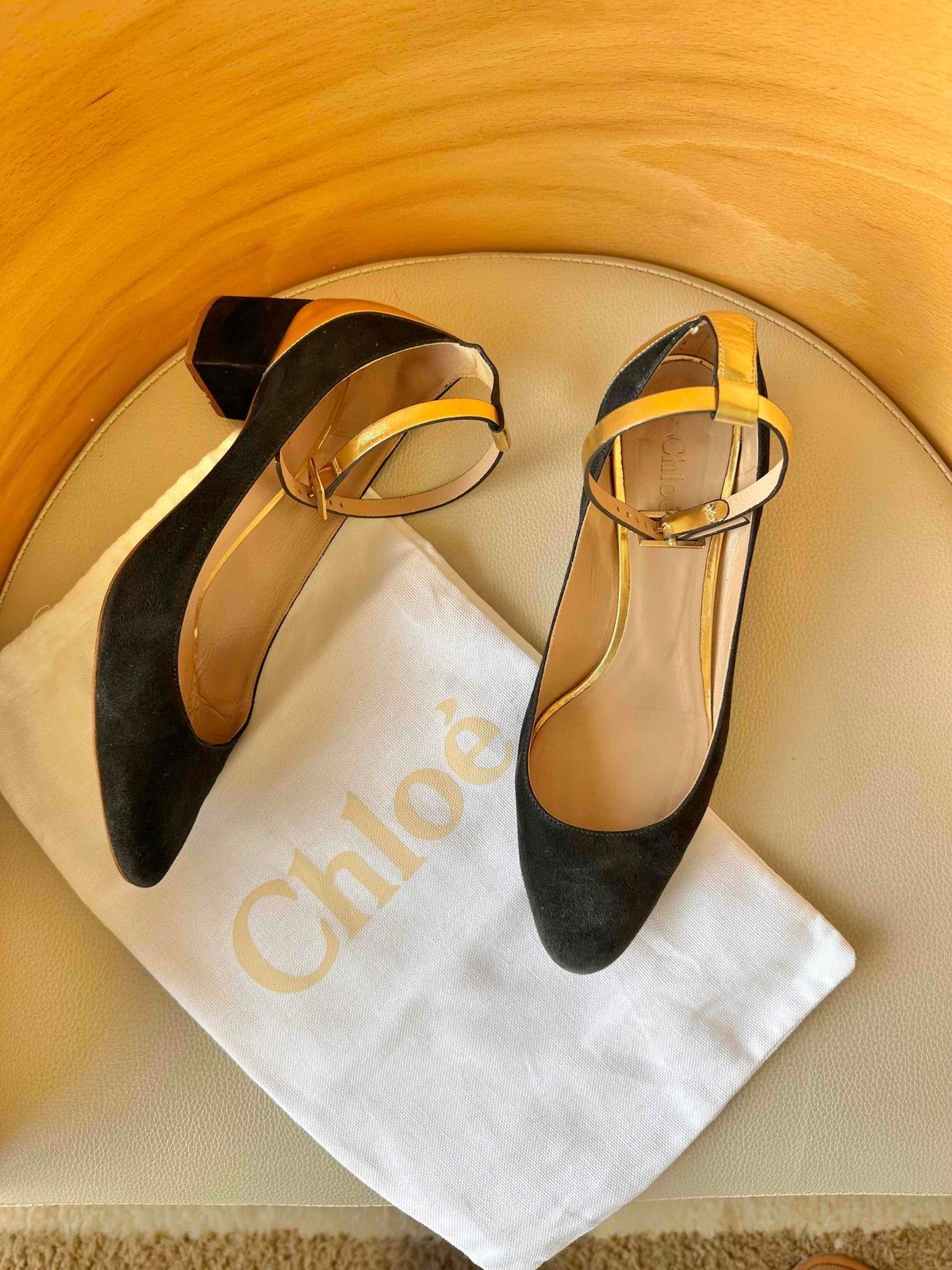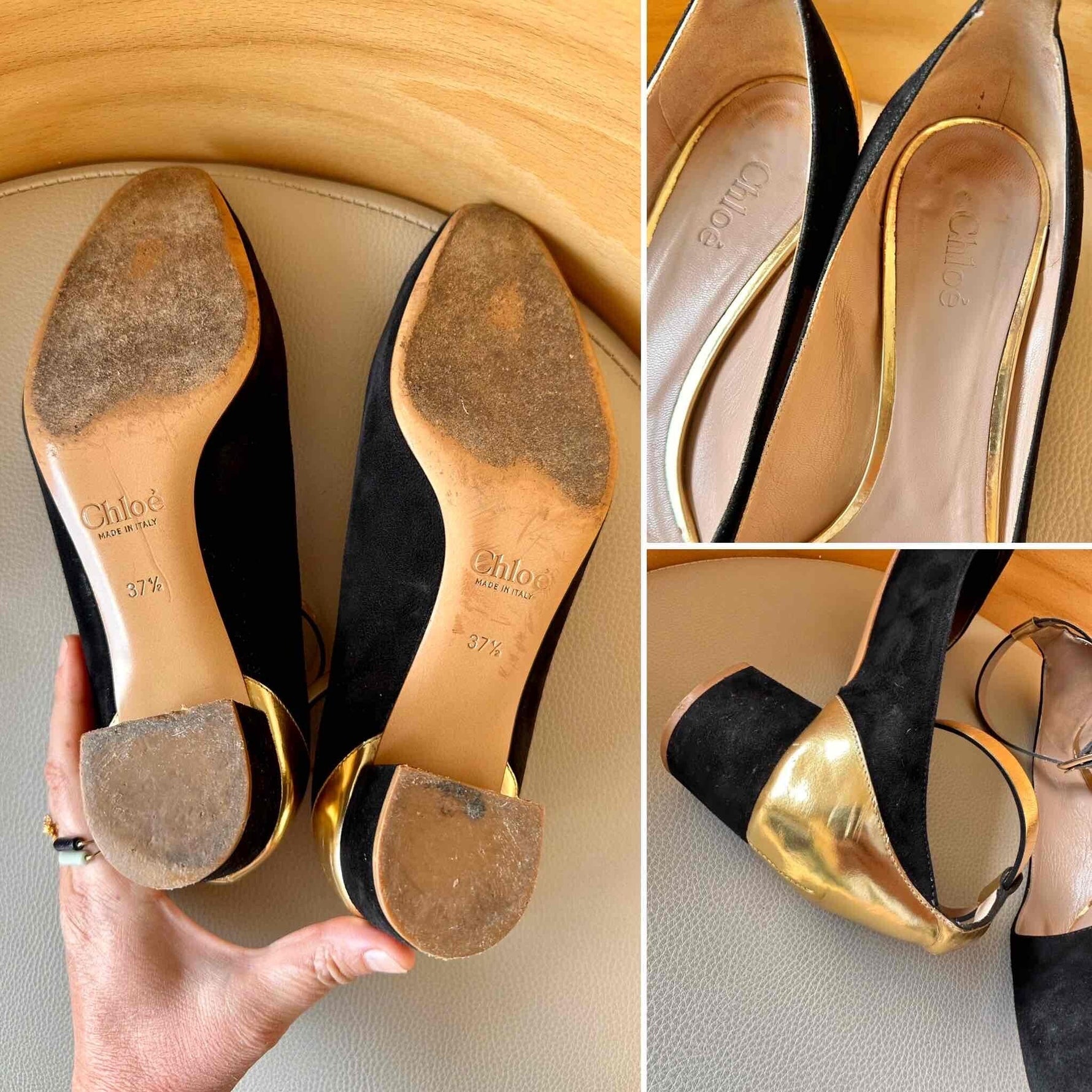 Prix unitaire parBallerines talons Chloé, en daim veau velours noir, cuir miroir doré à l’arrière et bride cheville à boucle, découpe échancrée au décolleté qui laisse apparaître la naissance des orteils, talons de 4 cm, fabriquées en Italie, pointure 37 et 37,5, portées ici sur une personne chaussant 37.