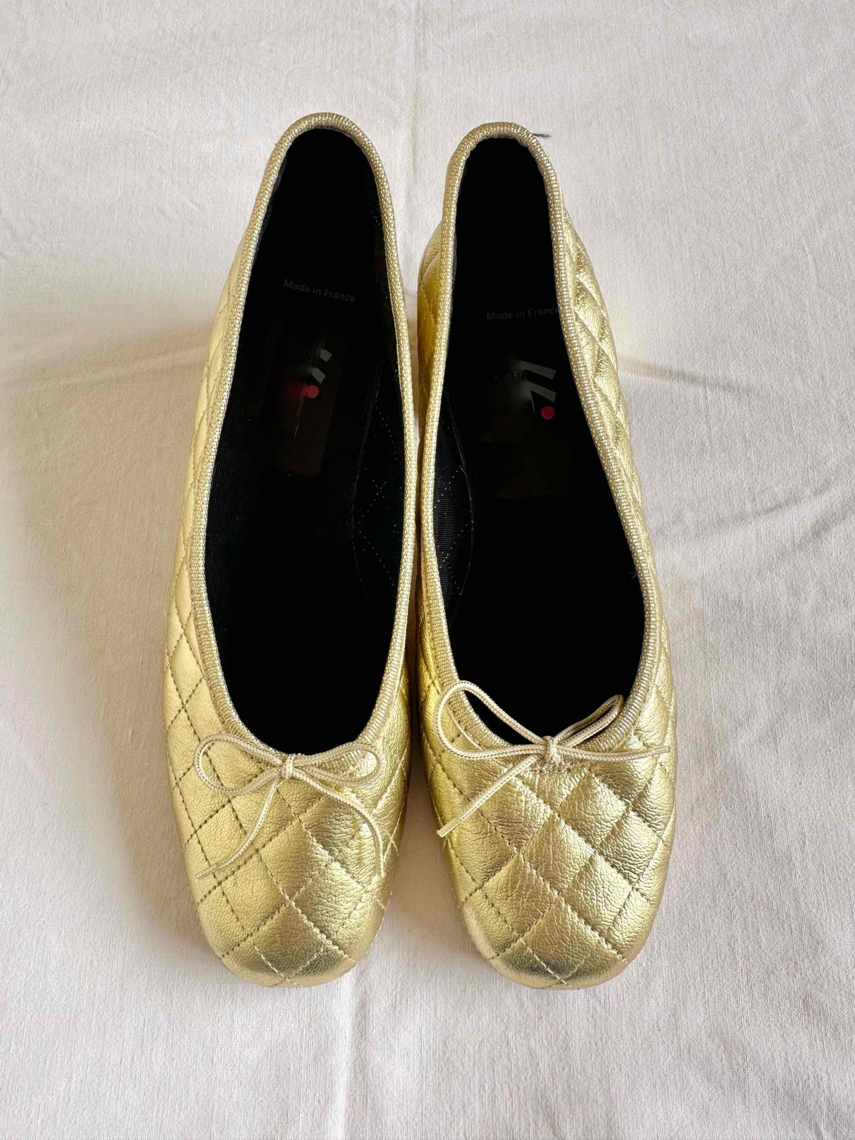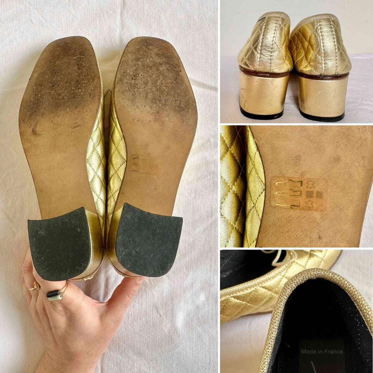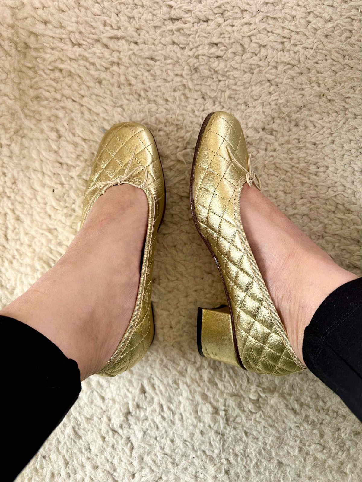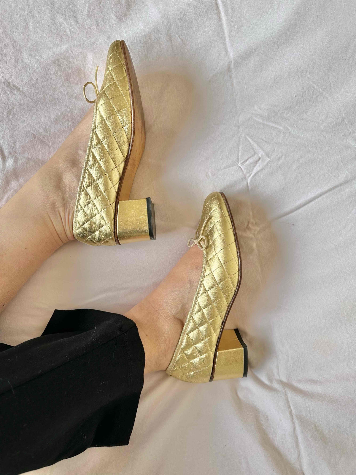 Ballerines en cuir doré, à talons, en cuir matelassé, croisillons dorés, bordures en ruban lurex doré, petit nœud, fabriquées en France, pointure 38, longueur semelle 24,5 cm, hauteur talons 5 cm.