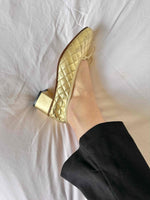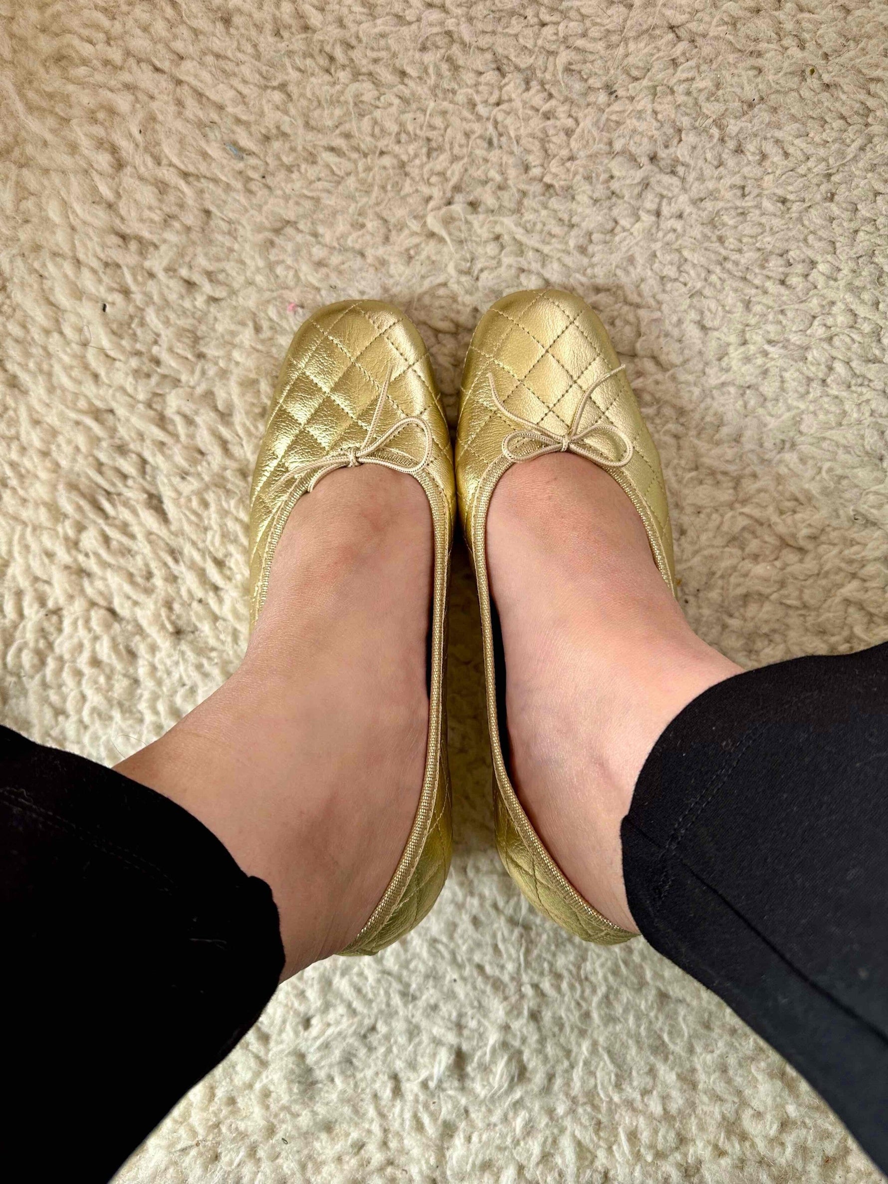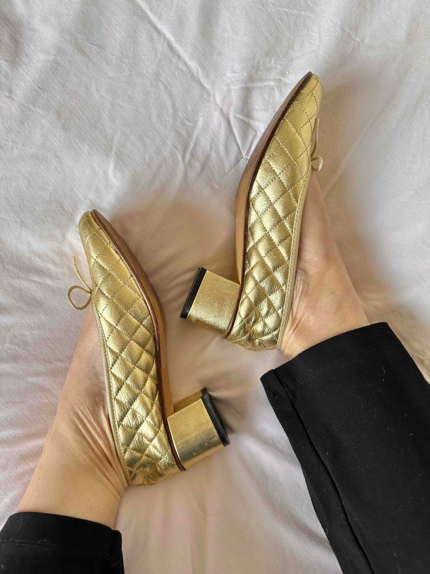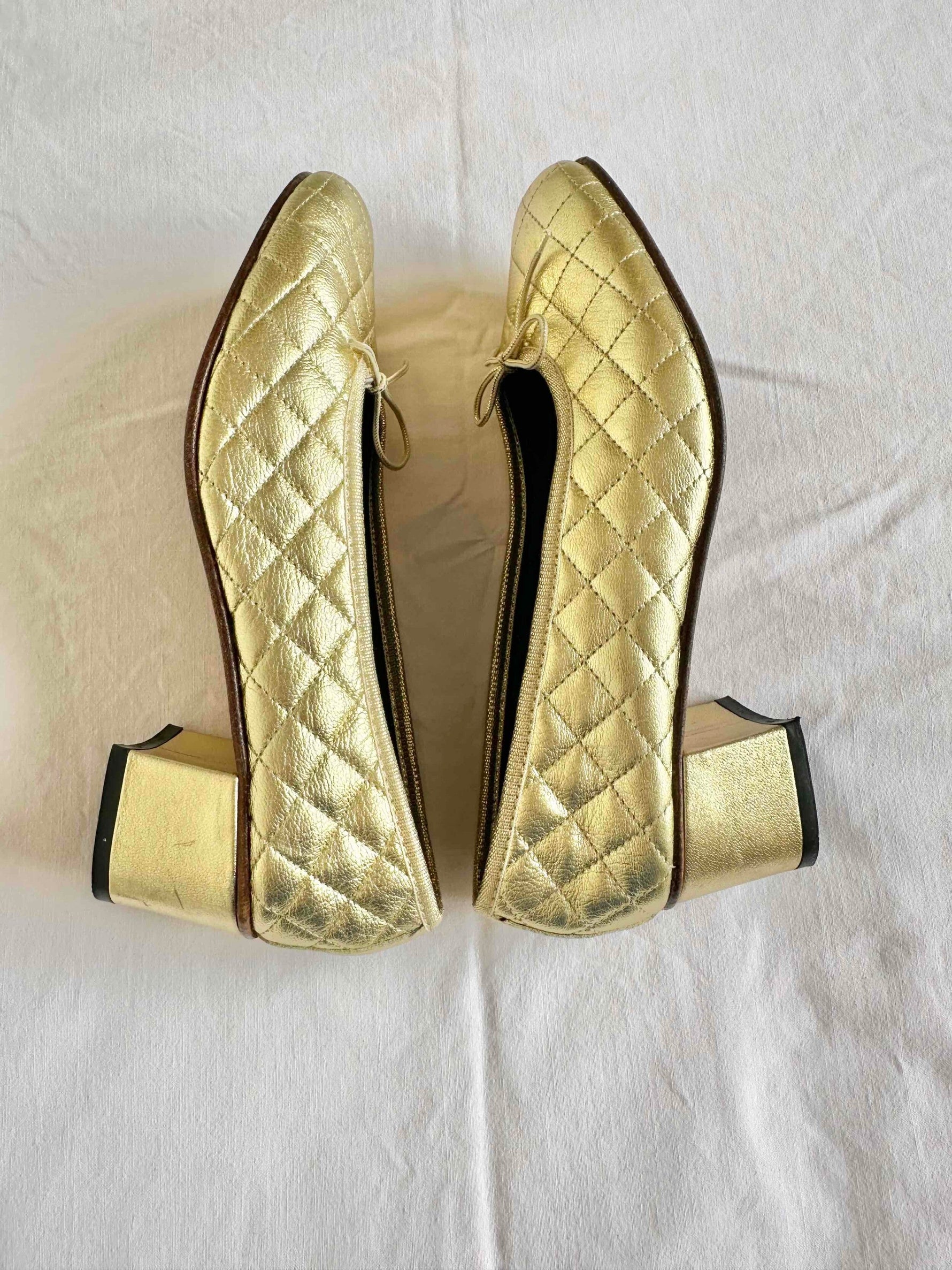 Ballerines en cuir doré, à talons, en cuir matelassé, croisillons dorés, bordures en ruban lurex doré, petit nœud, fabriquées en France, pointure 38, longueur semelle 24,5 cm, hauteur talons 5 cm.
