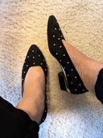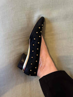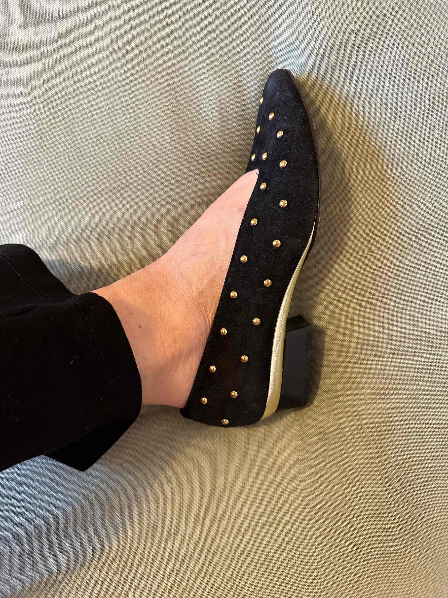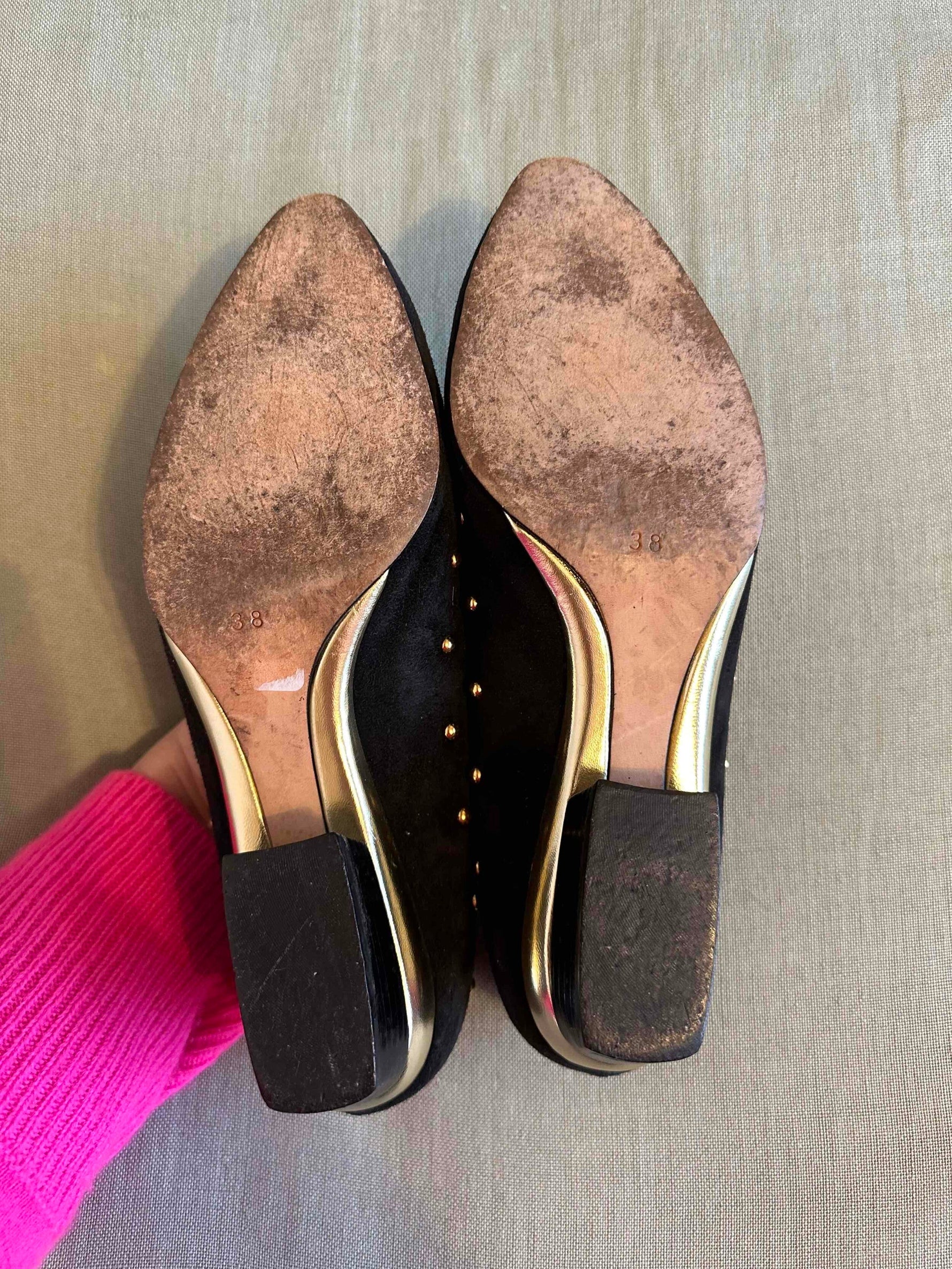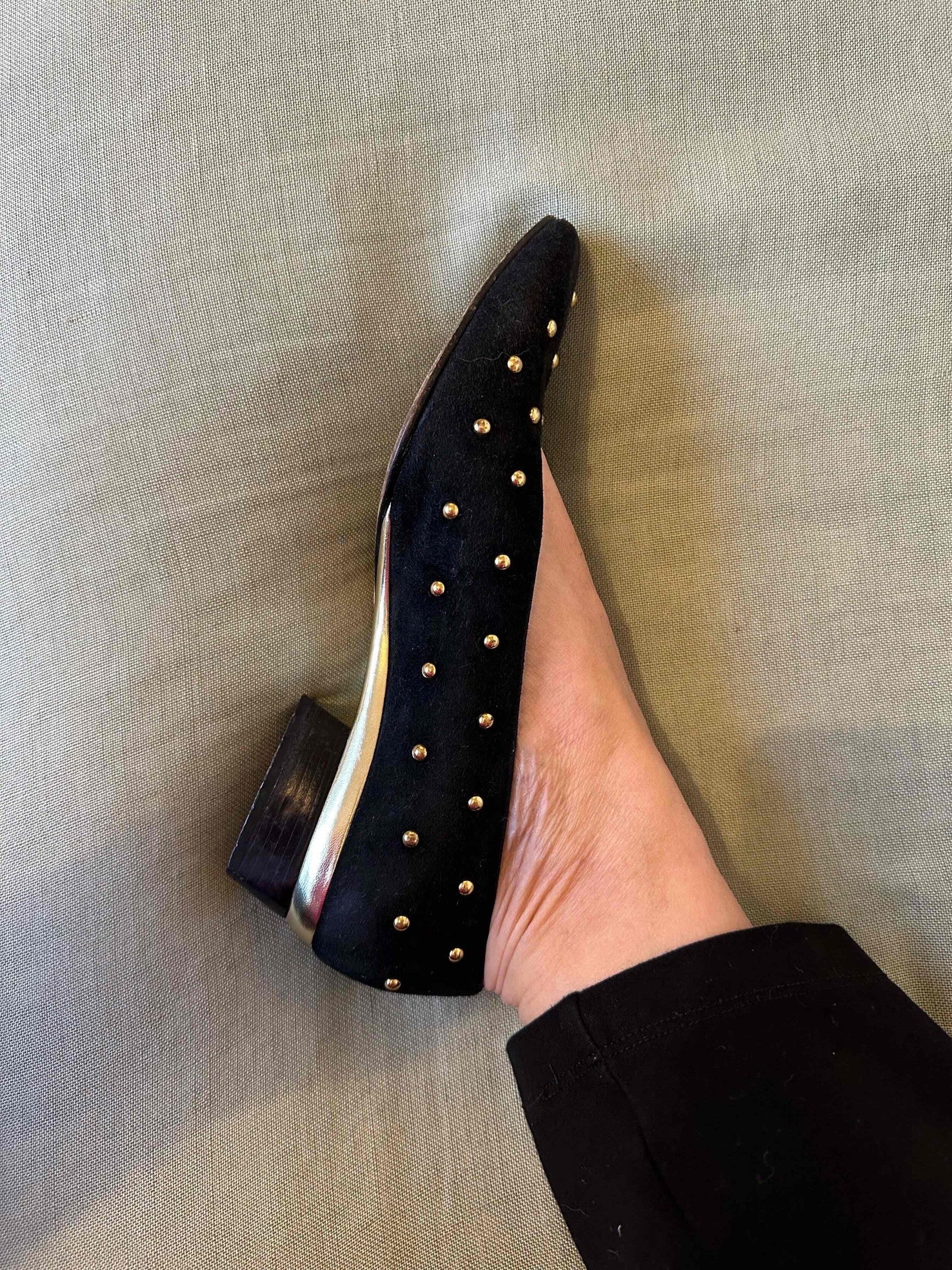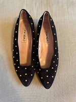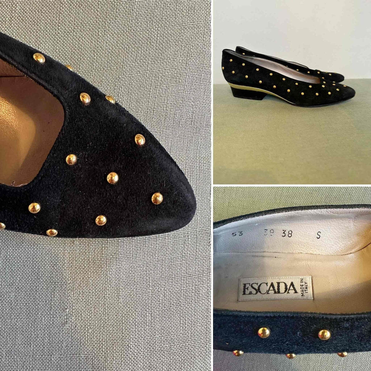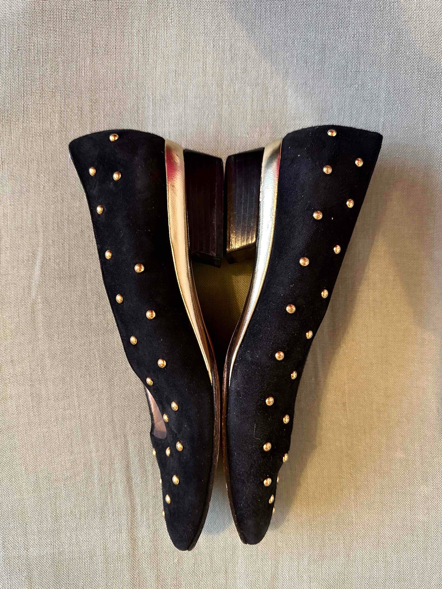 Prix unitaire parBallerines en cuir Escada, daim noir clous rond dorés, découpes carrées arrondies sur le dessus, talons et petite plateforme en cuir doré de 3,5cm de hauteur, fabriquées en Italie, pointure 37 actuelle, longueur planche 24,5cm.