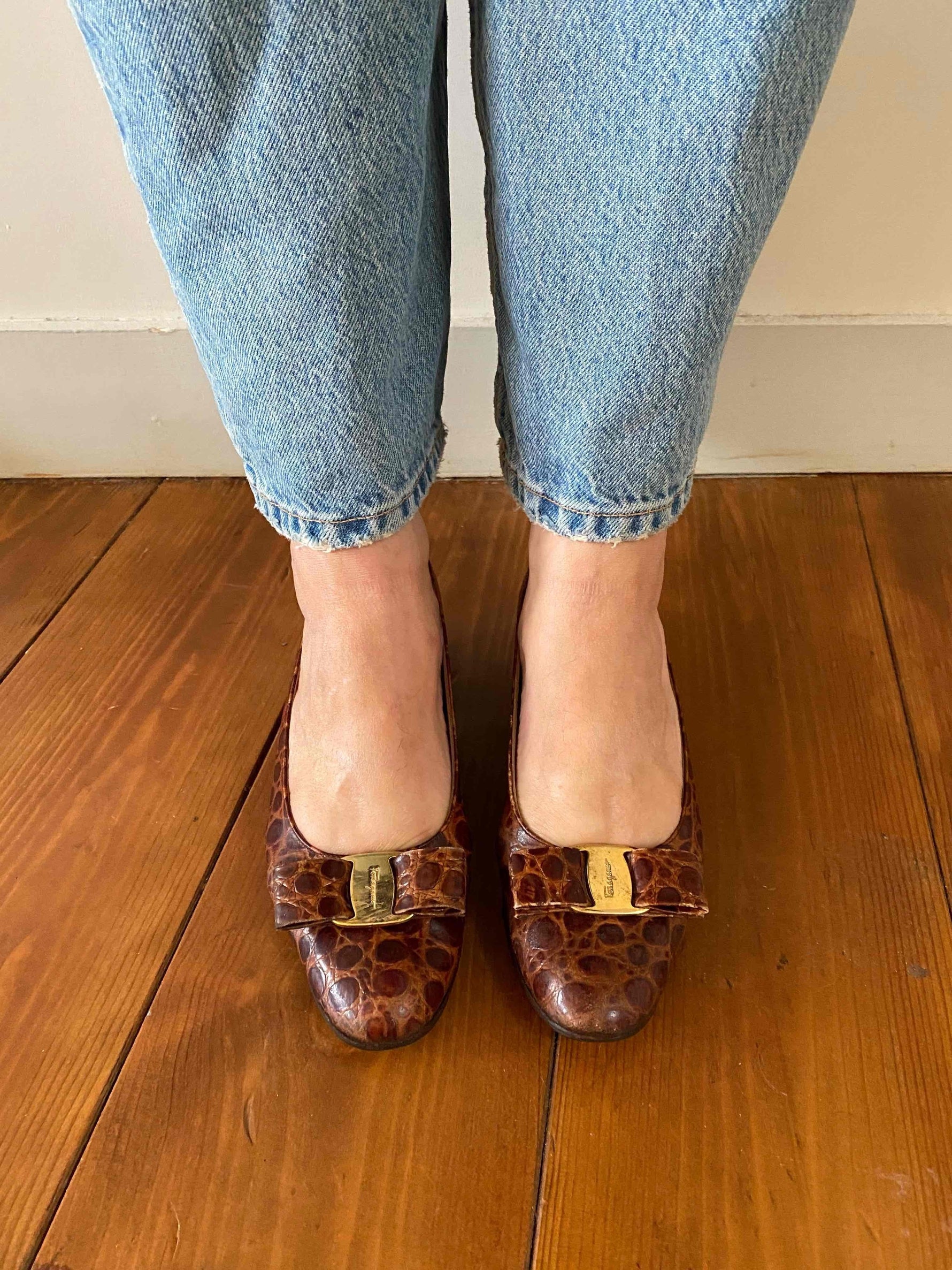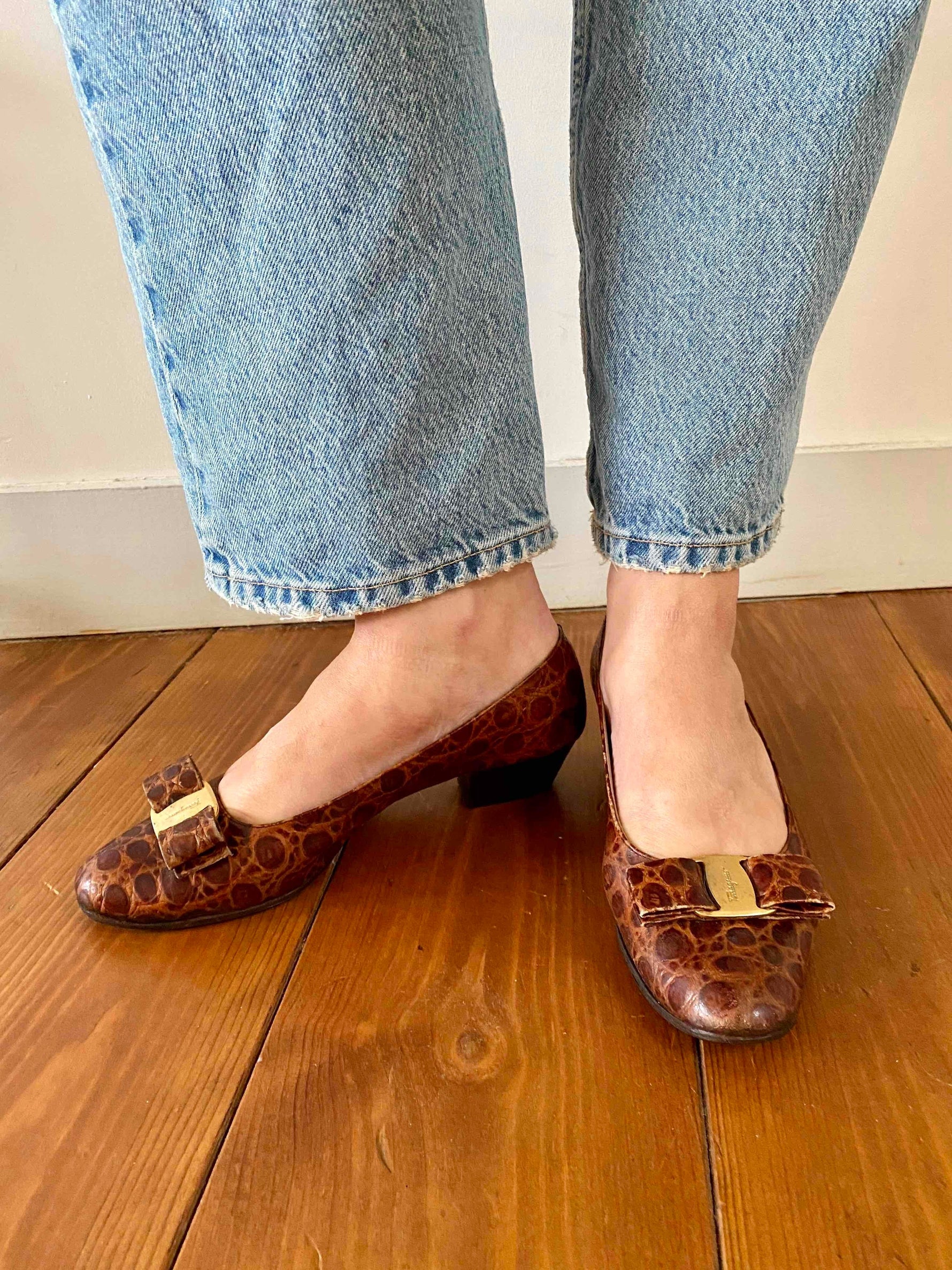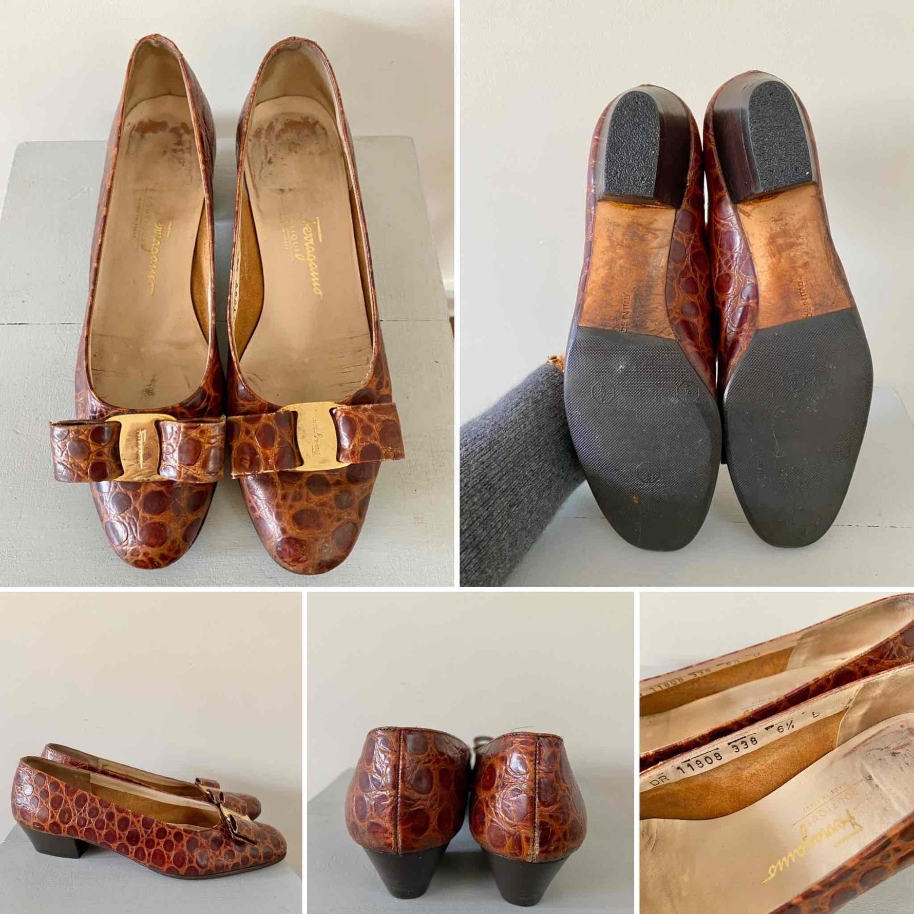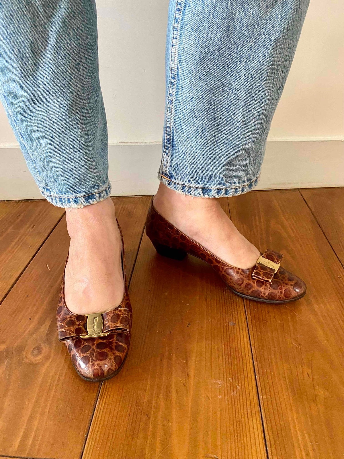 Prix unitaire parBallerines à Talons Ferragamo en cuir effet croco caramel brun, fabriquées en Italie, Pointure 37 (peut convenir à un 36,5 également) : Longueur Semelles 24cm Talons 3,5cm