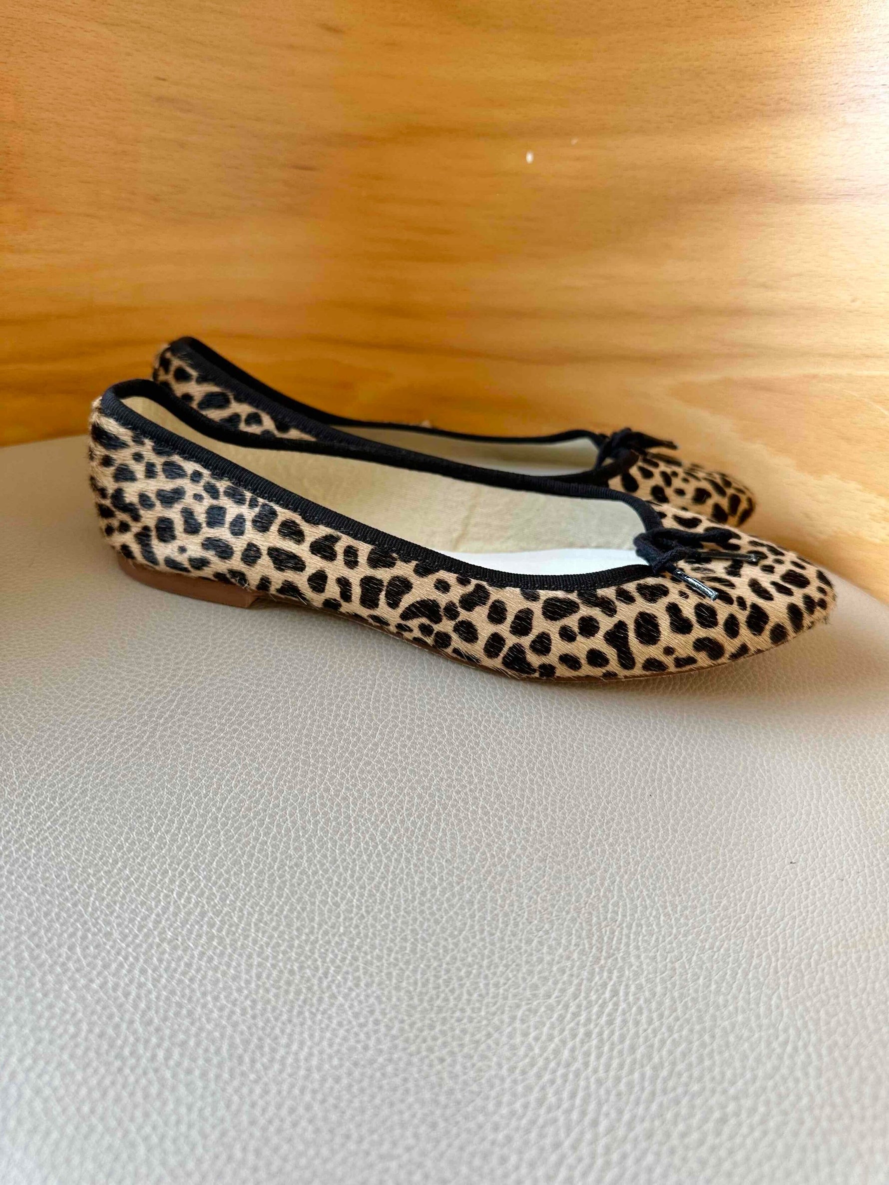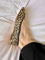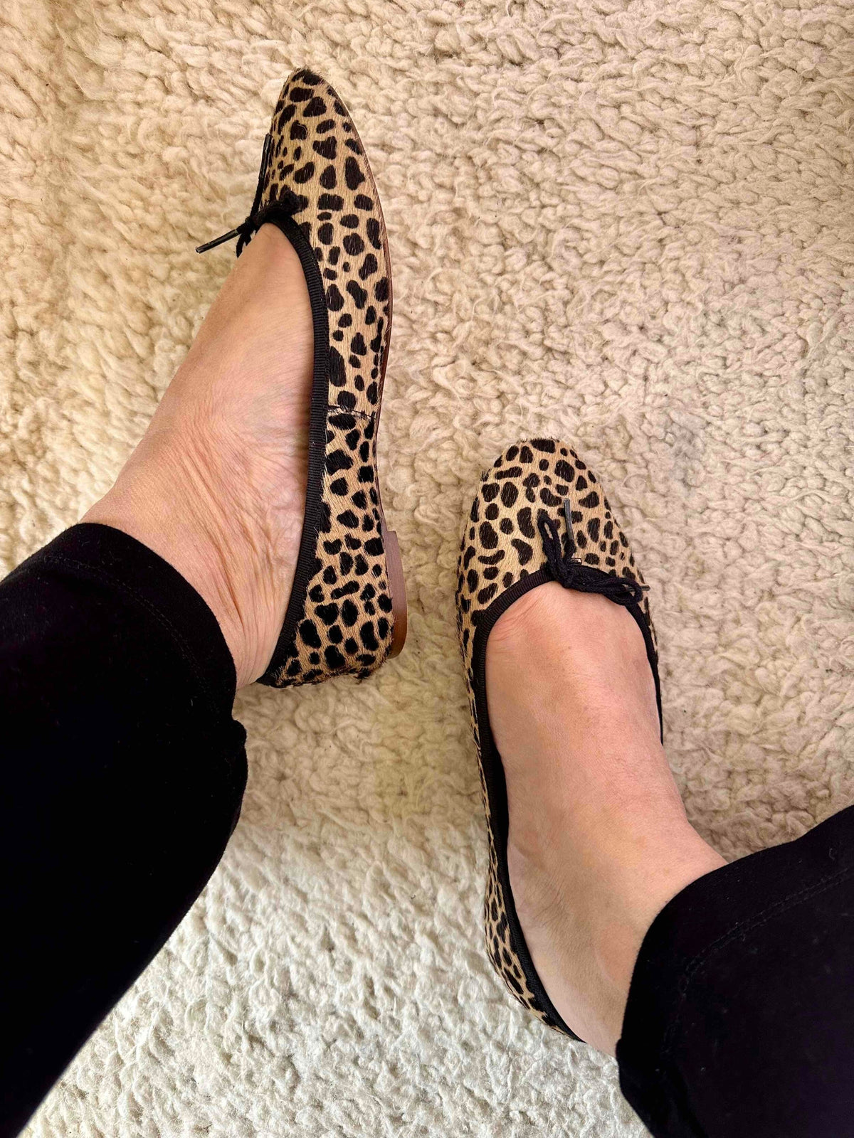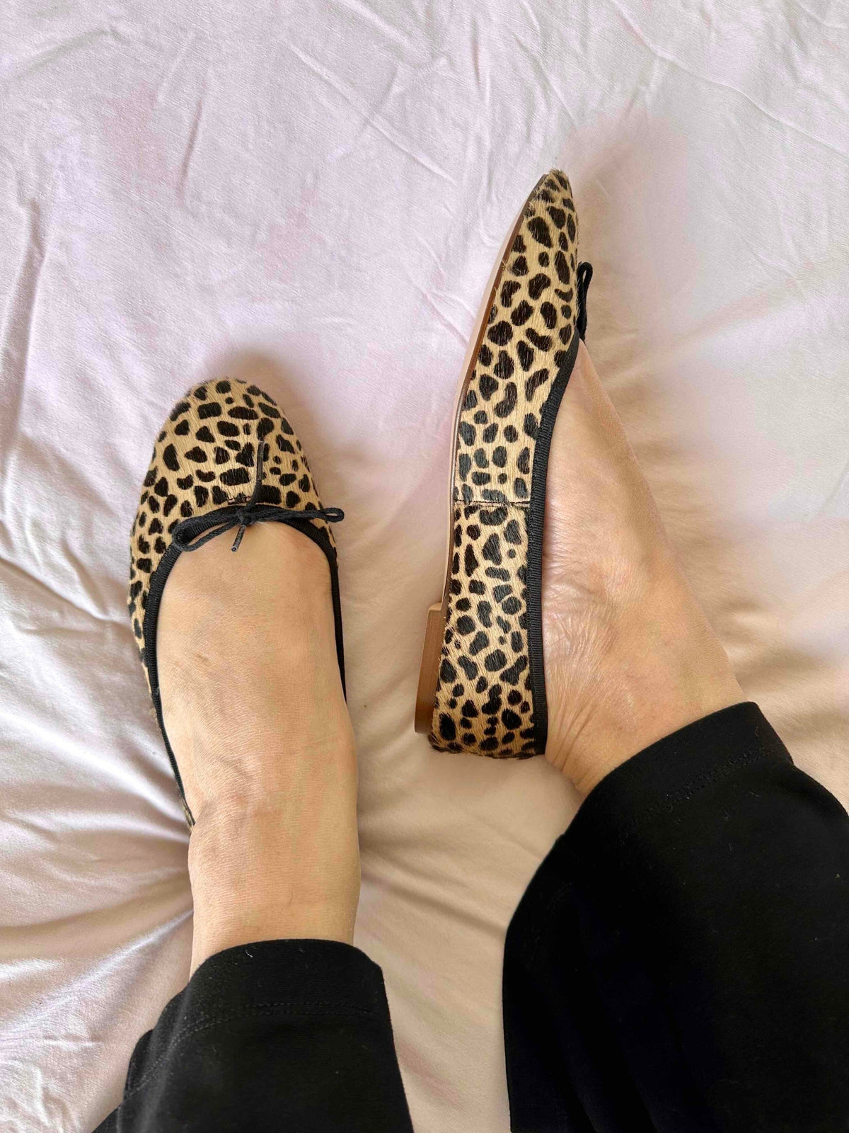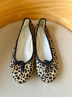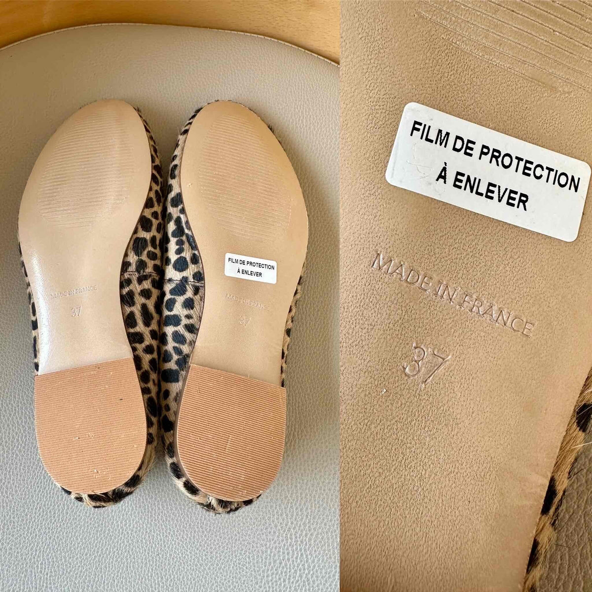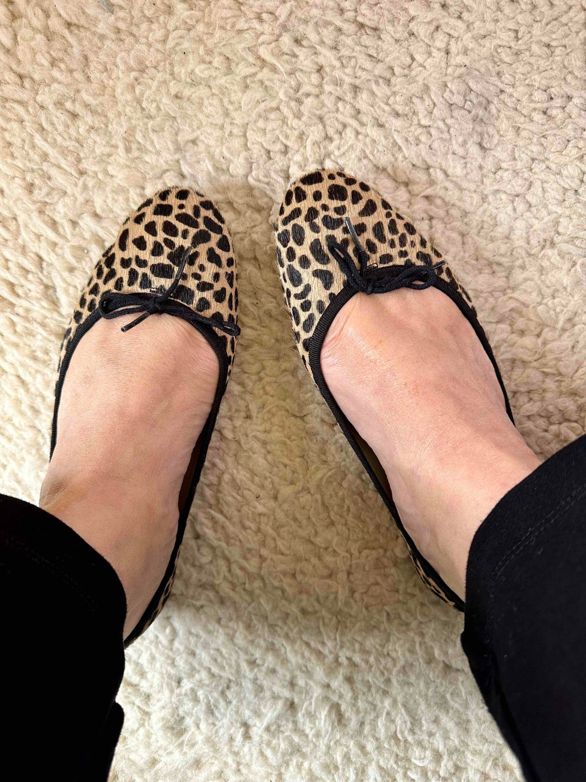 Prix unitaire parBallerines en cuir léopards, cuir effet ponyhair imprimé petit léopard, bordures et noeud noirs, fabriquées en France, pointure 37, mini talons de 0,5cm, longueur semelle 23,5cm. Deadstock années 00s.
