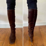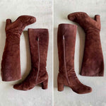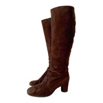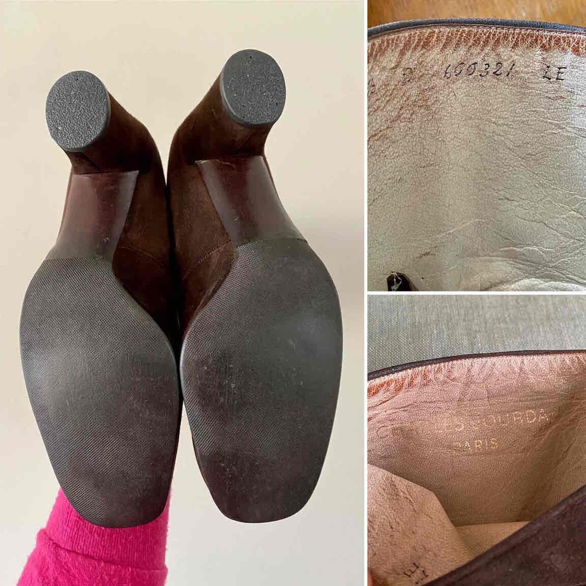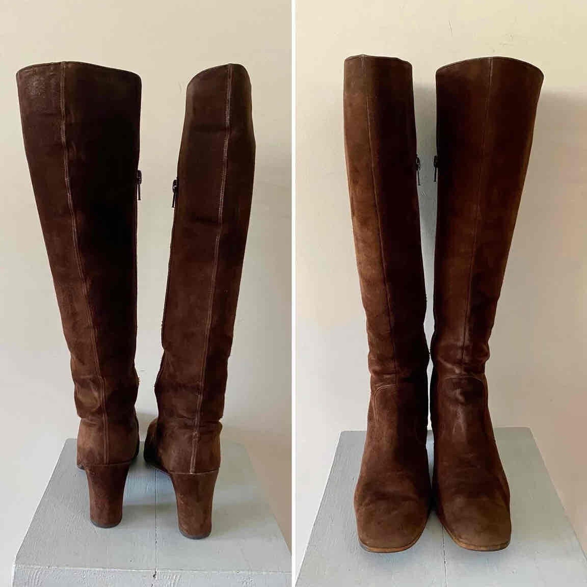 Prix unitaire parBottes Charles Jourdan en daim chocolat, bouts carrés, talons bottiers, forme moulante avec fermeture éclair intérieure, fabriquées en France, Pointure 37, Talons 7,5 cm Longueur Semelles 24 cm Hauteur de Tige 38cm Tour de mollets 36cm Tour de cheville 27cm.