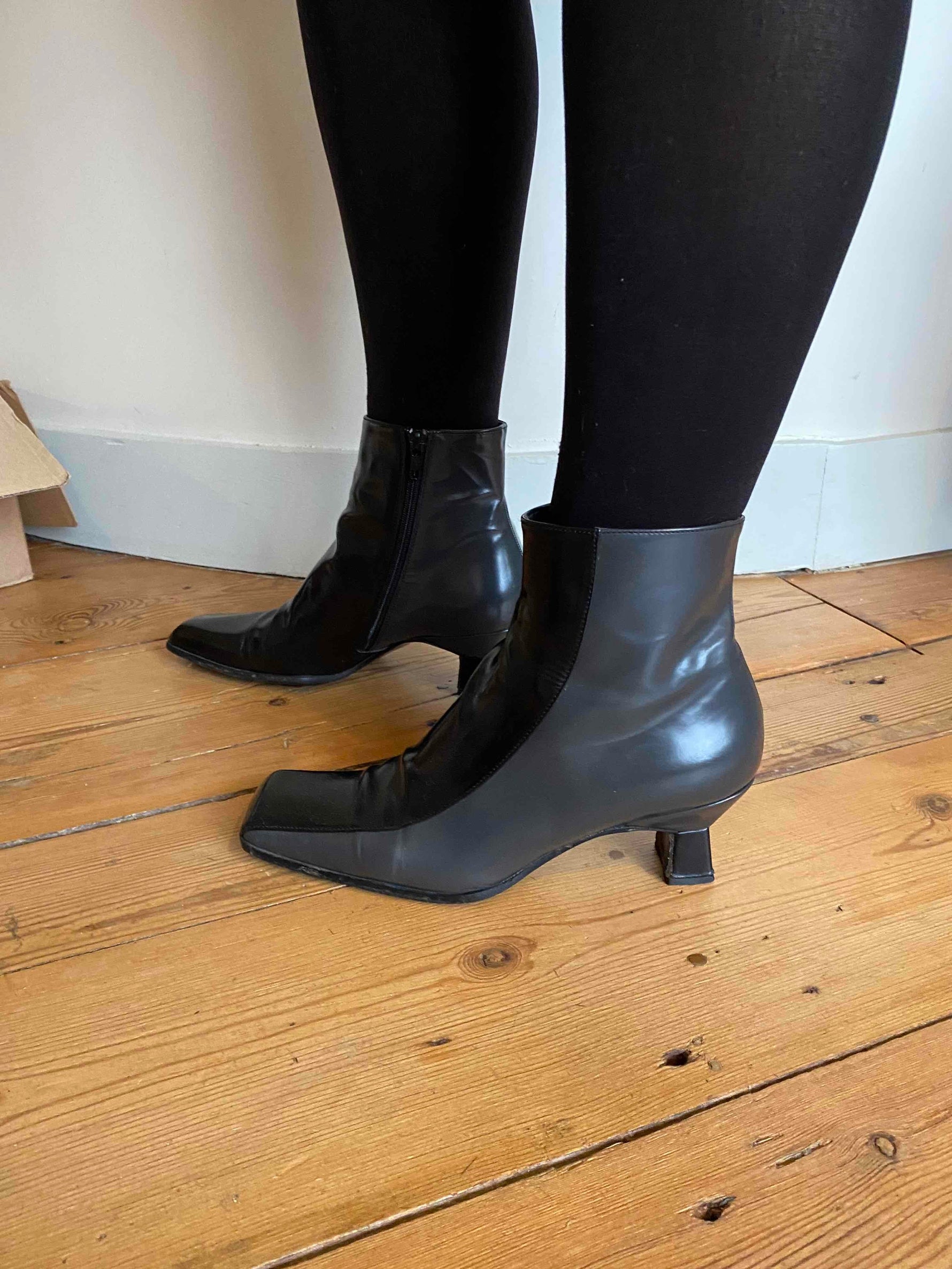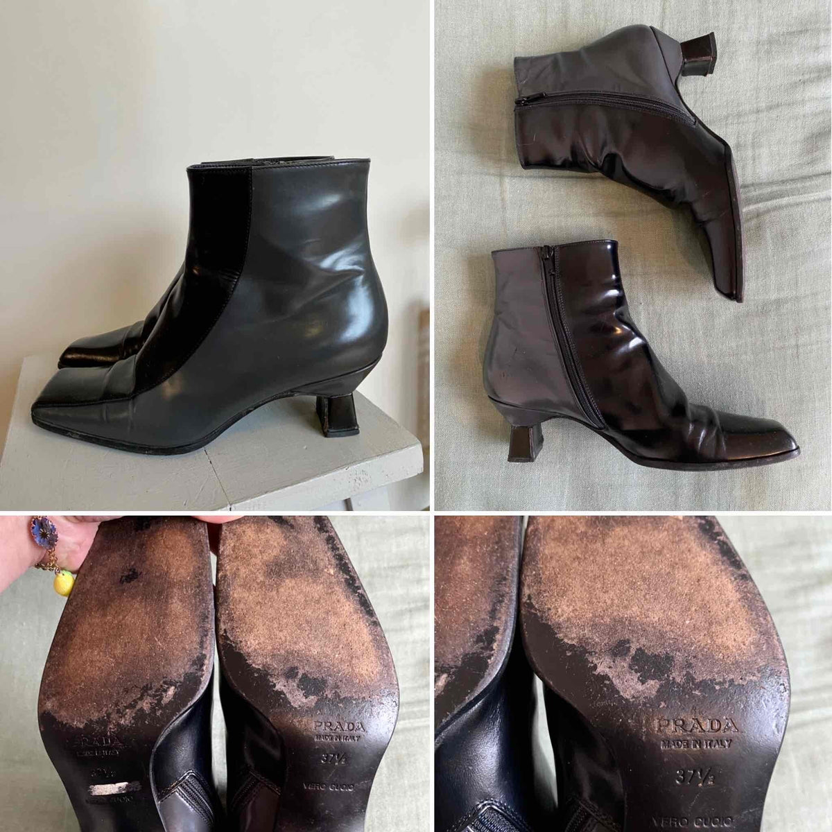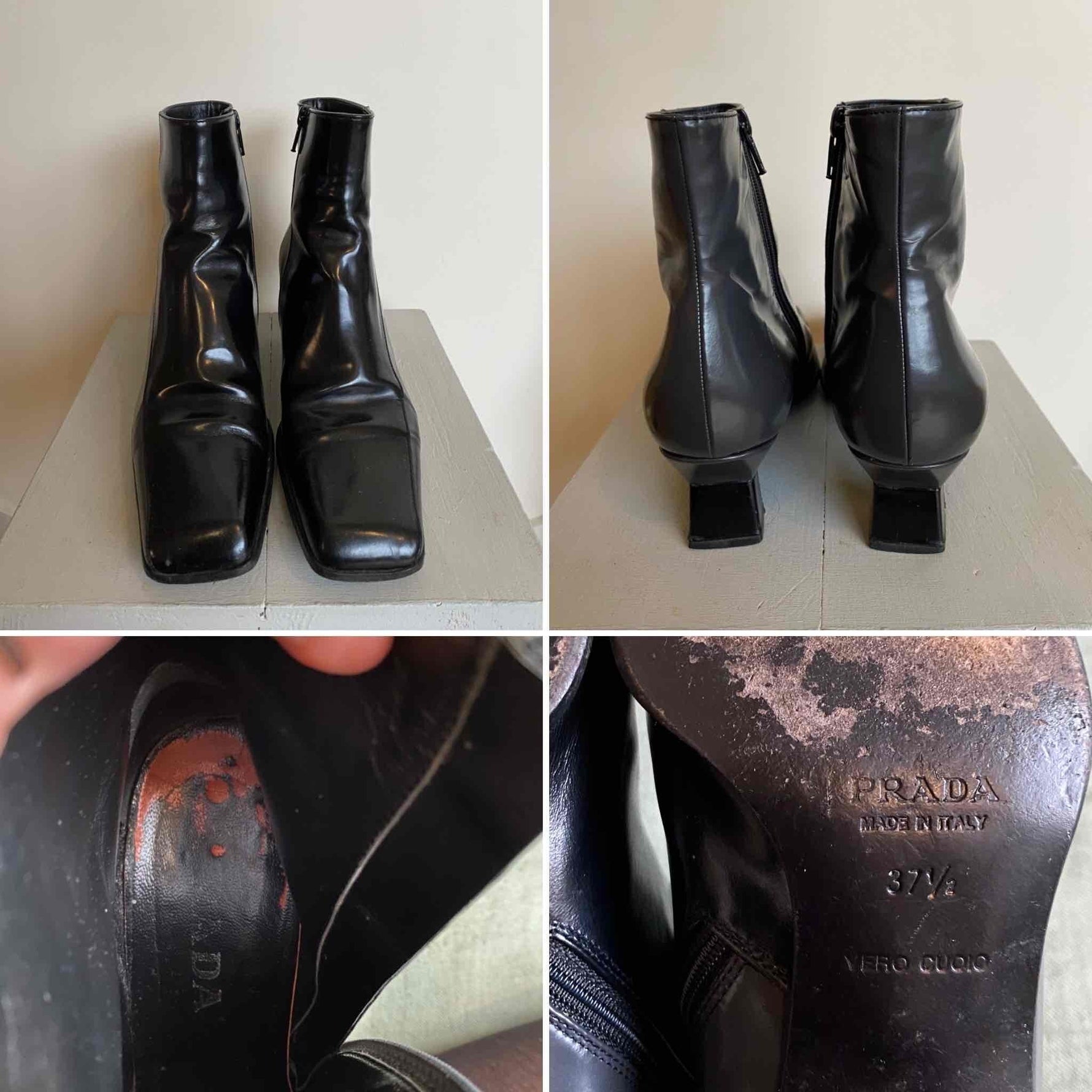 Prix unitaire parBottines Prada en cuir lissé noir et gris anthracite, bouts carrés, talons bobines carrés, fabriquées en Italie, Pointure 37,5 mais très bien pour un 37, années 80’s/90’s, longueur semelle 24cm
