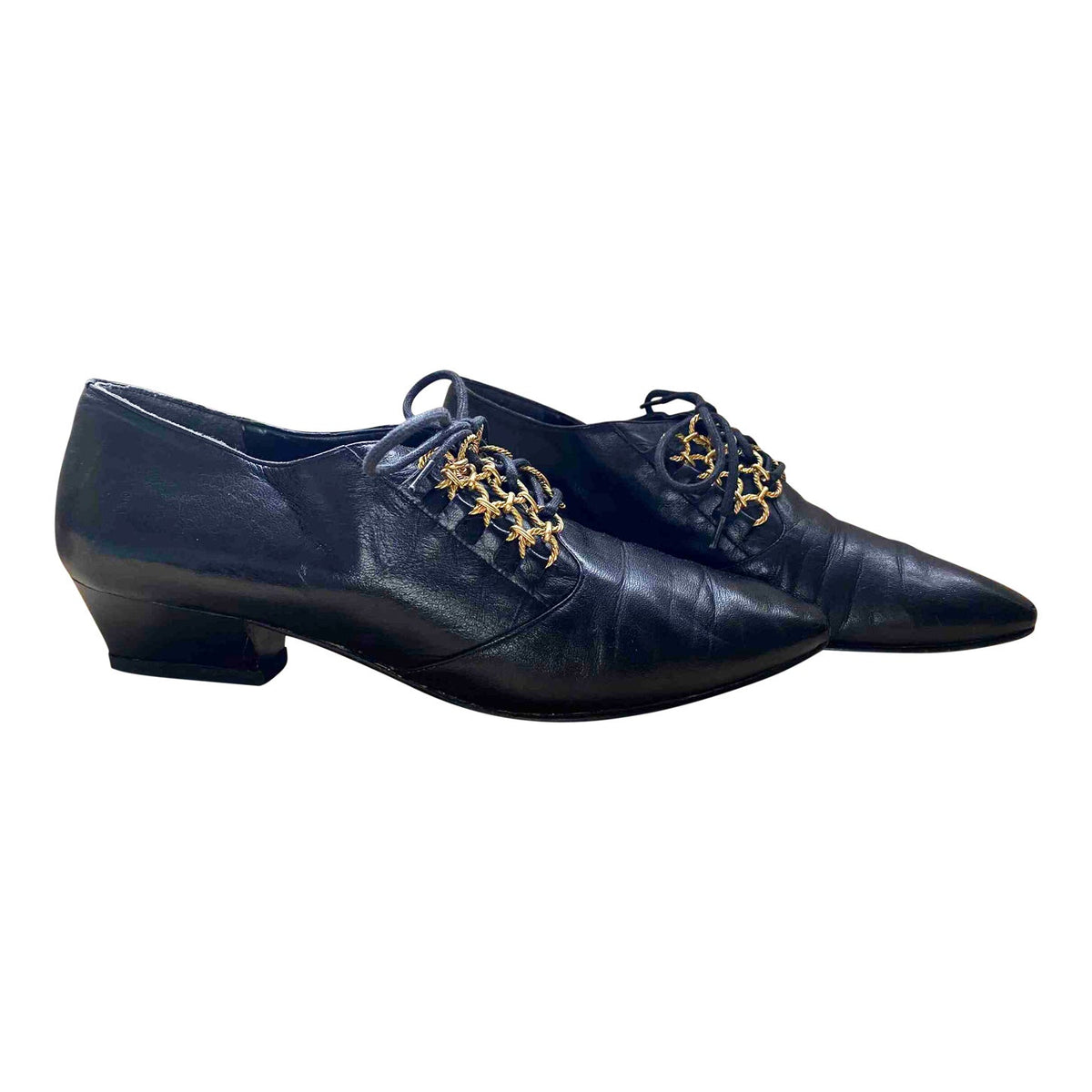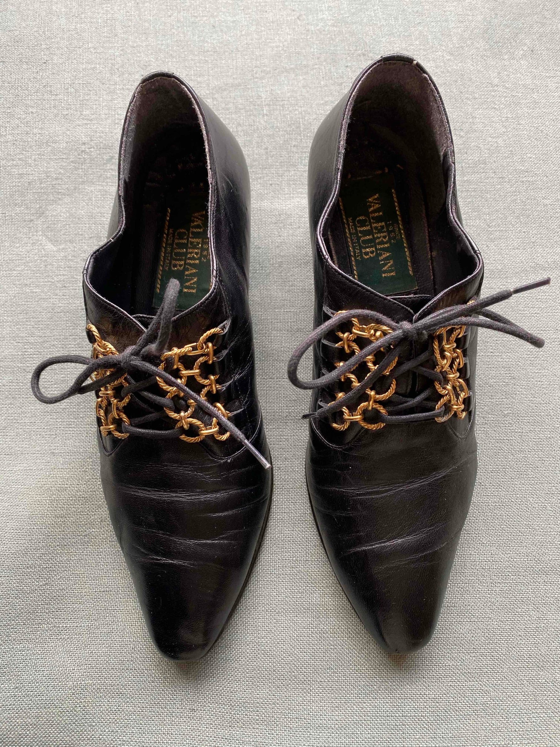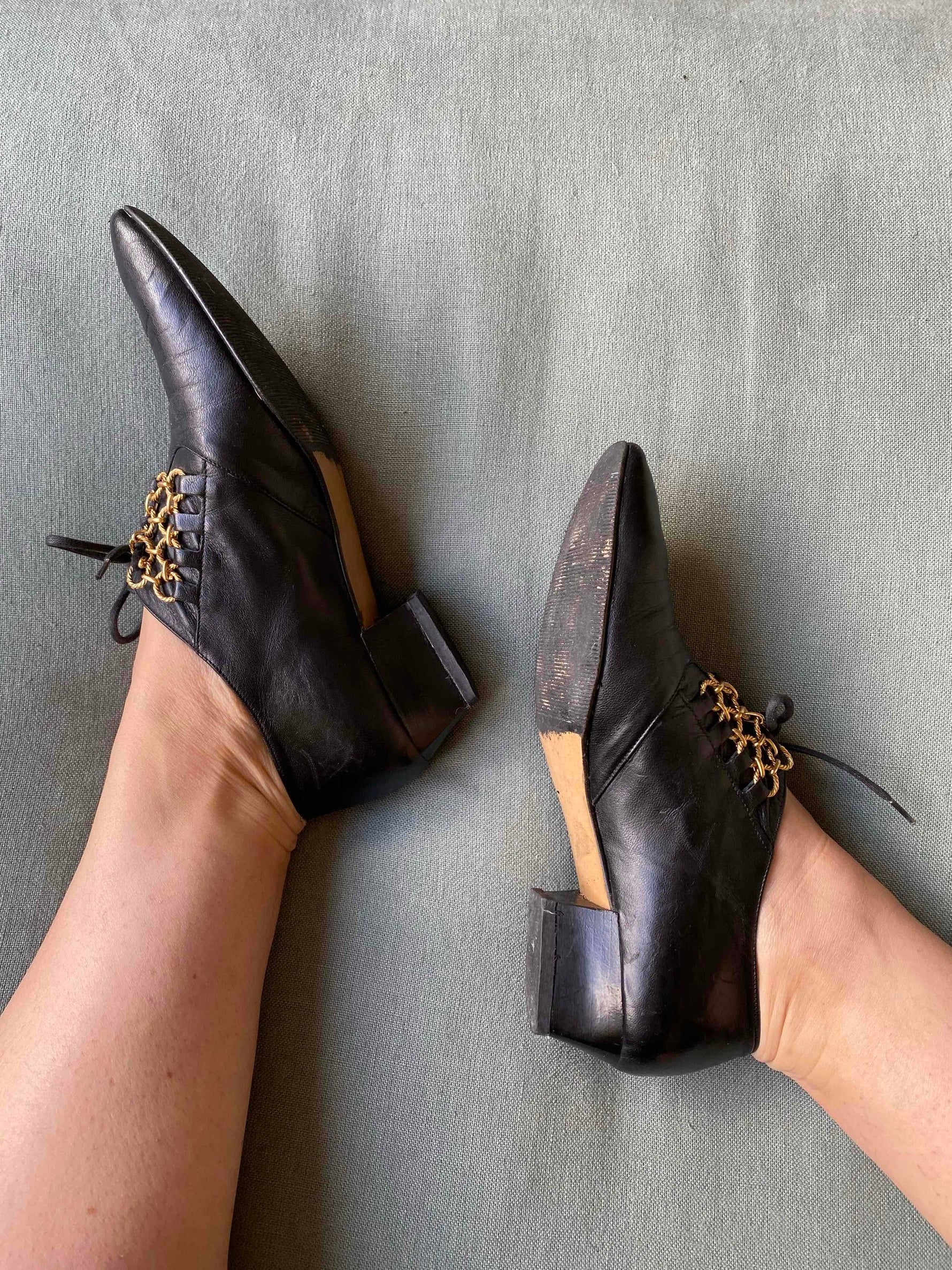 Prix unitaire parDerbies Richelieu à passant chaînettes dorées, cuir noir souple, bouts pointus en amande, petits talons, Fabriquées en Italie, Pointure 37 et 36,5