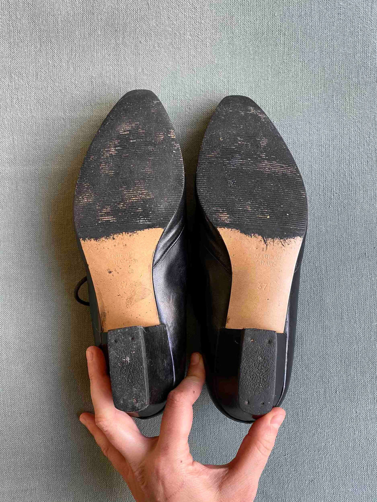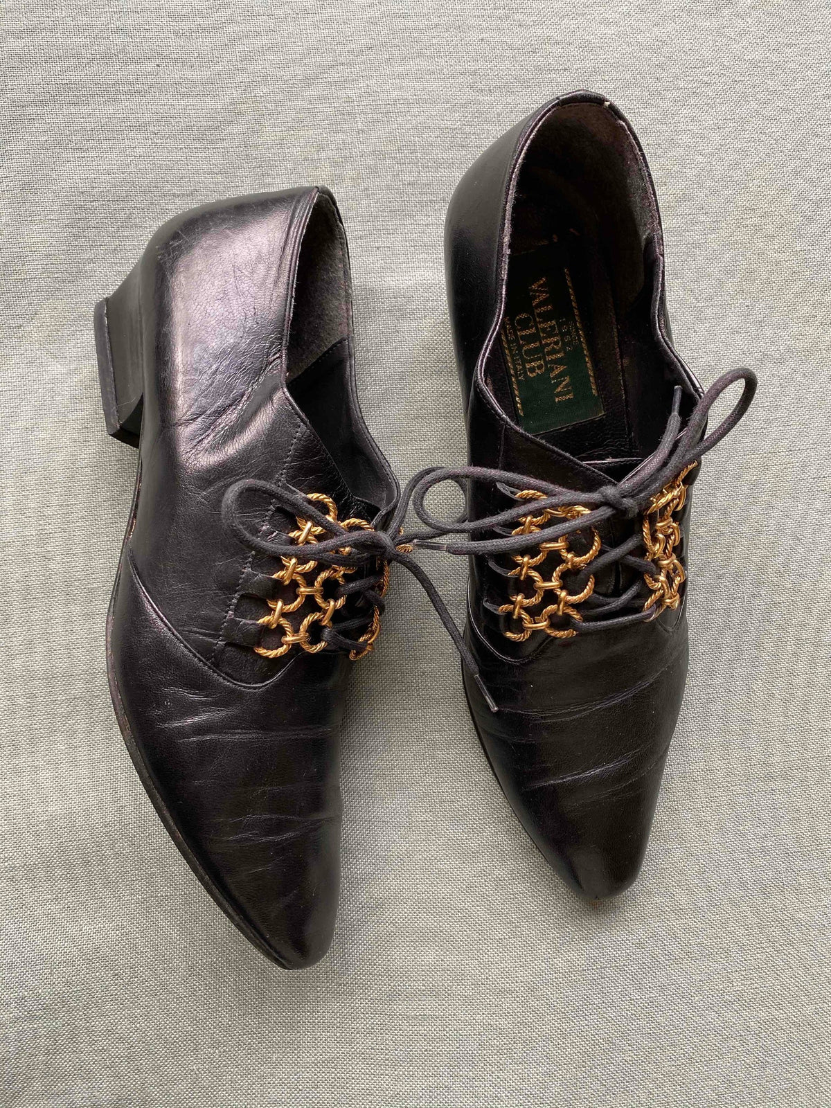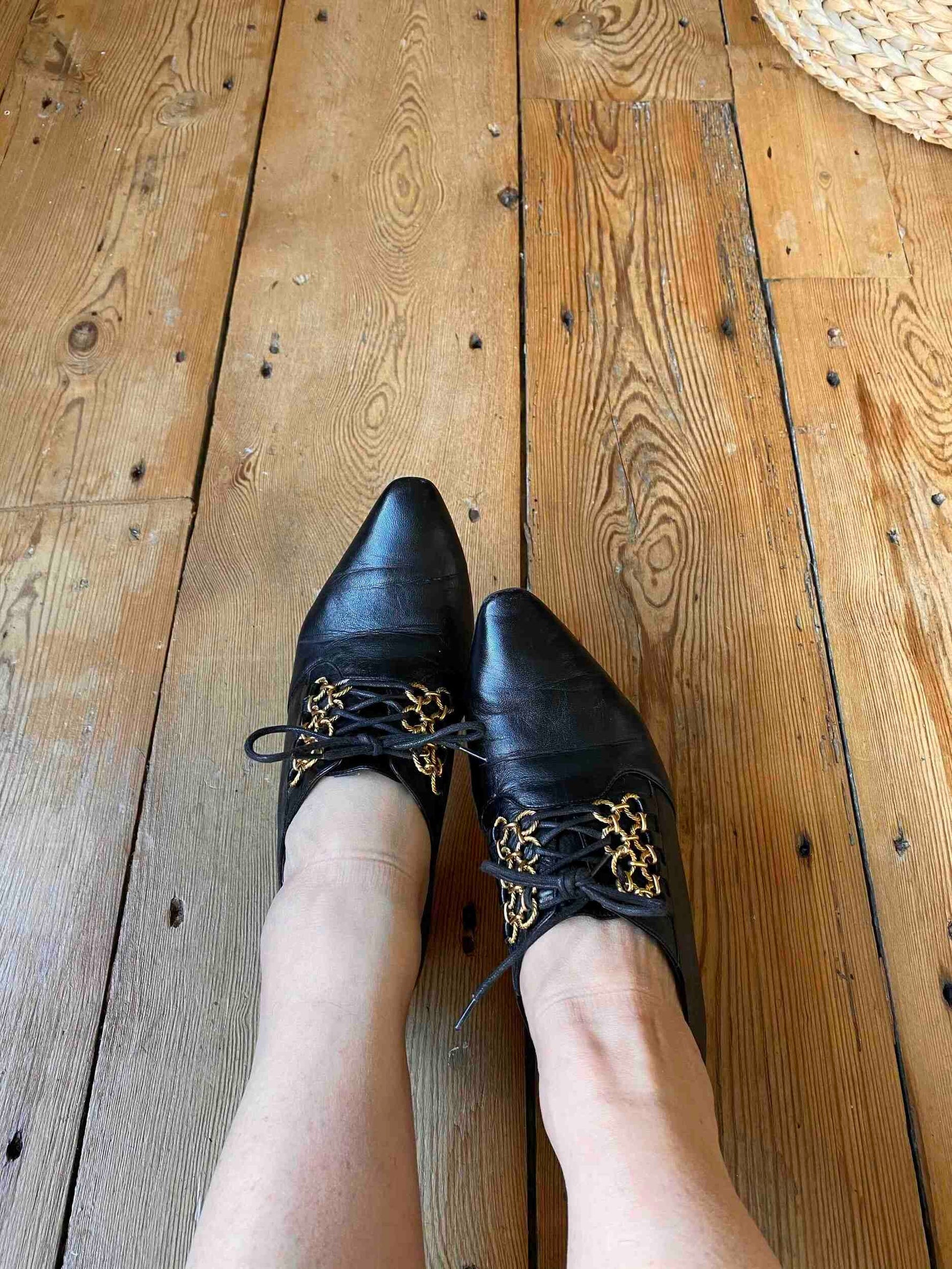 Prix unitaire parDerbies Richelieu à passant chaînettes dorées, cuir noir souple, bouts pointus en amande, petits talons, Fabriquées en Italie, Pointure 37 et 36,5