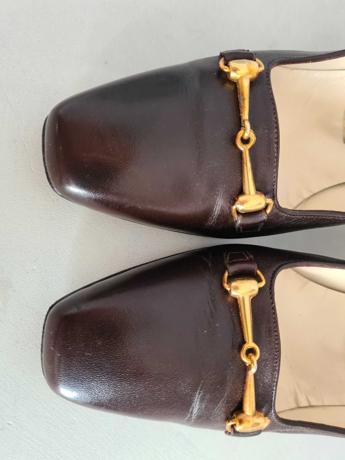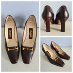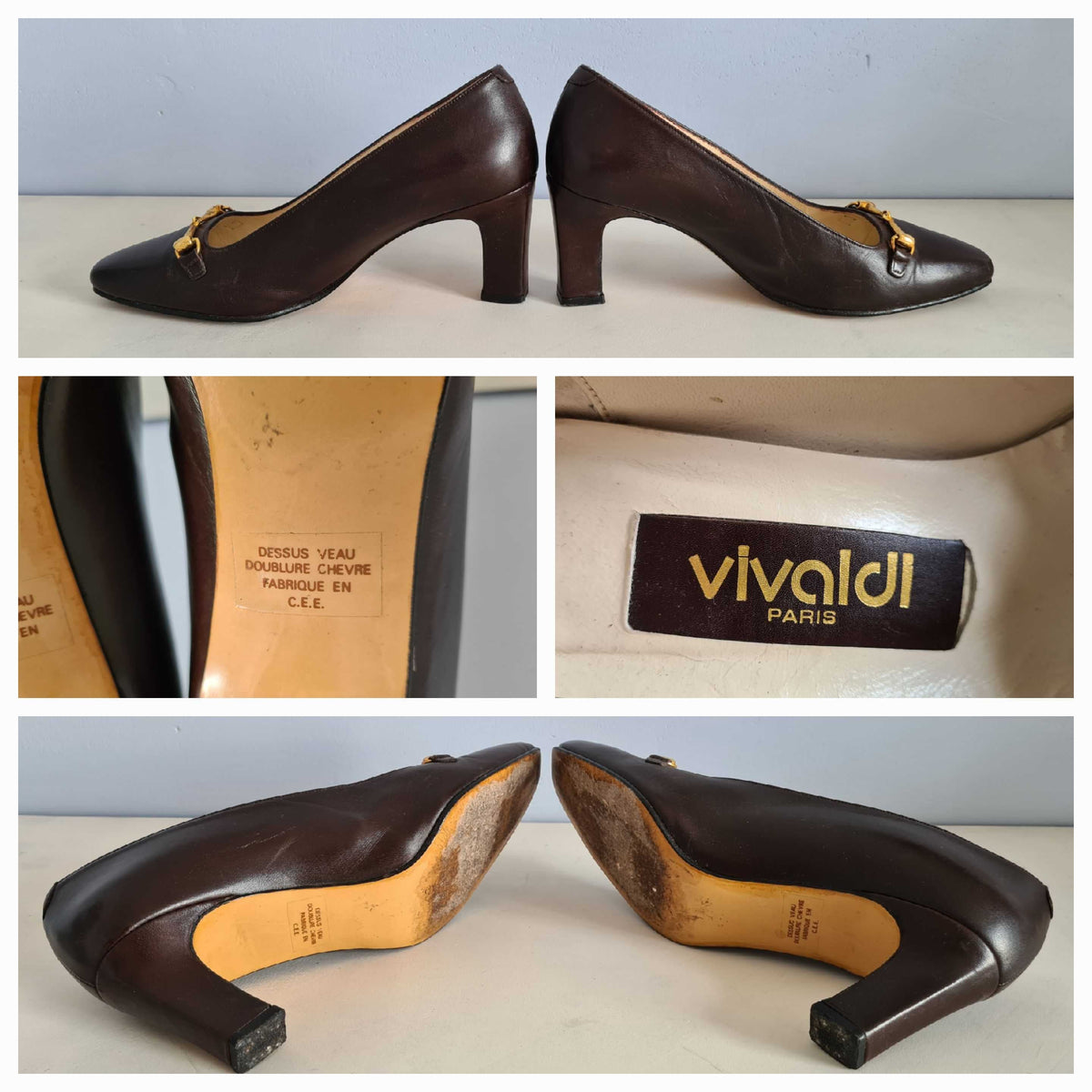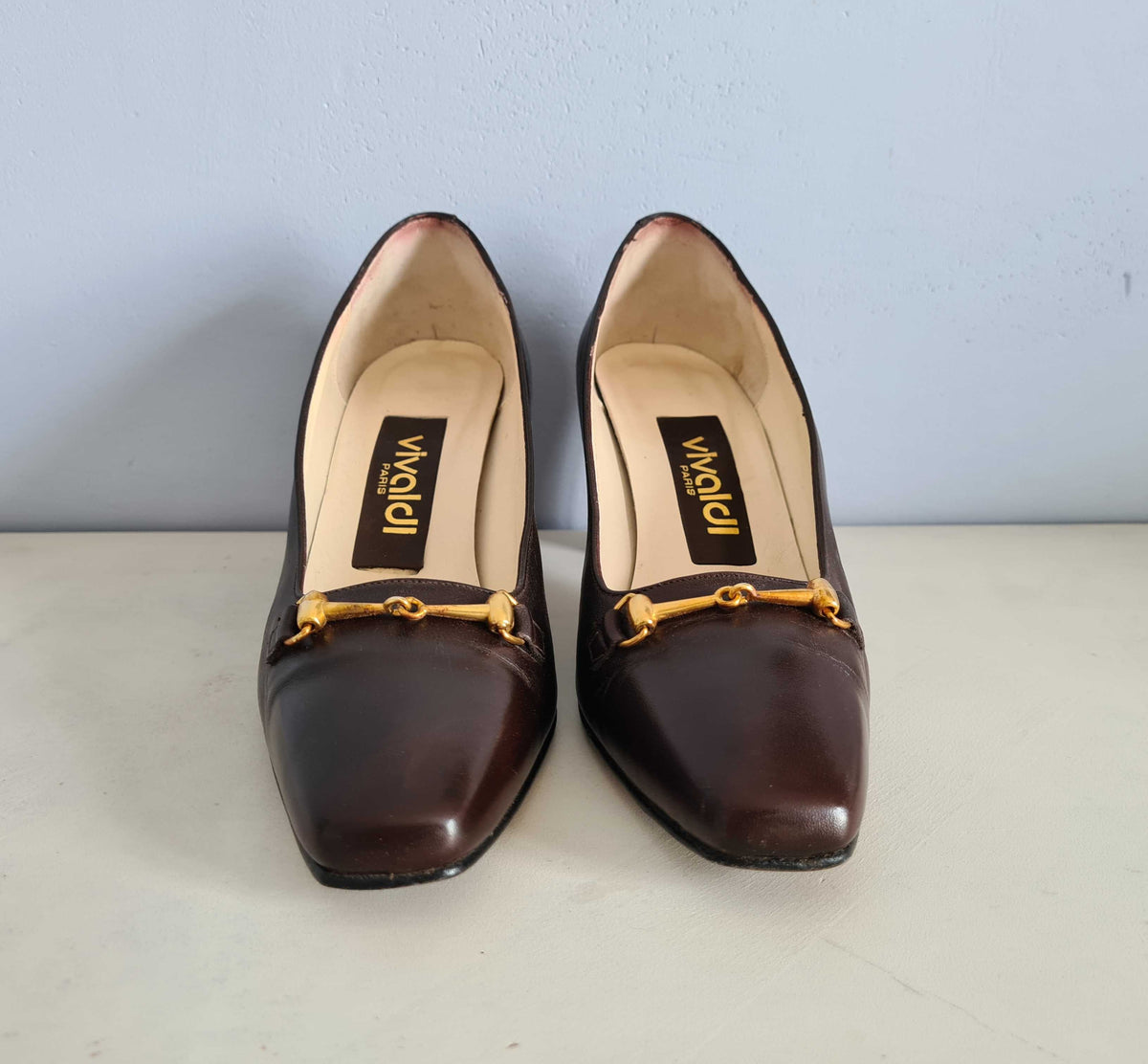 Prix unitaire parEscarpins en cuir chocolat à boucle dorée. Doublure cuir. Fabriqué en C.E.E.