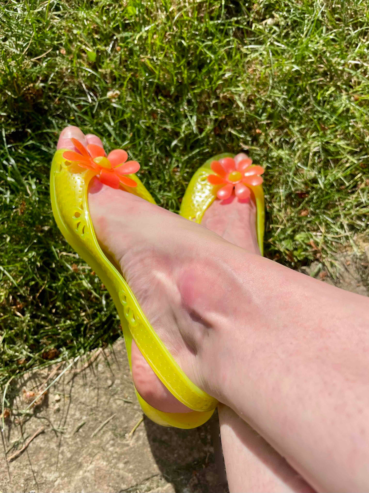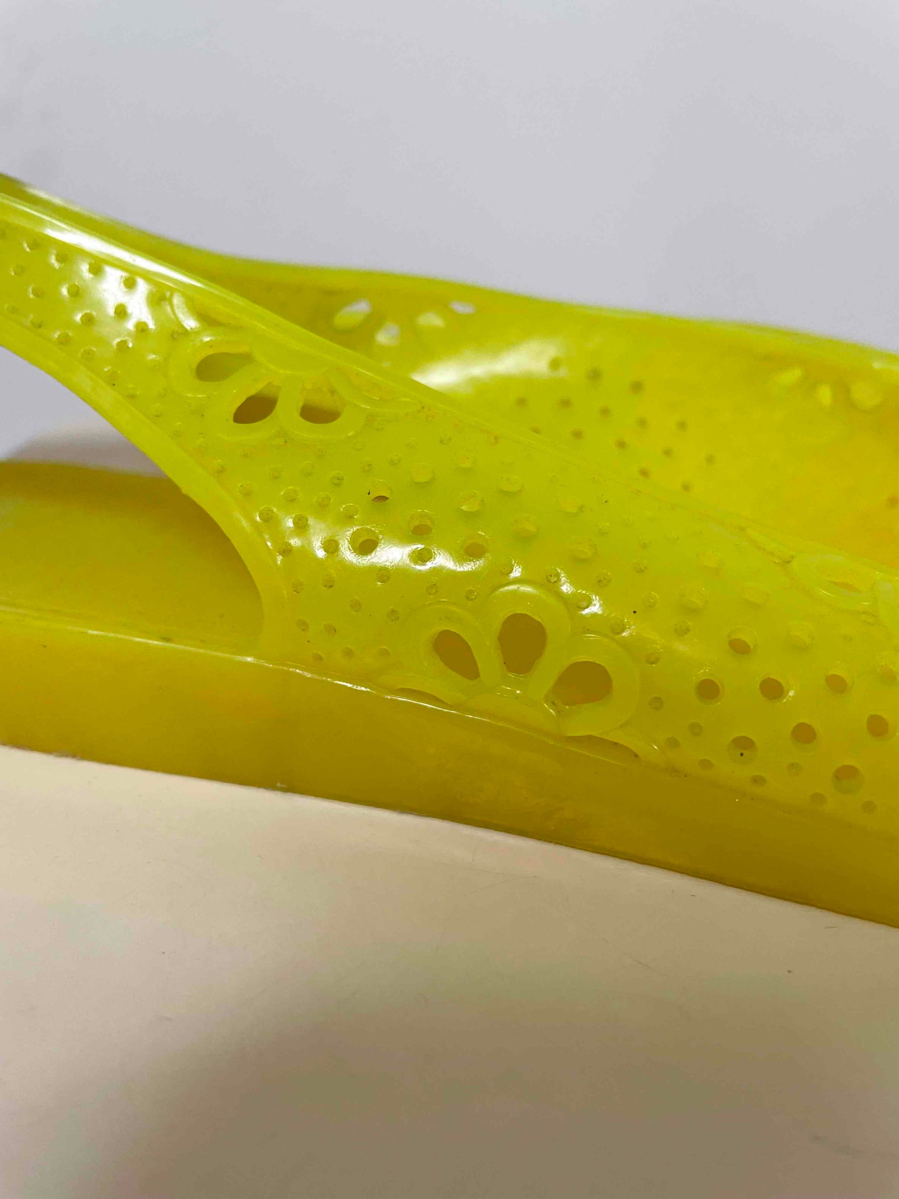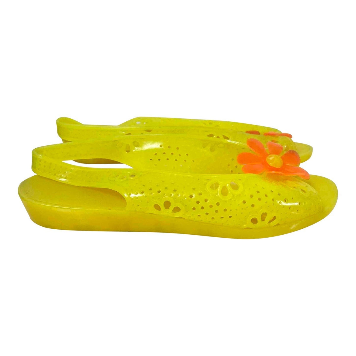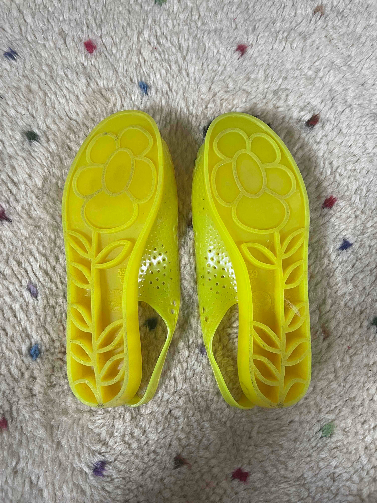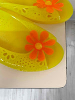 Prix unitaire parMéduses 70’s en plastique souple. Coloris jaune, fleur orange sur l’avant, détails ajourés fleurs. Semelles légèrement compensées. Fabriquées en France. Annoncées 39, elles conviendront plus pour un 38 ou 38,5. Le même modèle est disponible en vert et en orange.