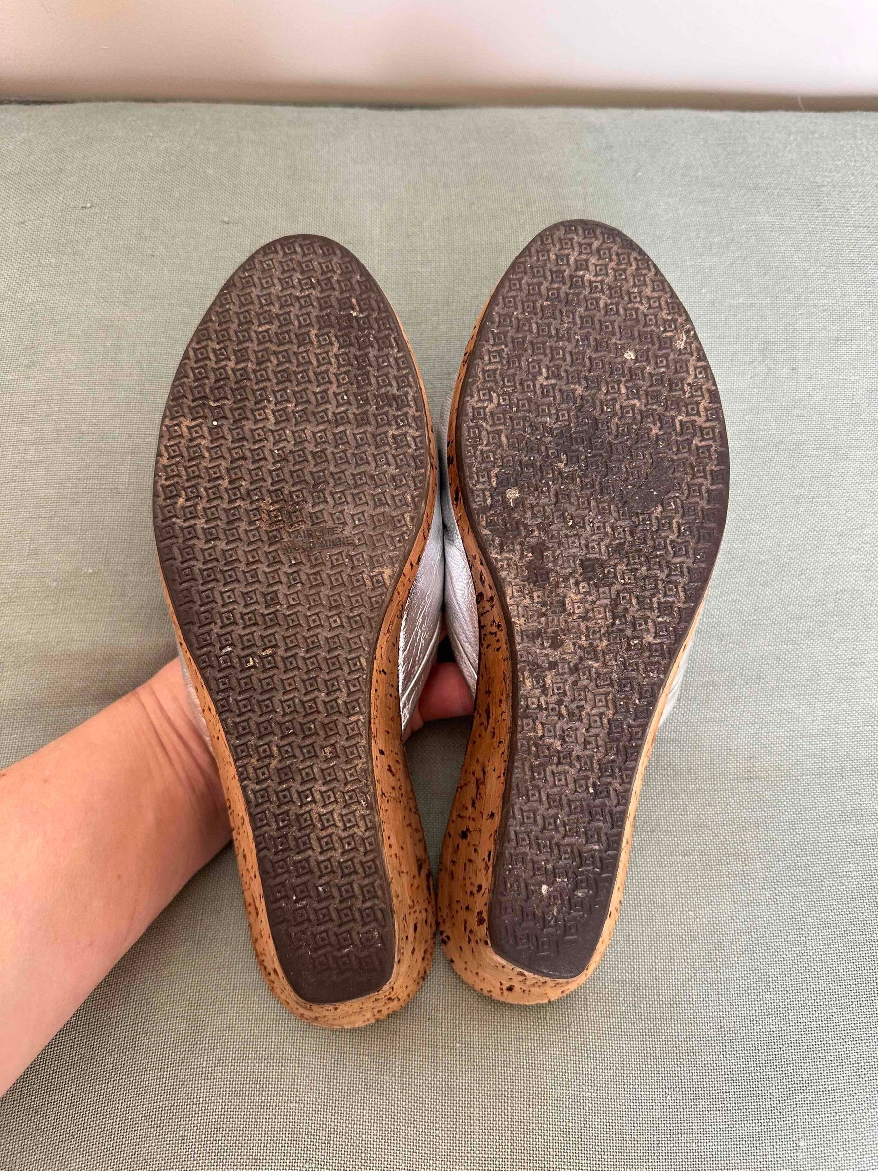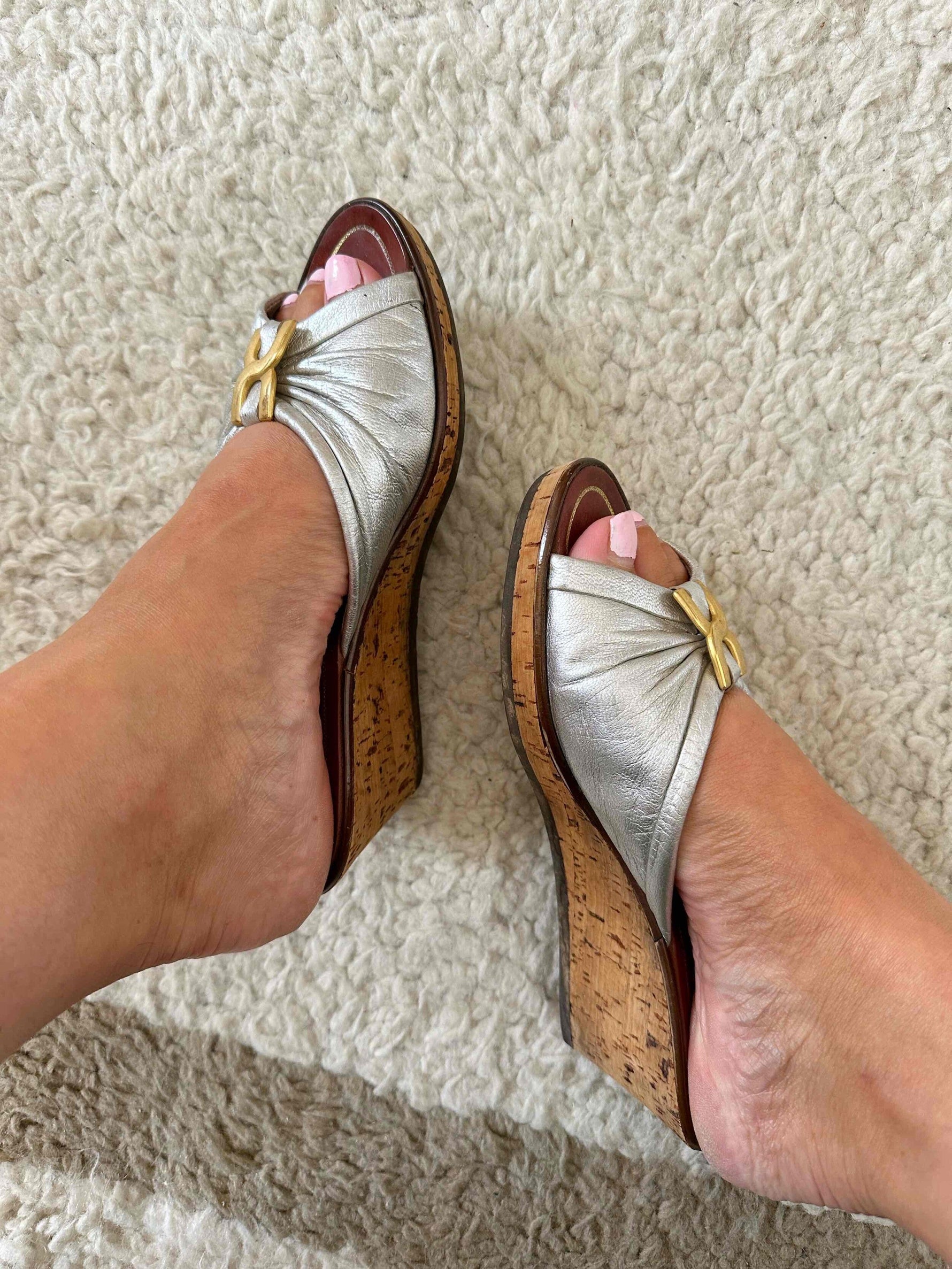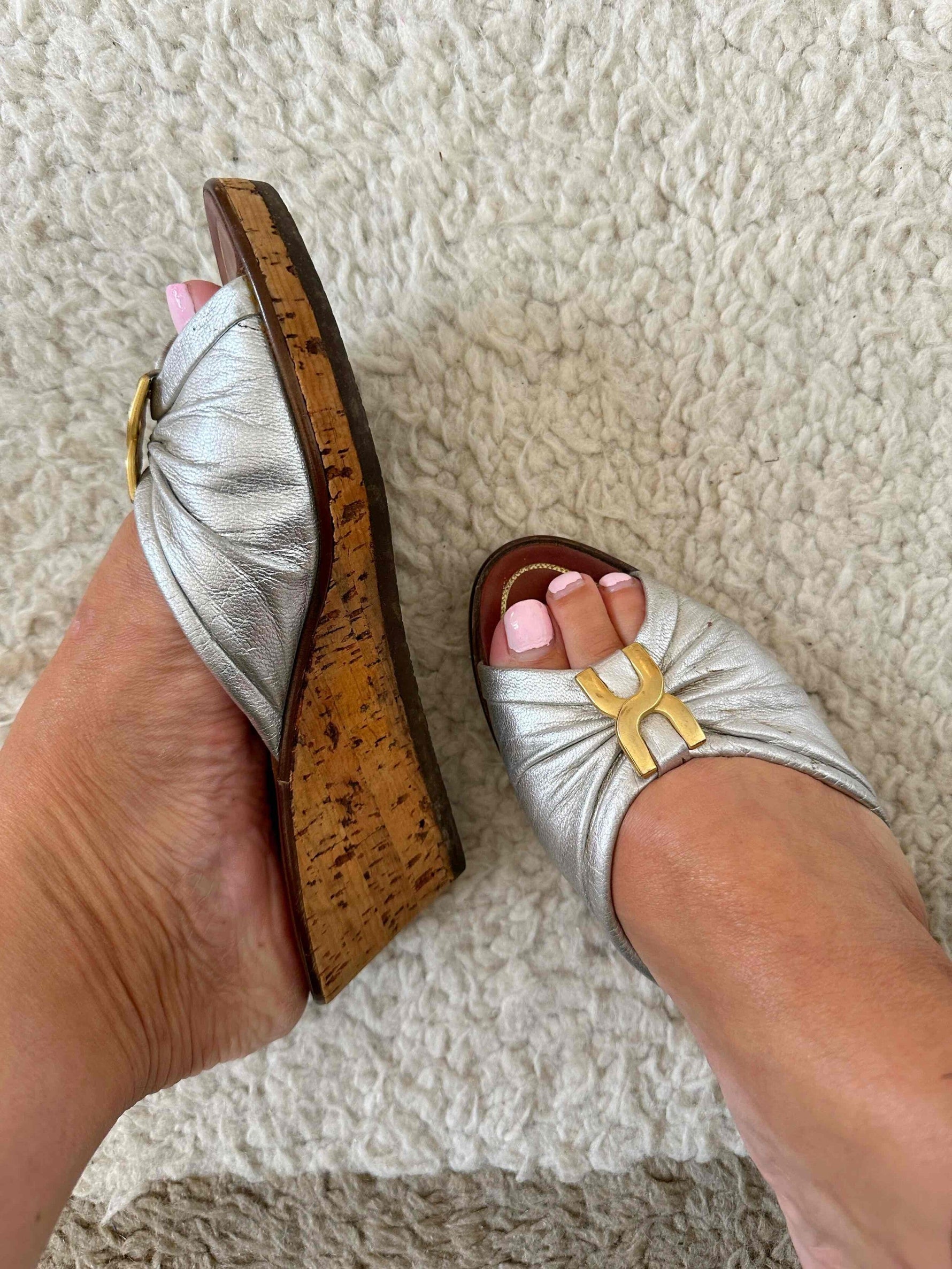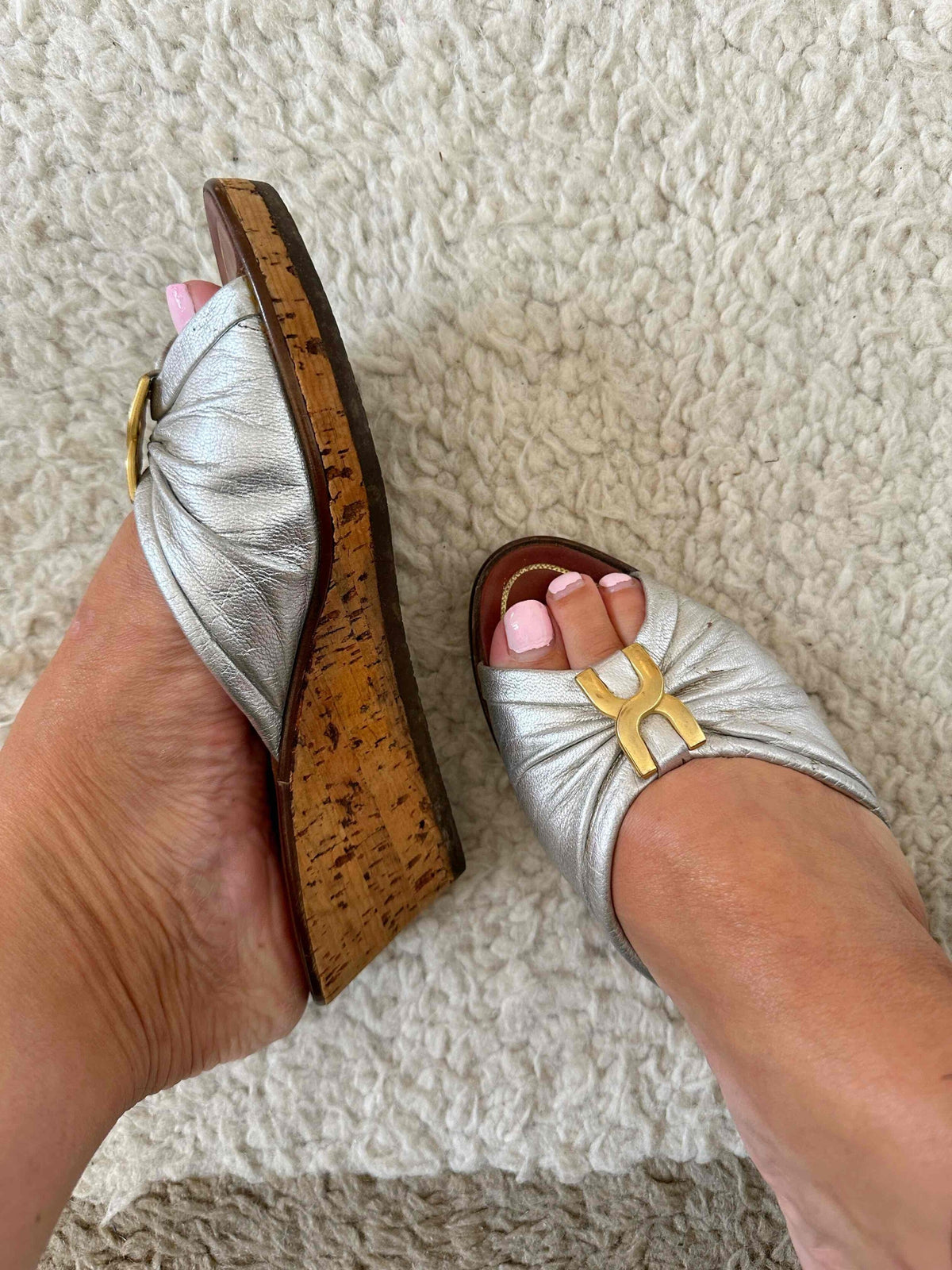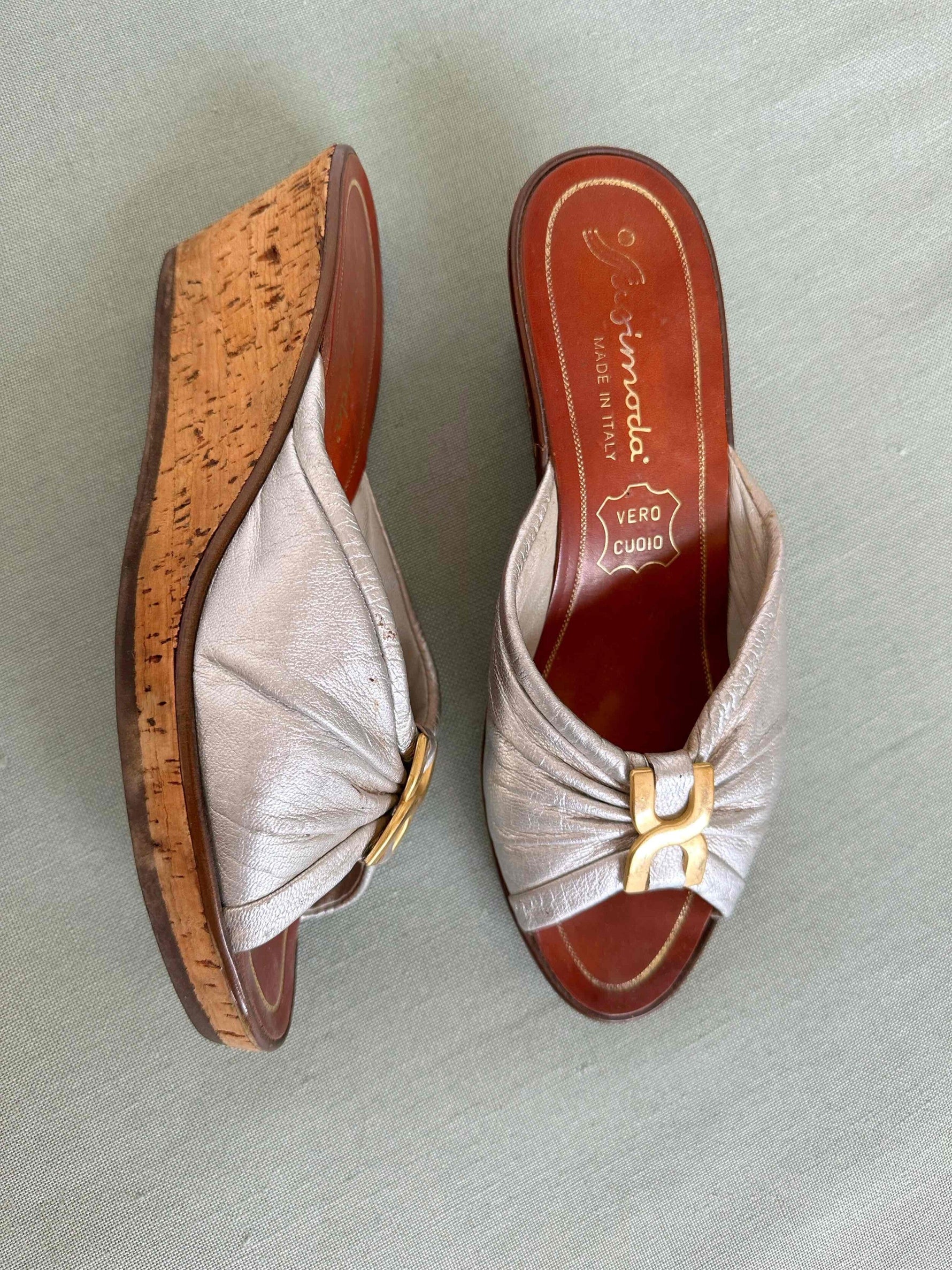 Prix unitaire parMules en cuir argentées, à talons compensées en liège, cuir souple plissé par un bijoux métallique doré, fabriquées en Italie, années 70s, pointure 37, longueur semelle 23,5cm, hauteur talons 5,5cm.