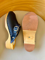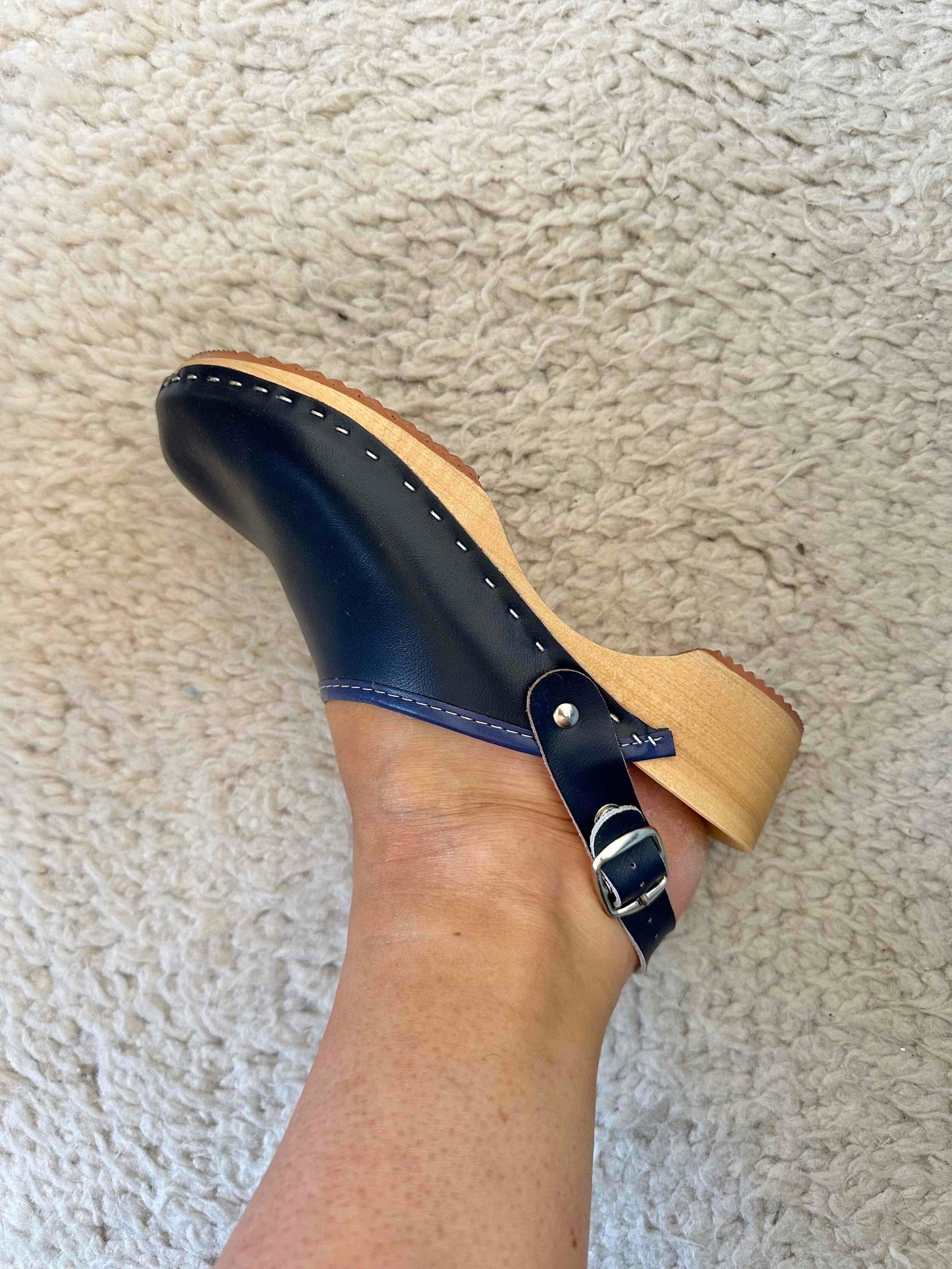 Sabots en cuir bleus marine, bouts fermés, brides cheville a boucle, amovible pour porter avec ou sans, talons en bois, pointure 38, longueur semelle 24,5cm, hauteur des talons 4,5cm.