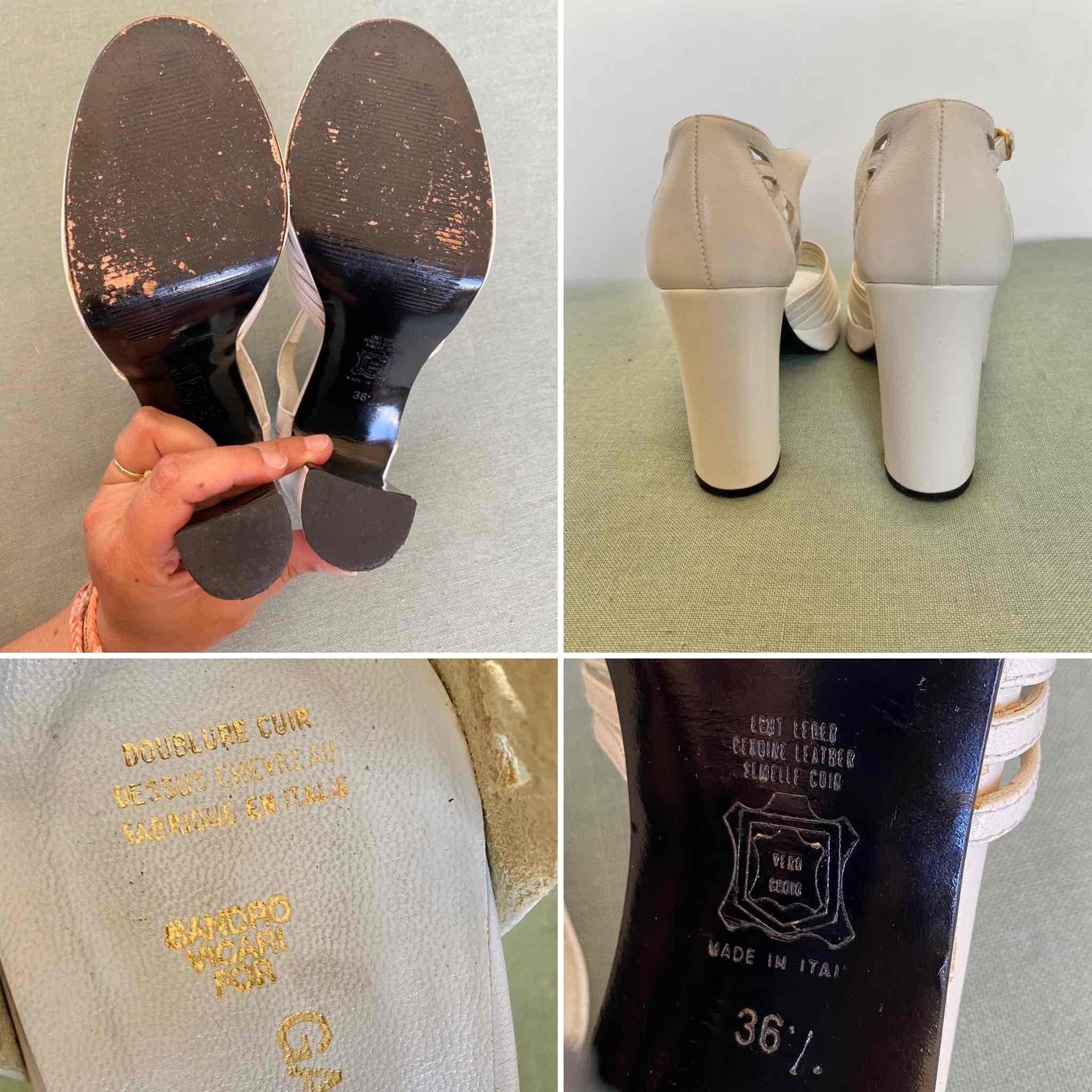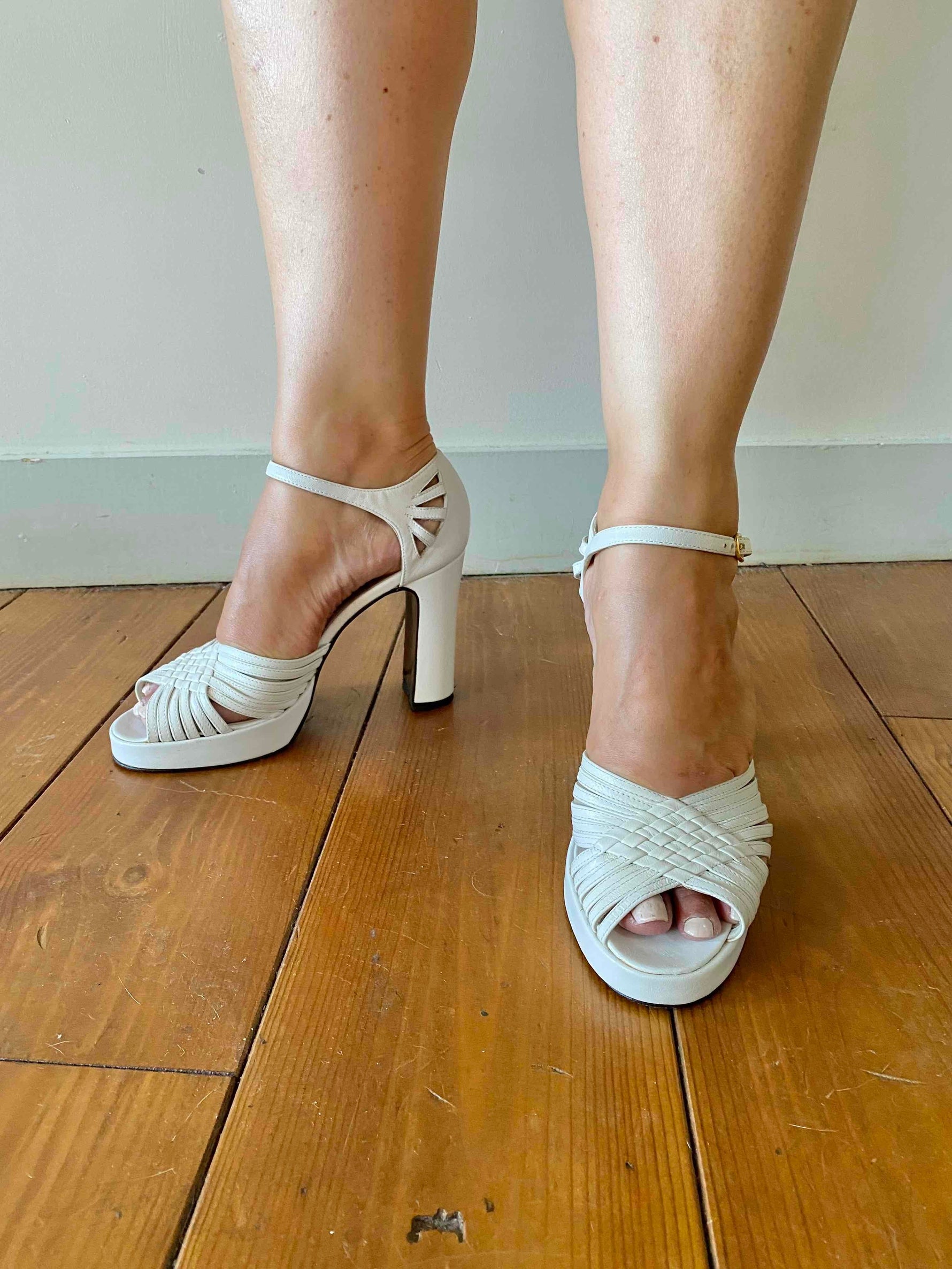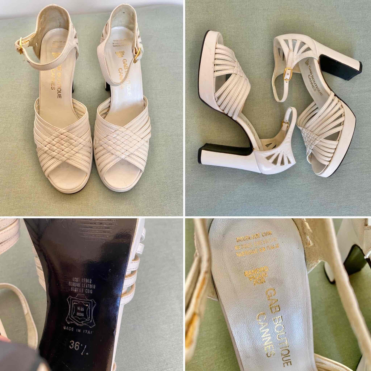 Sandales plateformes 70’s en cuir blanc crème, devant brides croisées et ajourées sur le côté, bride cheville à boucle dorée, fabriquées en Italie, pointure 36 et 36,5, longueur semelle intérieure 24cm / hauteur talons 10cm / hauteur plateforme 1,5cm. Parfait état.