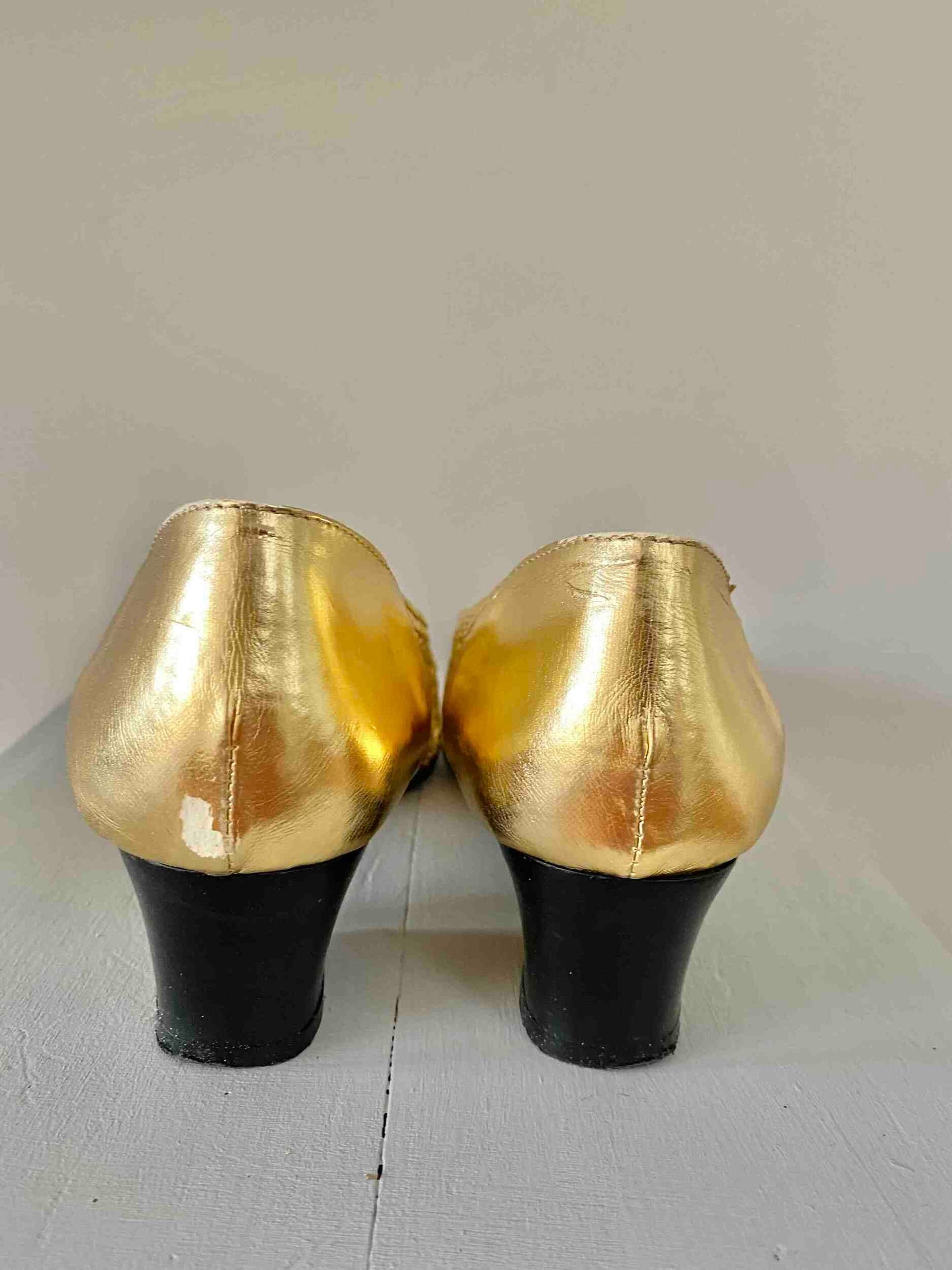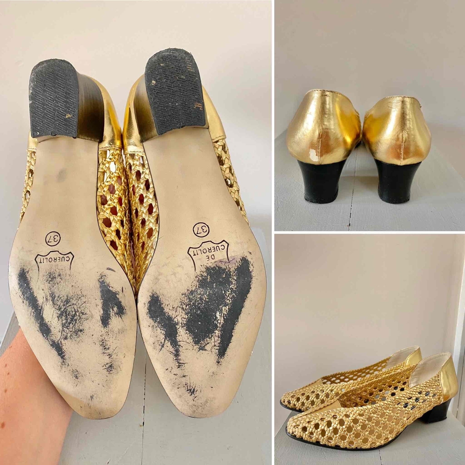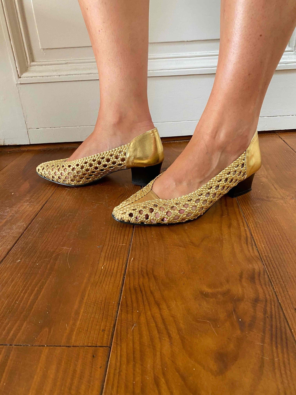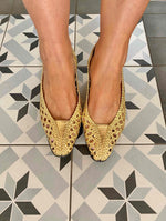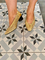 Prix unitaire parSandales en Cuir tressé Doré, ajourées, ballerines à talons décolletées, Samuel Martinez, fabriquées en Espagne, longueur semelle 23,5cm talons 4,5cm, convient à un 37 et 37,5