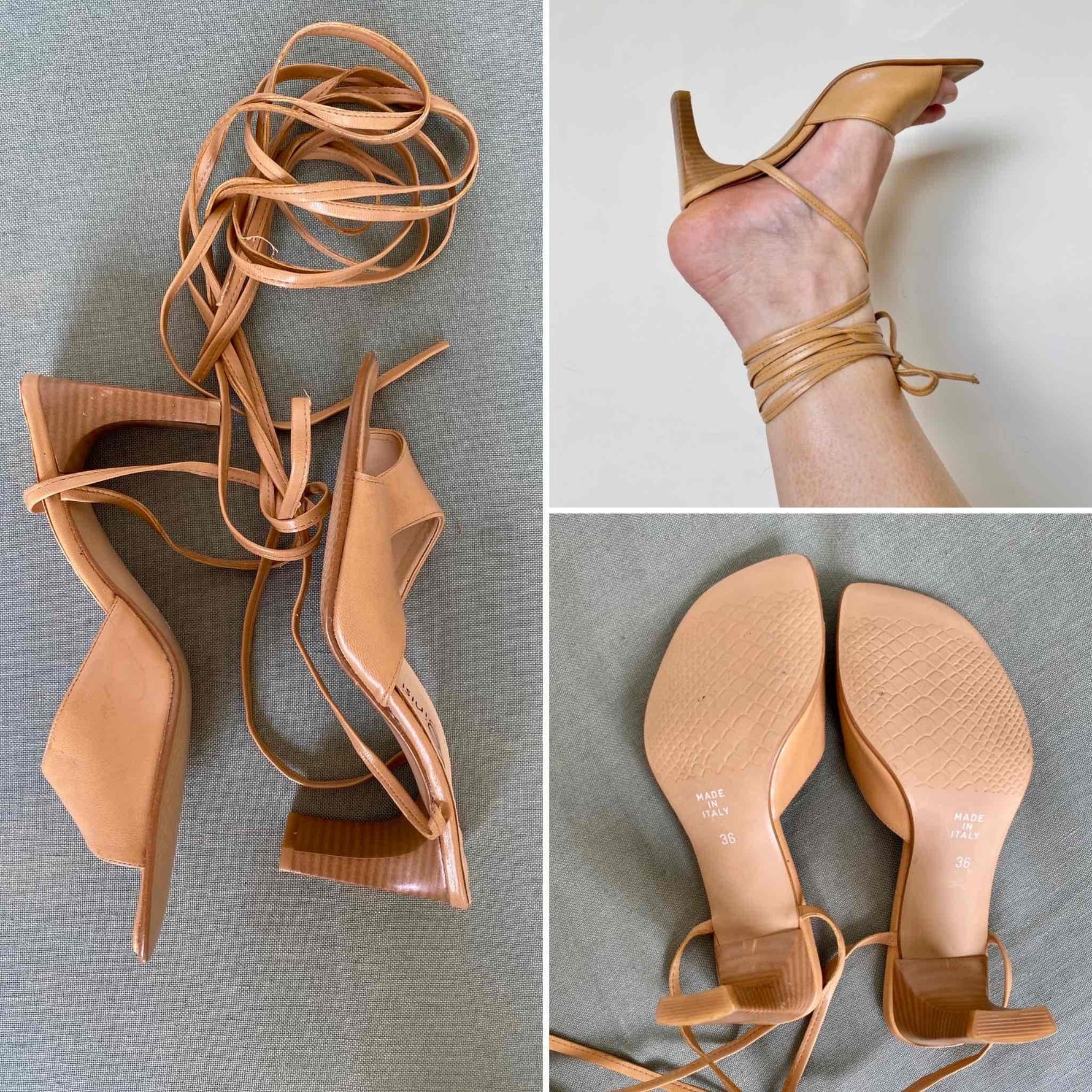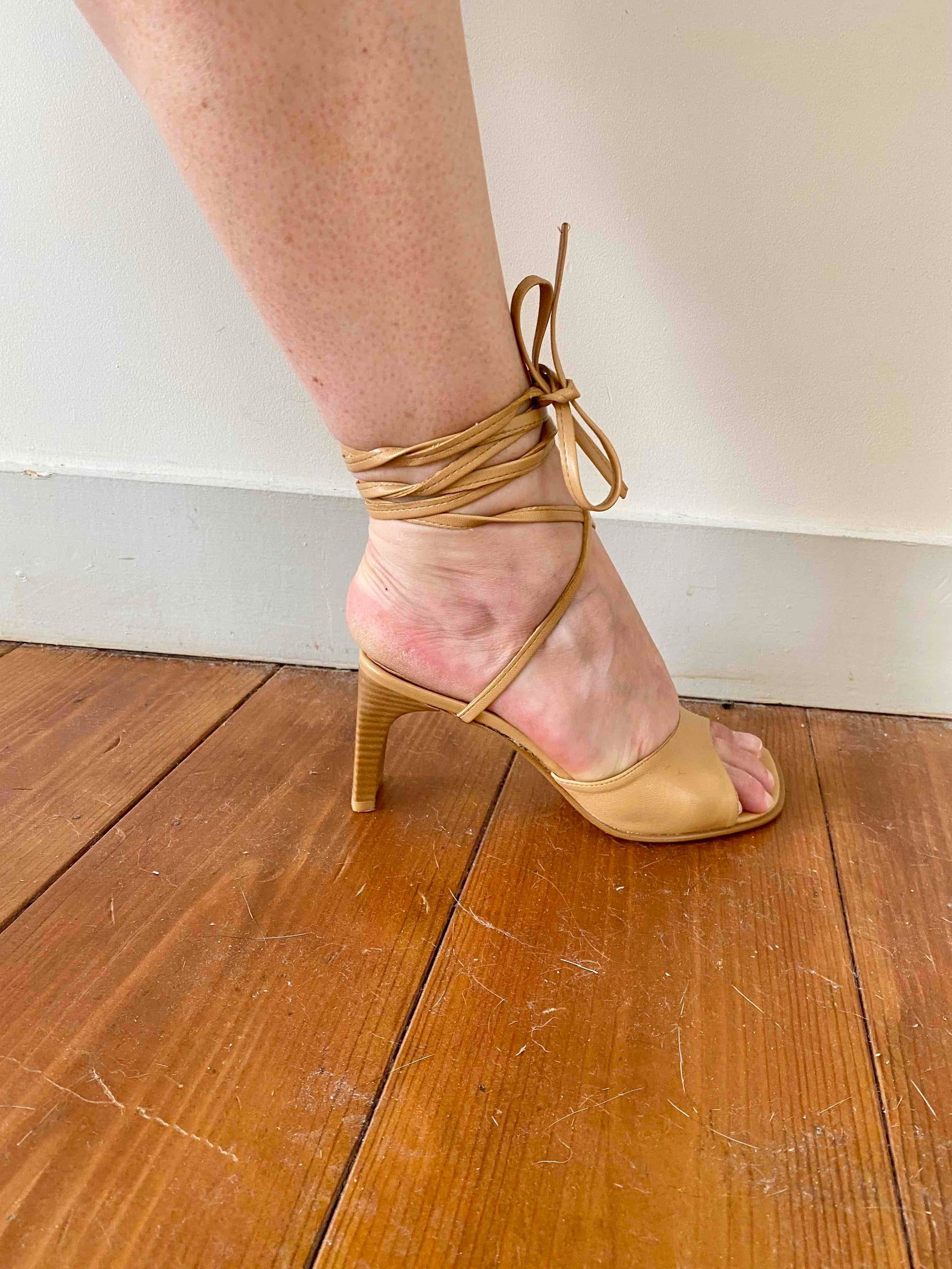 Mules lacées en cuir camel beige, années 90’s, talons droits et bouts carrés, laçage cheville, pointure 36, longueur semelles 23cm, hauteur talons 7cm.
