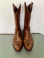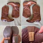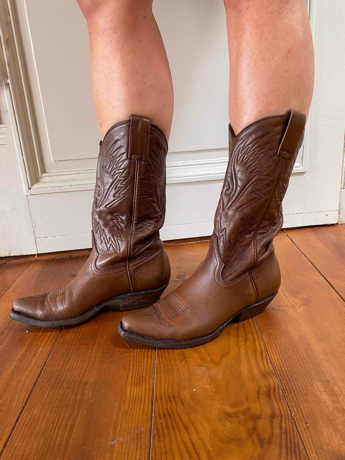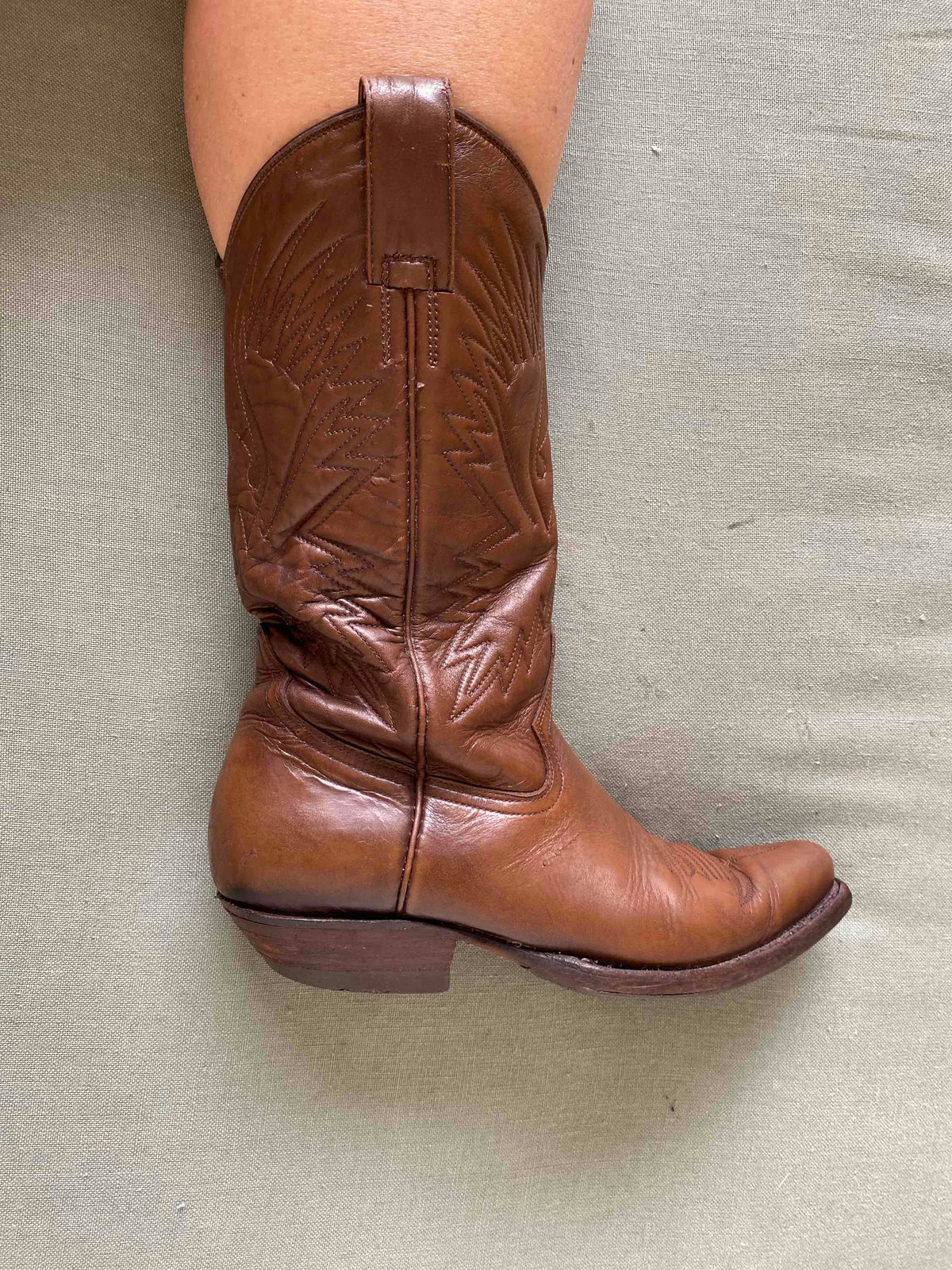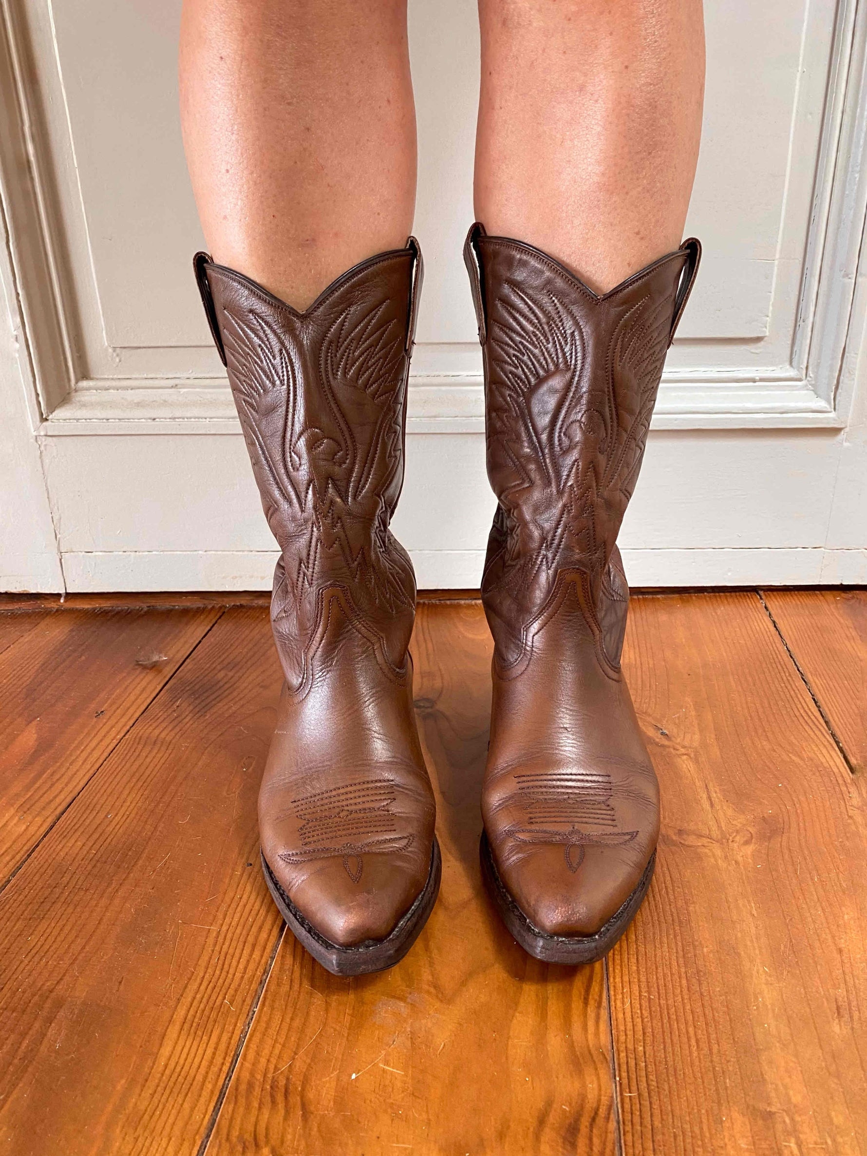 Prix unitaire parSantiags en cuir brun chocolats, motifs brodés ton sur ton, pointure 37, fabriquées au Mexique, années 80’s, talons 3cm, longueur planche 24cm, tour de mollets 68cm, hauteur de tige 30cm.