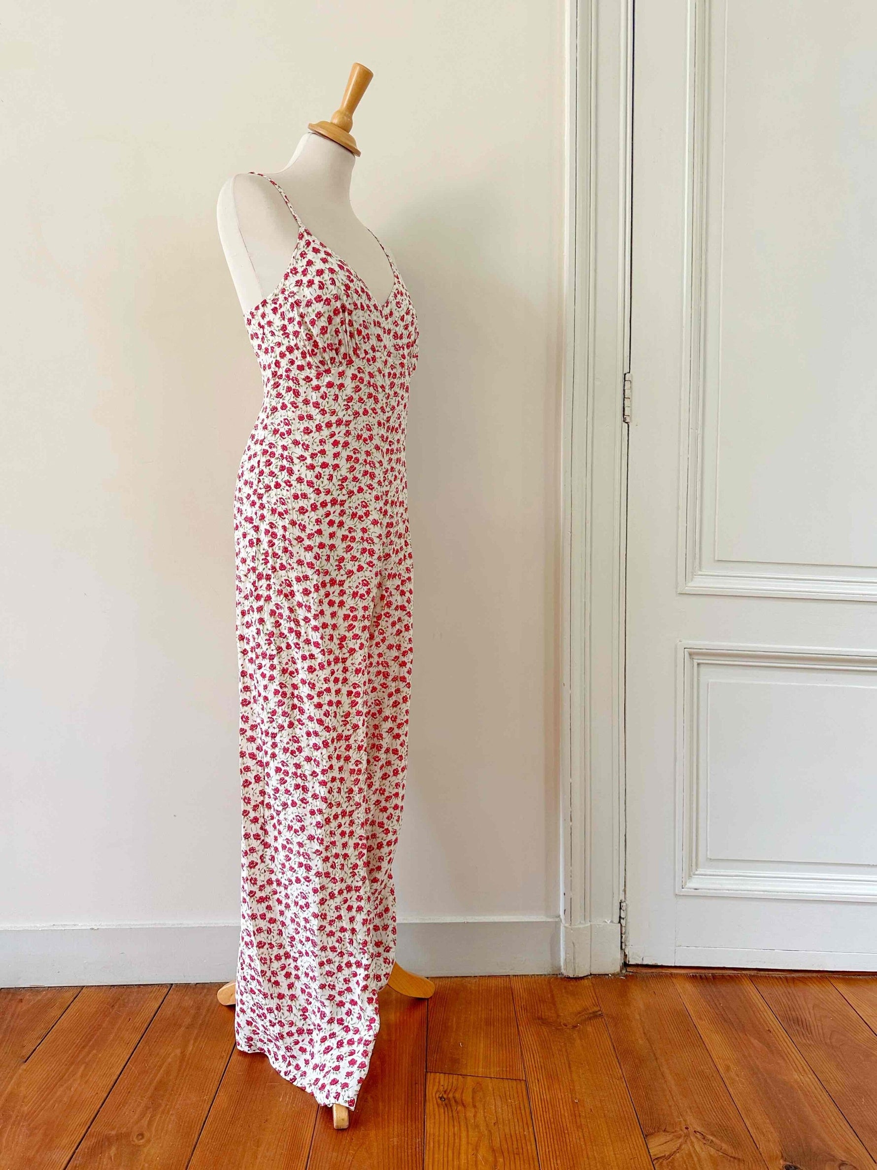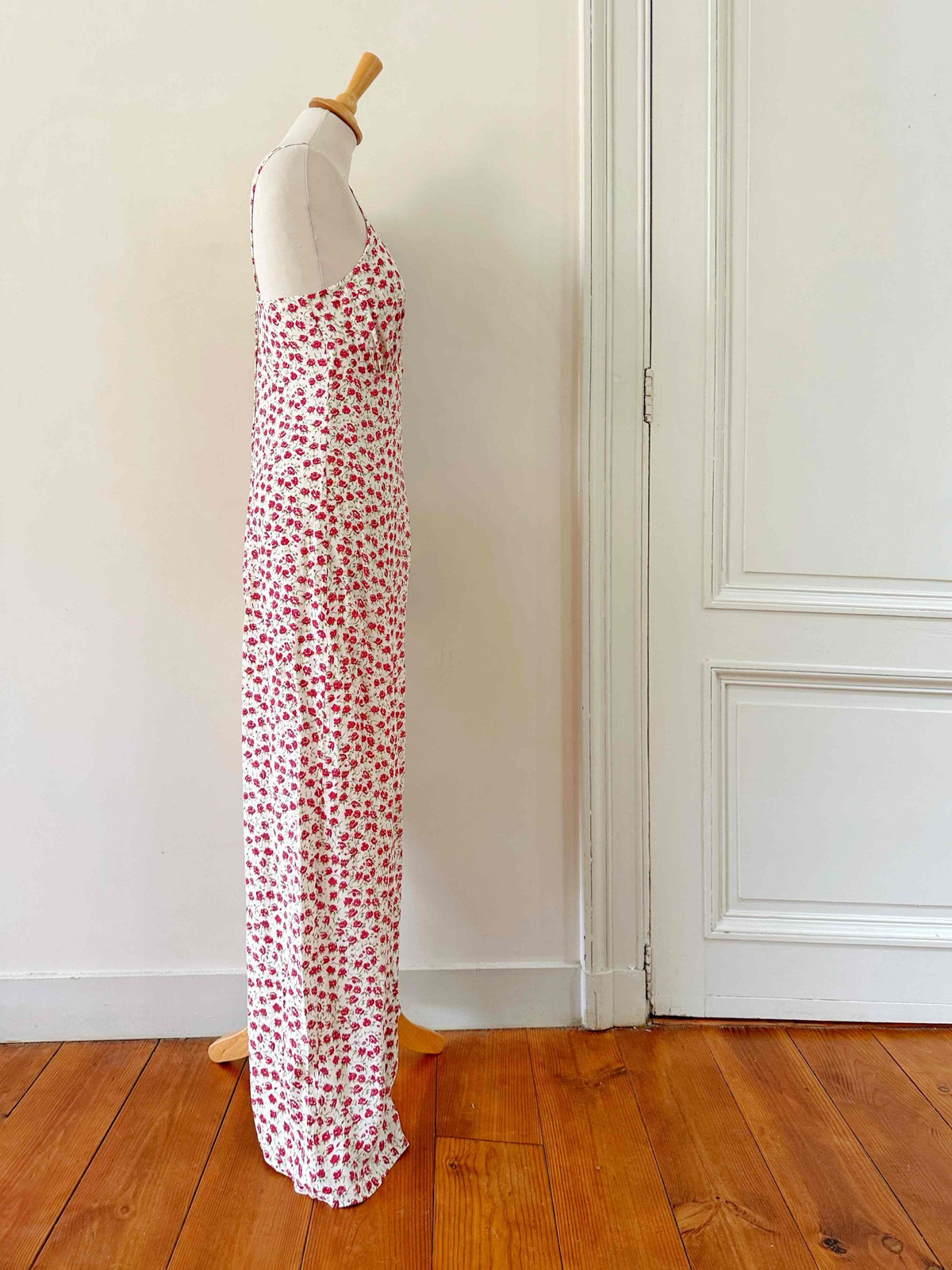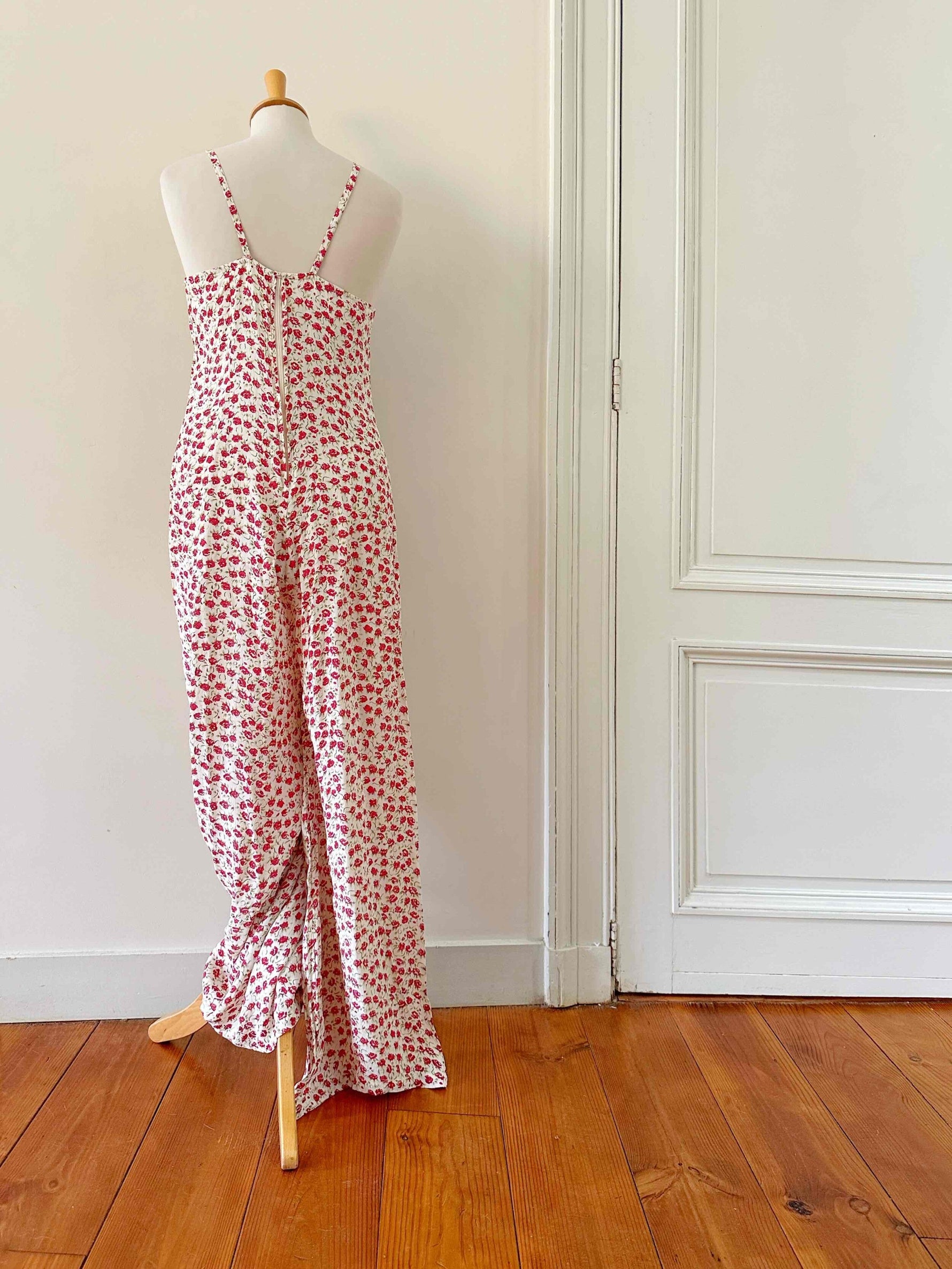 Prix unitaire parCombipantalon à fleurs, en viscose écrues imprimée de petites fleurs rouges et vertes, bretelles spaghettis, poitrine en V froncée, partie pantalon forme palazzo, années 90s, taille 36 portée ici sur un mannequin T36.