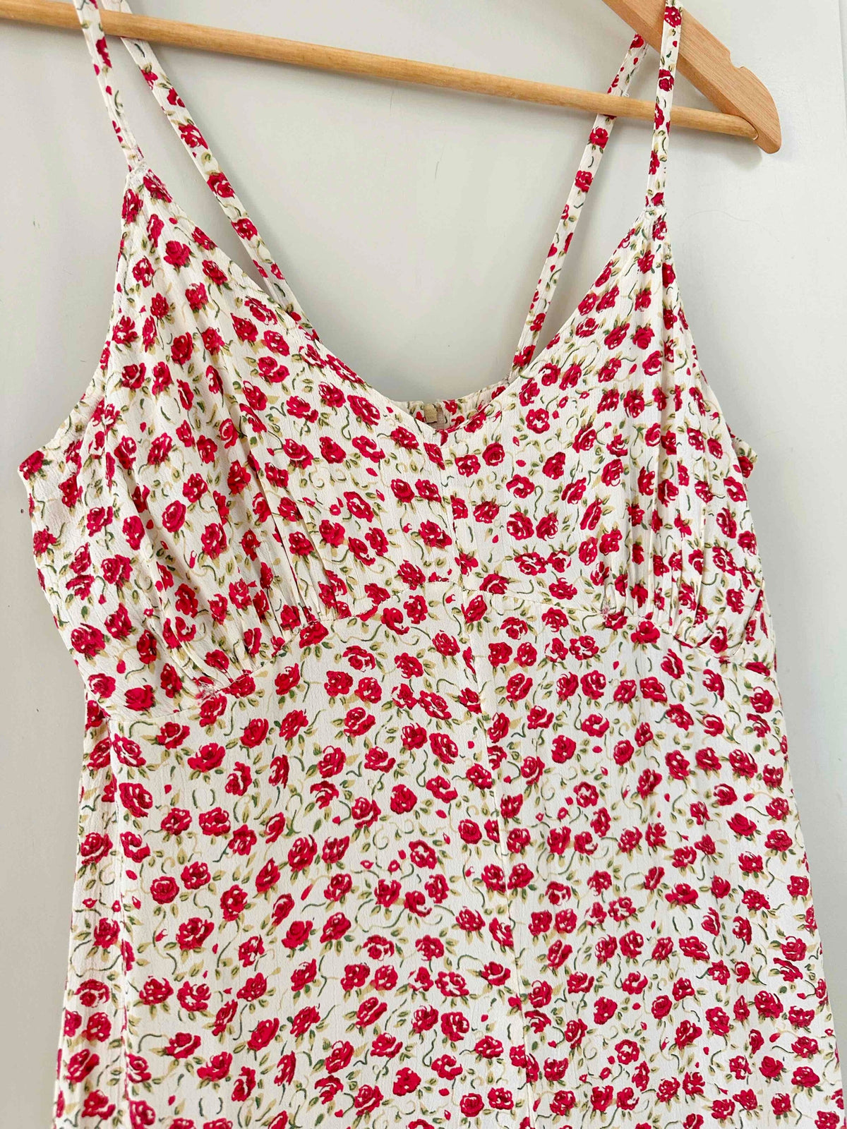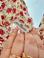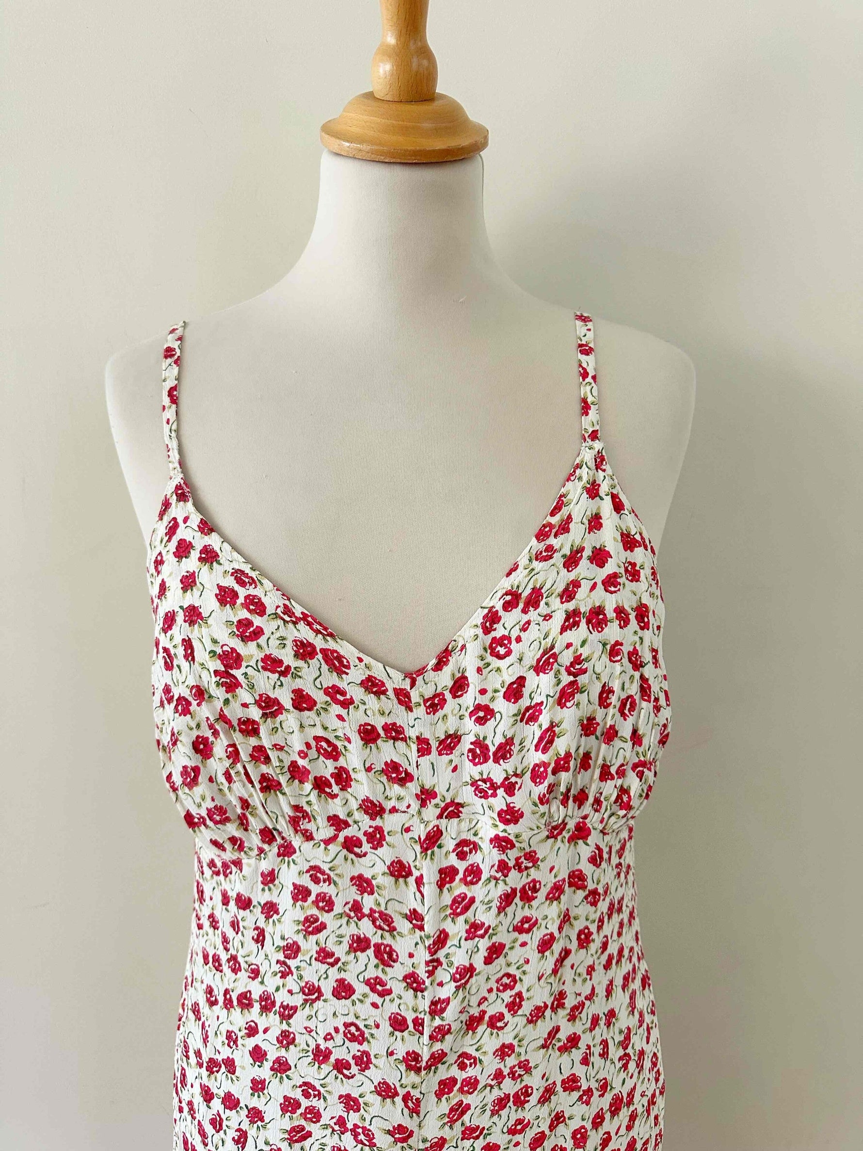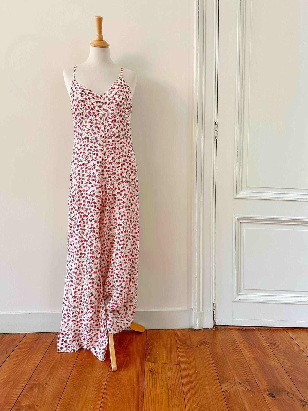 Prix unitaire parCombipantalon à fleurs, en viscose écrues imprimée de petites fleurs rouges et vertes, bretelles spaghettis, poitrine en V froncée, partie pantalon forme palazzo, années 90s, taille 36 portée ici sur un mannequin T36.