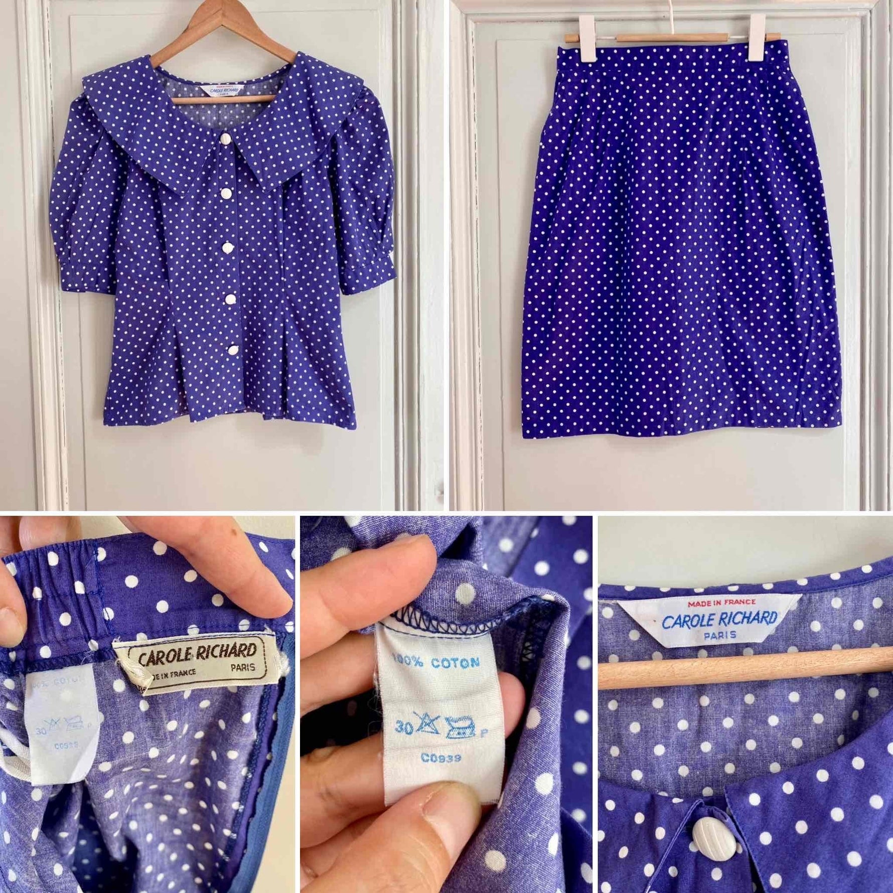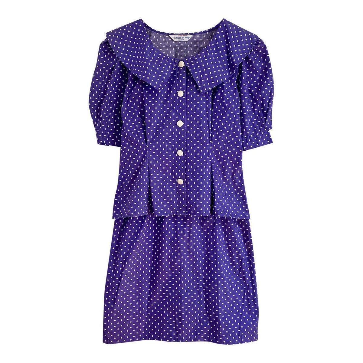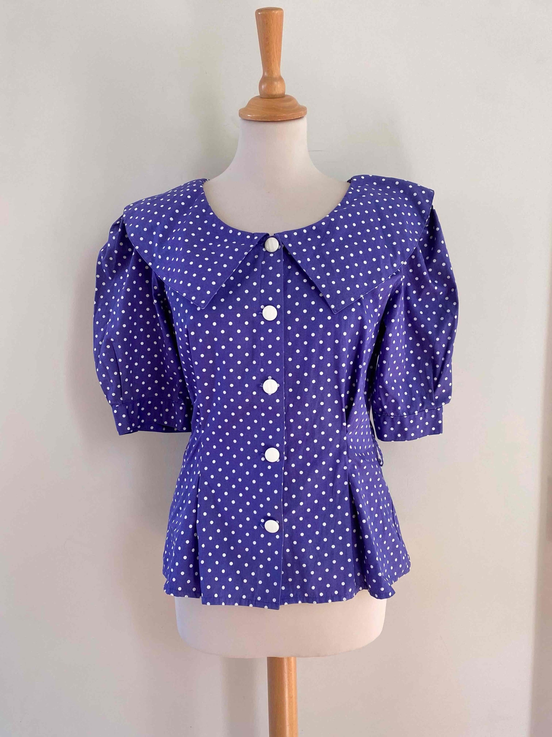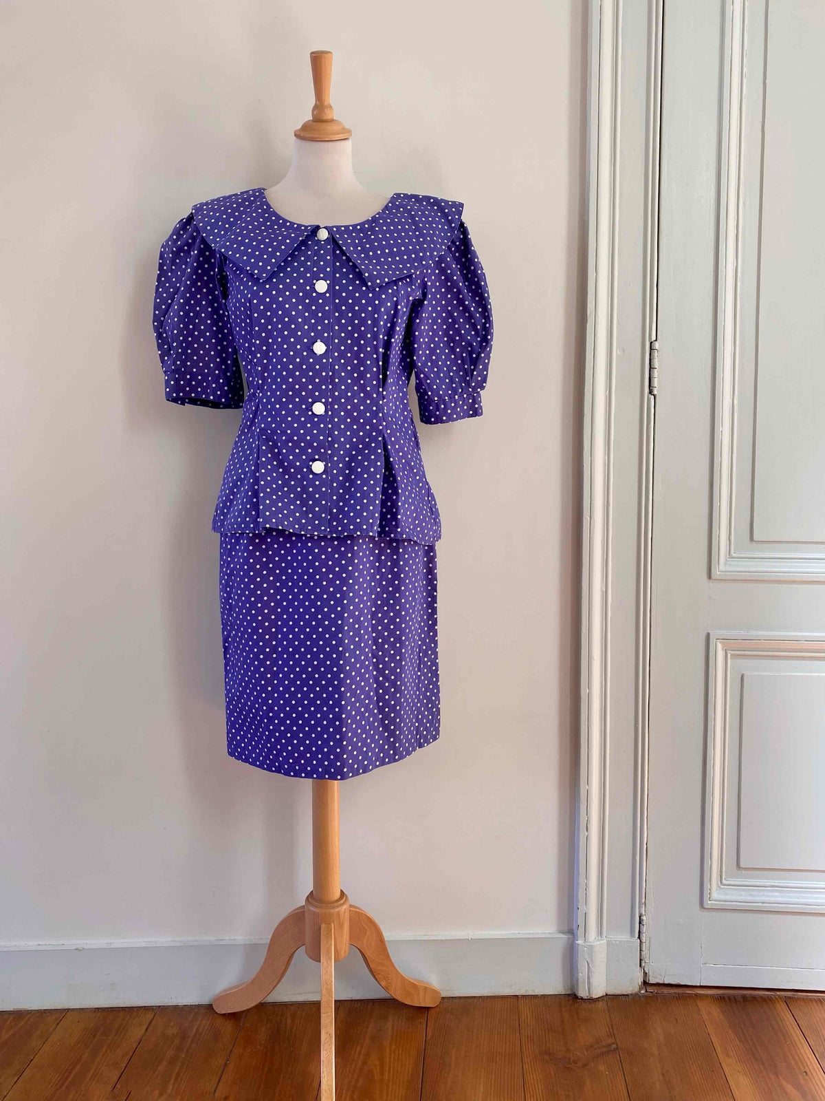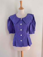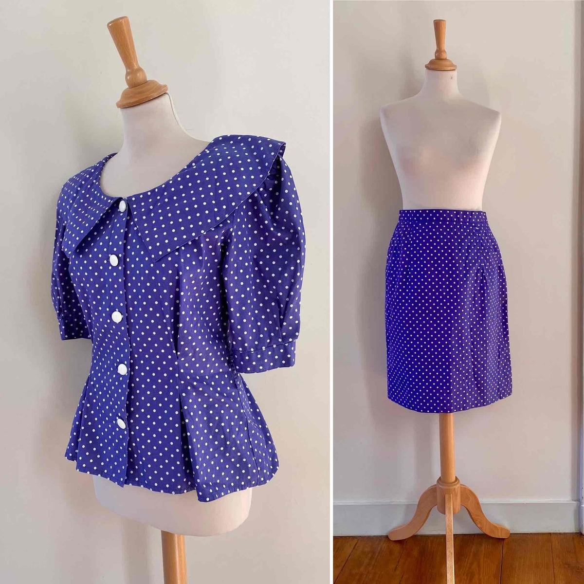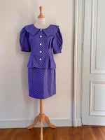 Prix unitaire parEnsemble blouse et jupe à pois en coton bleu violet à pois blancs, blouse à grand col Peter Pan, taille cintrée et manches ballons, mini jupe moulante, fabriquée en France, taille 36 portée ici sur un mannequin T36. Mesure Blouse : épaules 36cm / aisselles 44cm / longueur 58cm. Mesure jupe : taille 34cm / hanches 45cm / longueur 55cm.