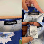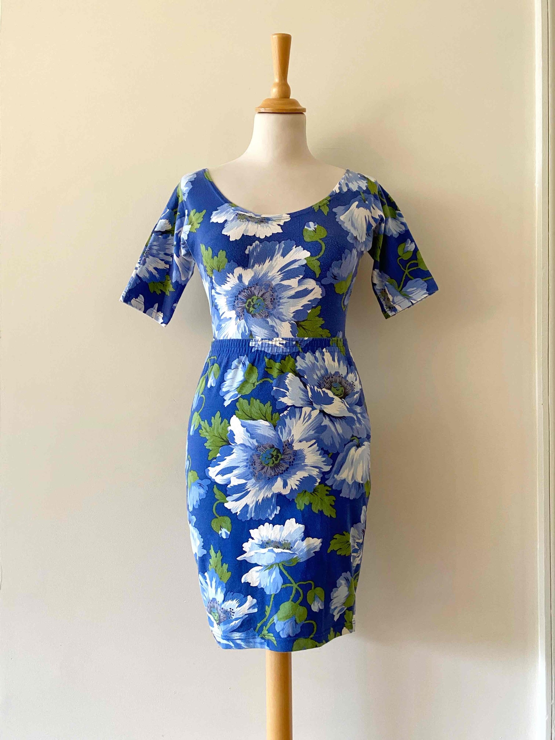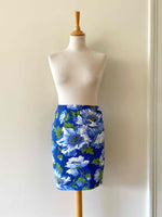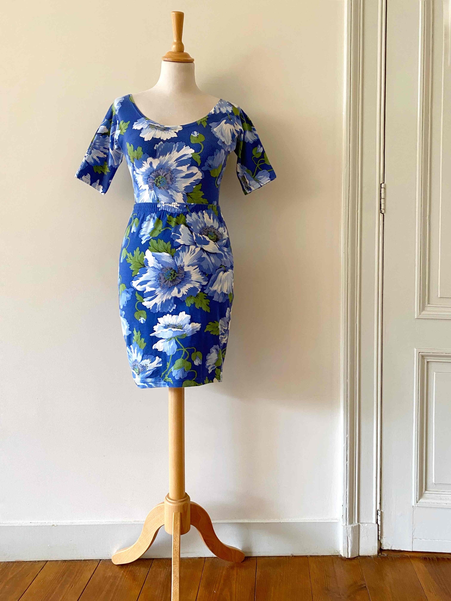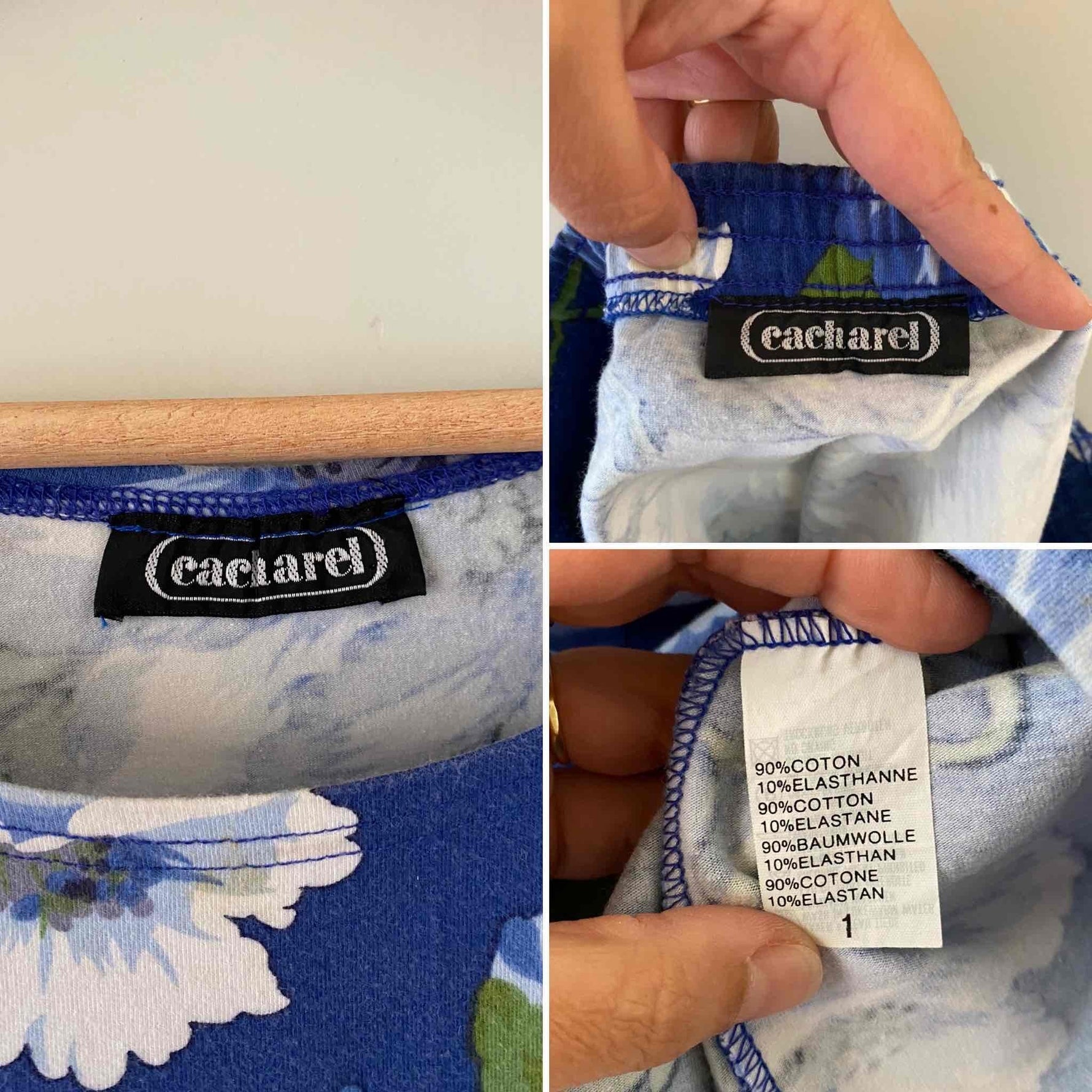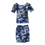 Prix unitaire parEnsemble Cacharel jupe et top en jersey de coton élasthanne, imprimé fleurs bleues et vertes, top à encolure danseuse et manches coudes, jupe tube taille élastique, taille 34/36 porté ici sur un mannequin T36, mesures top : aisselles 40cm / longueur 58cm, mesures jupe : longueur 48cm.