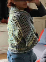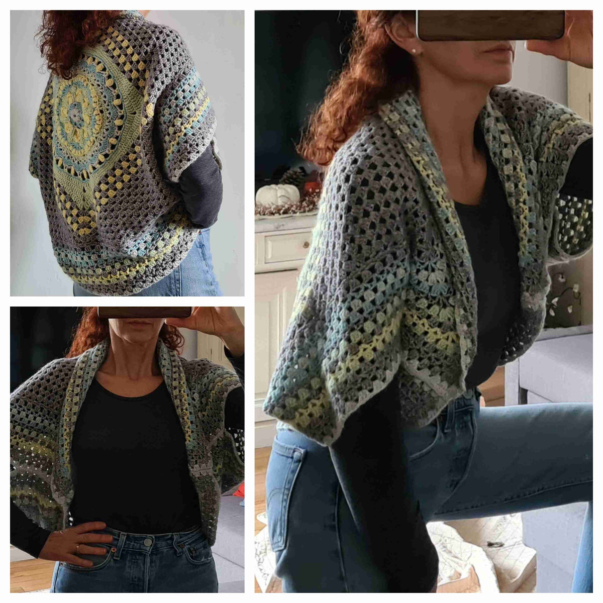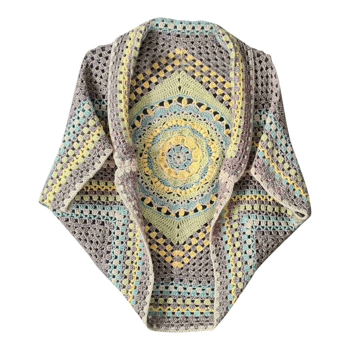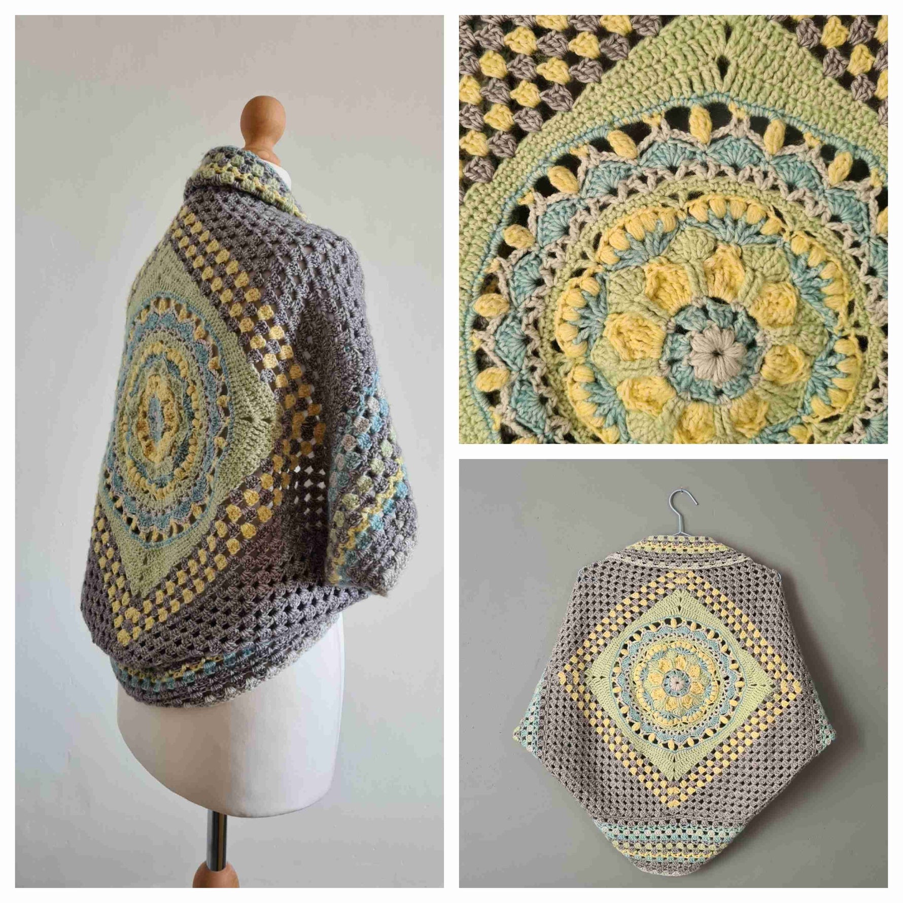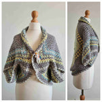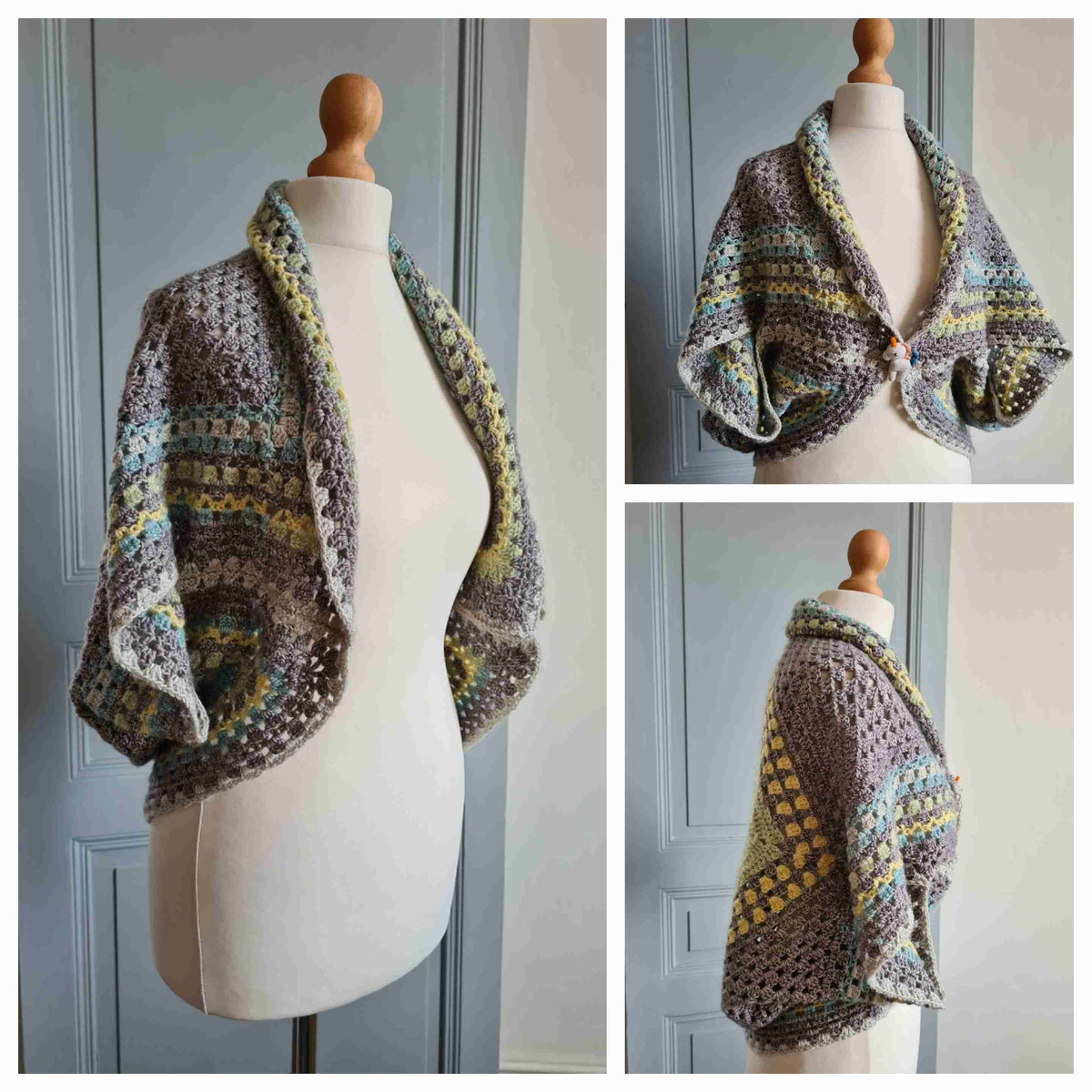 Châle en crochet multicolore pastel, gris, bleu, vert et jaune. A enfiler par les bras. Taille unique. Porté sur les photos par une taille 36. Pièce unique crochetée à la main. (broche non fournie)